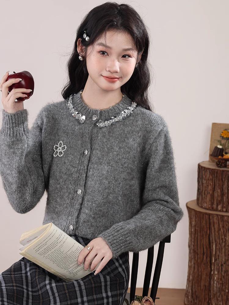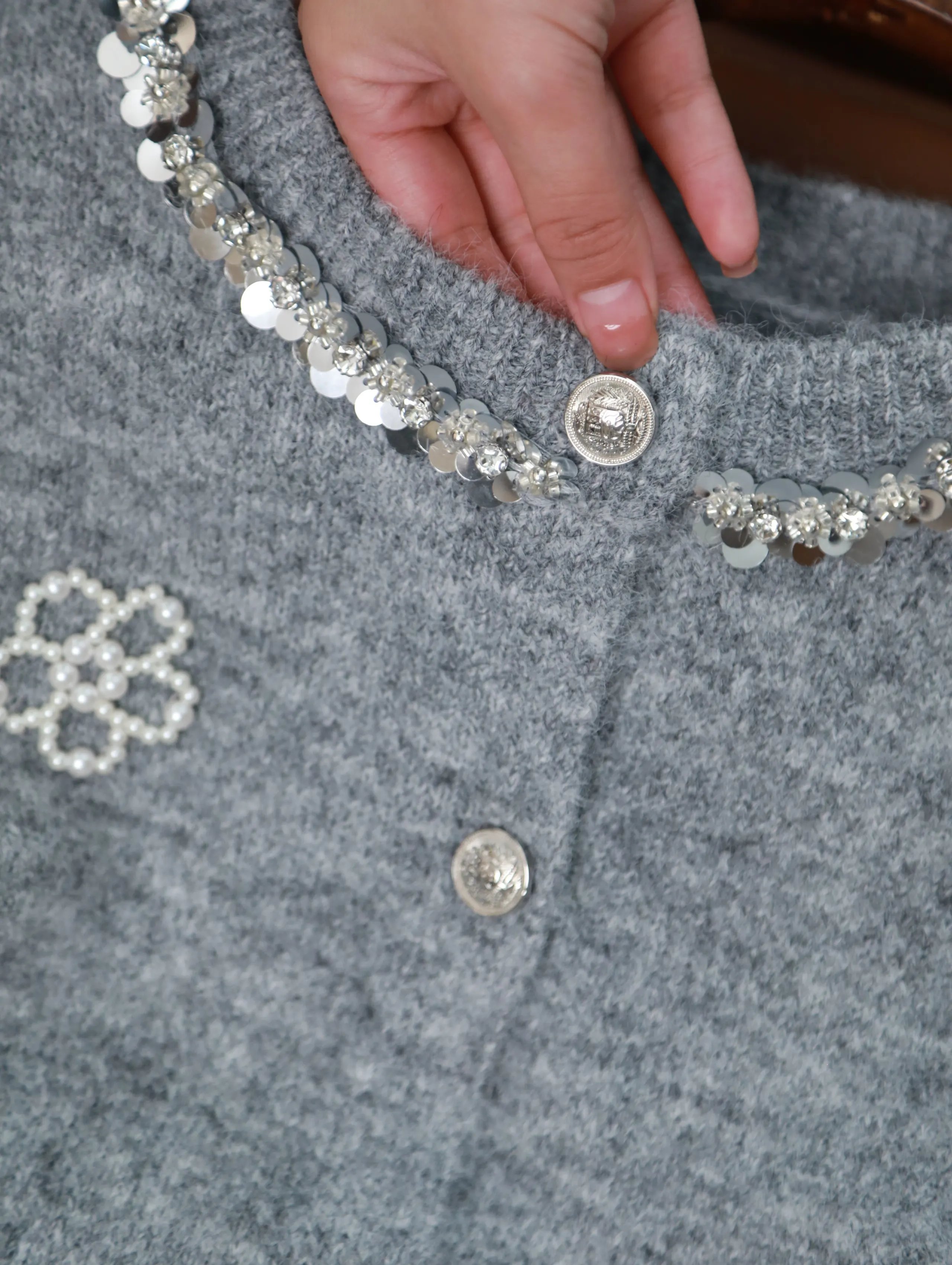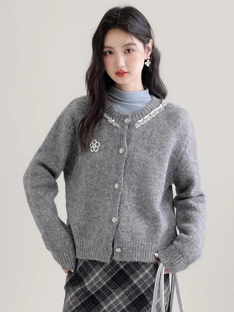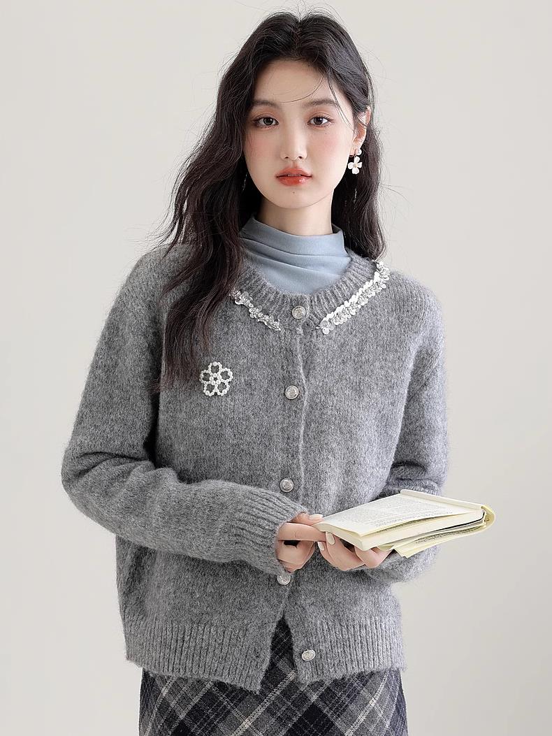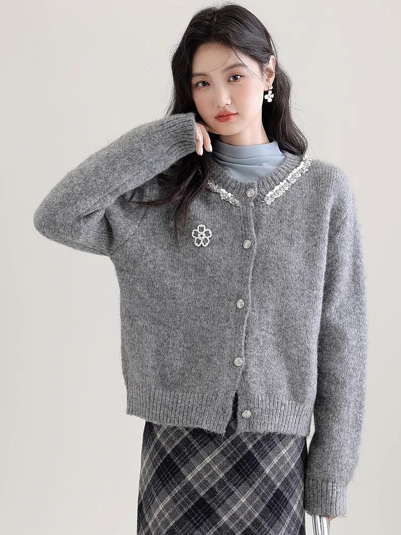 【商品品名】慵懒风珍珠花朵圆领开衫