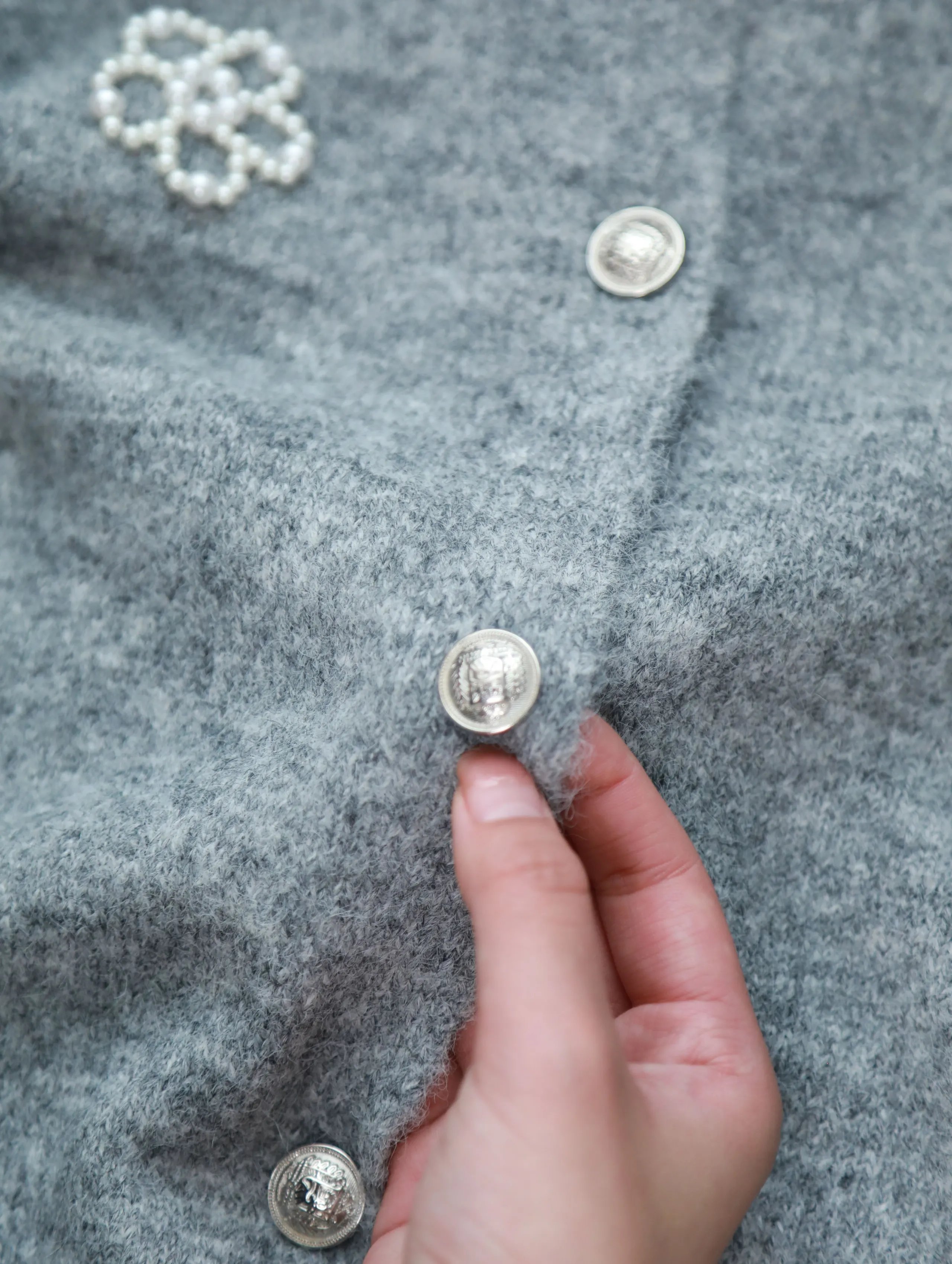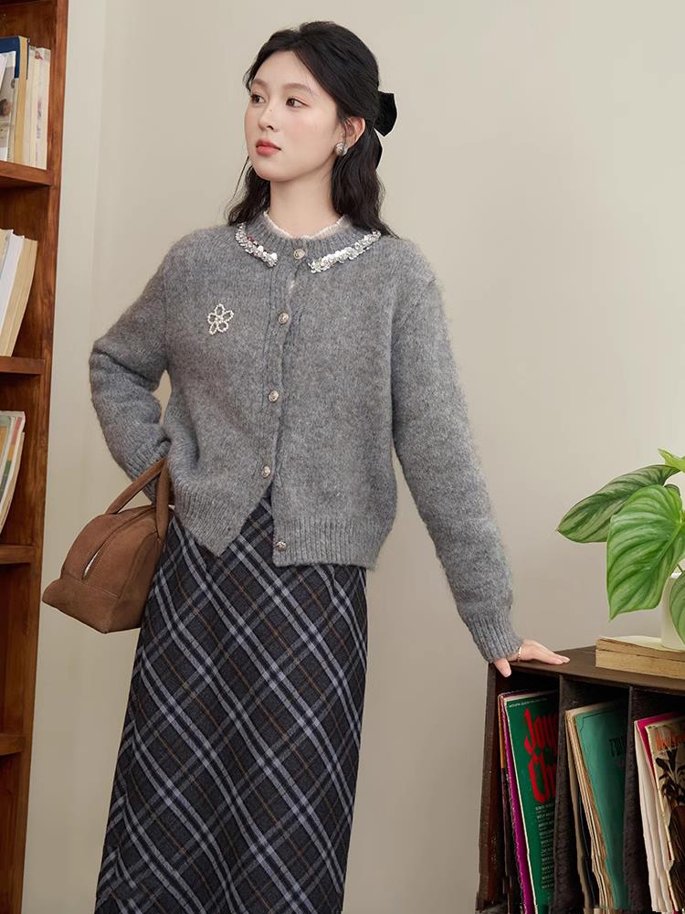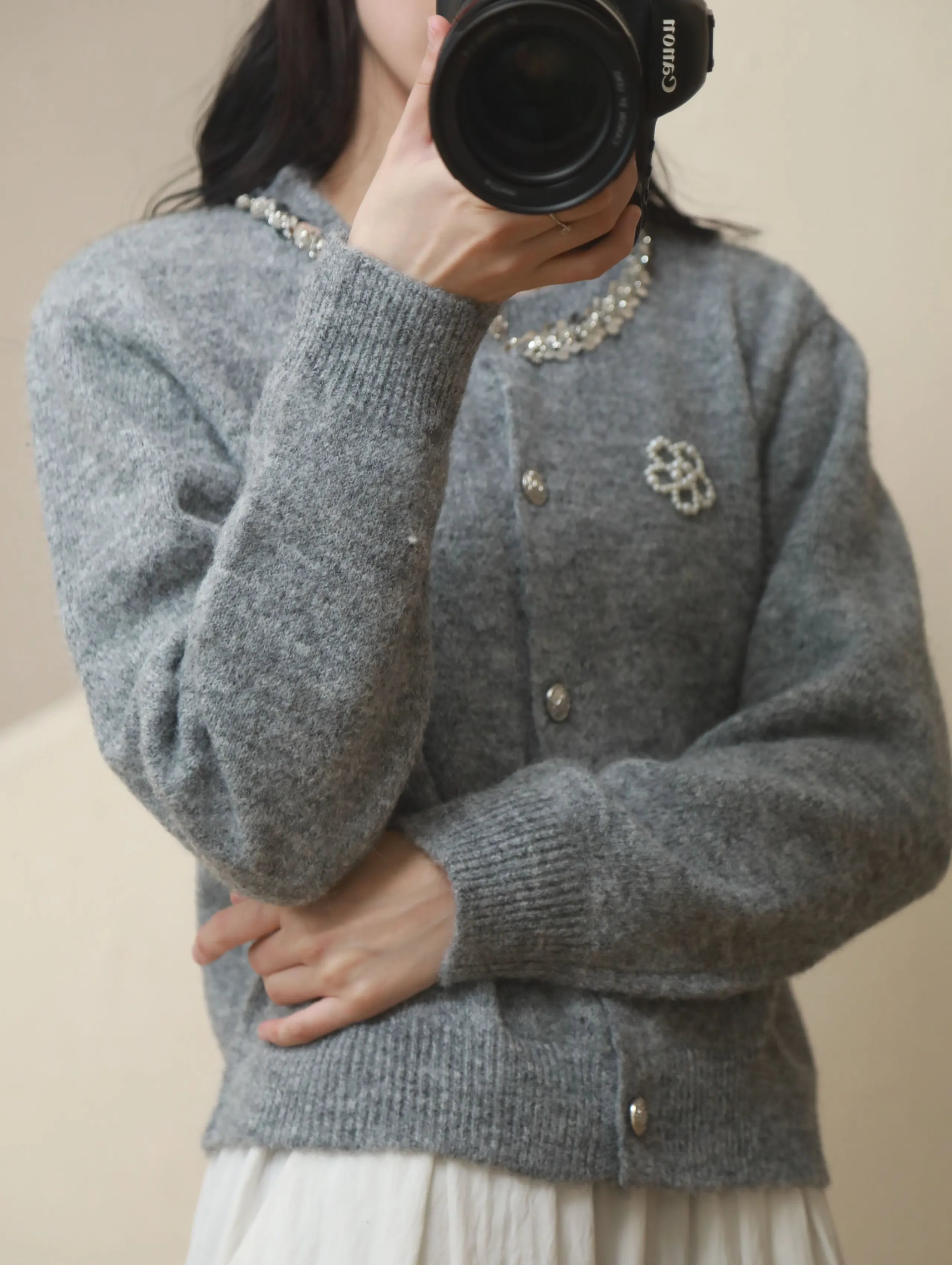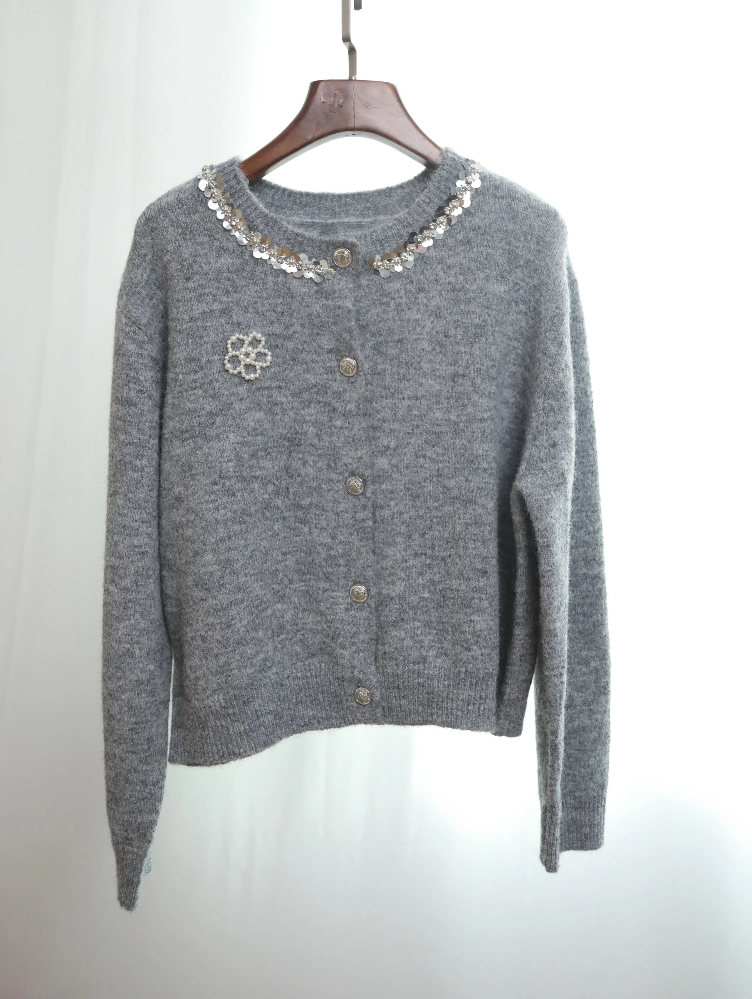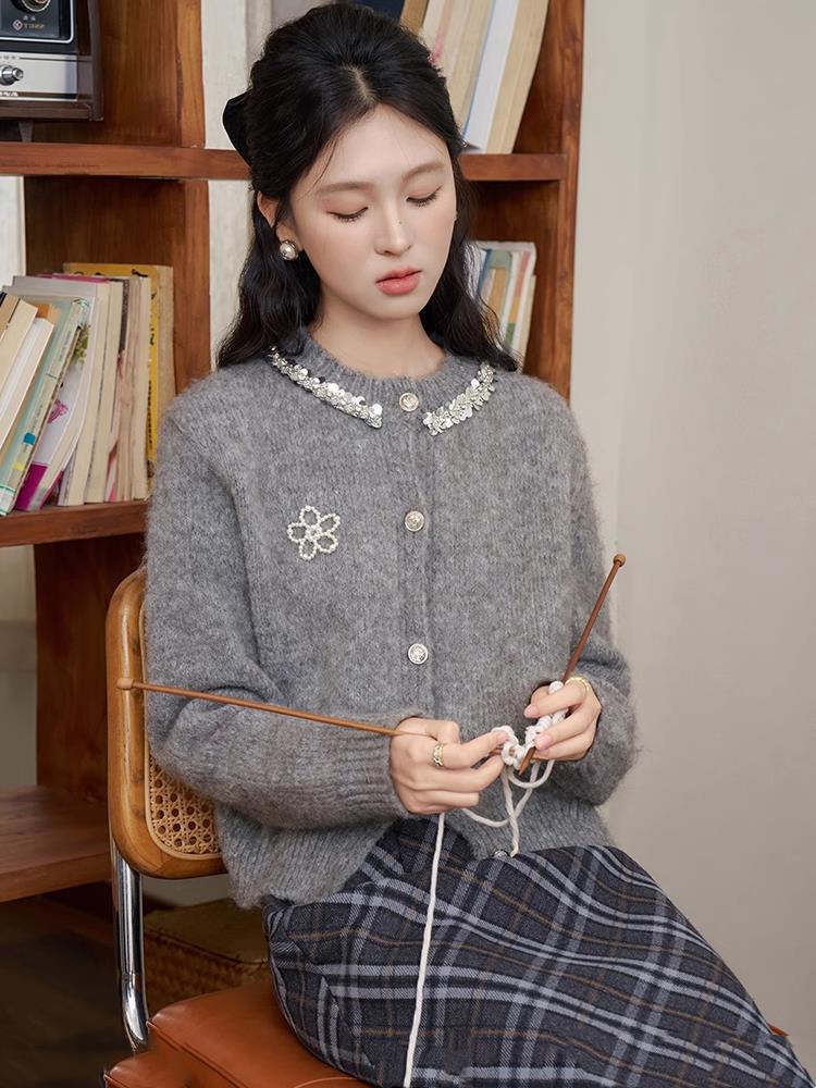 【商品品名】慵懒风珍珠花朵圆领开衫