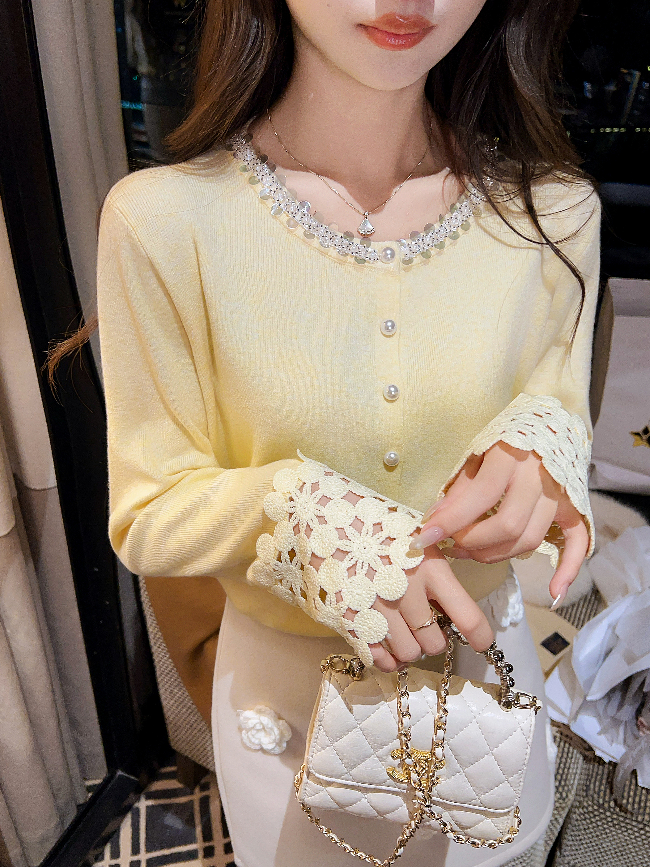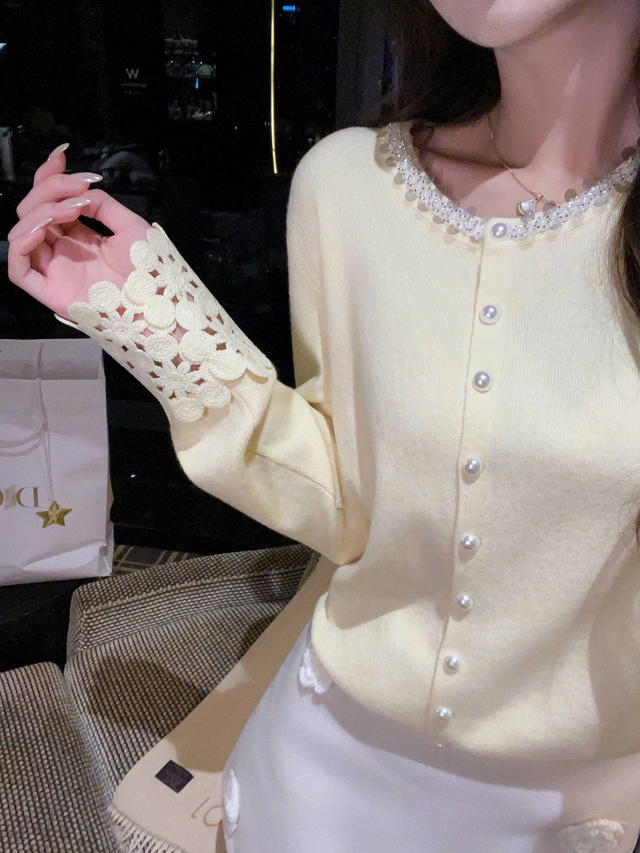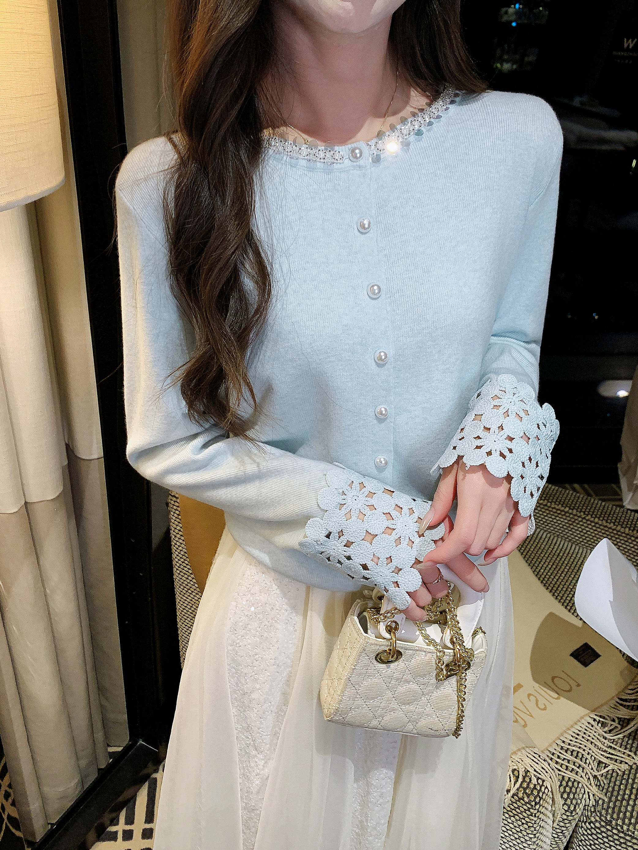 张心子【miu系千金】miu系减龄少女镂空手袖亮片开衫上衣 U2602021