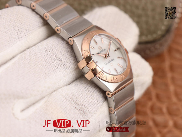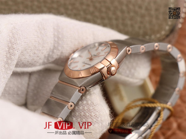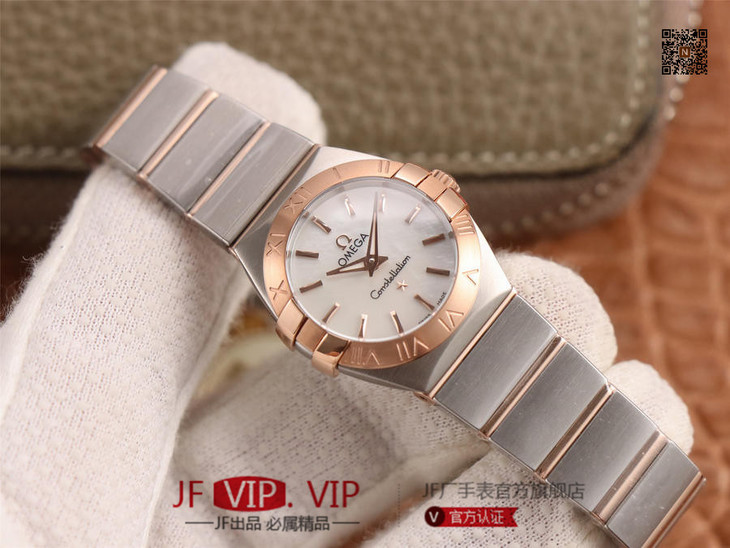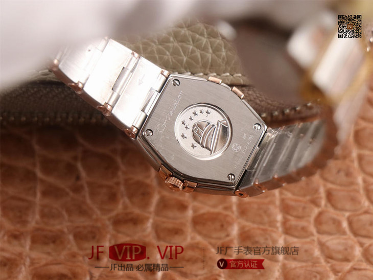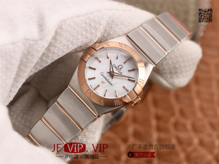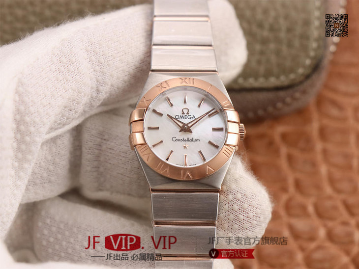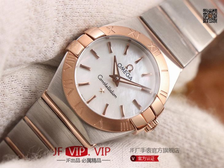 8848F欧米茄星座系列,表径24mm,搭载原版欧米茄1376专用机芯,字面采用一级珍珠贝母和南非真钻制成,表带18K金盾牌,女士腕表,精钢表带,自动机械机芯
