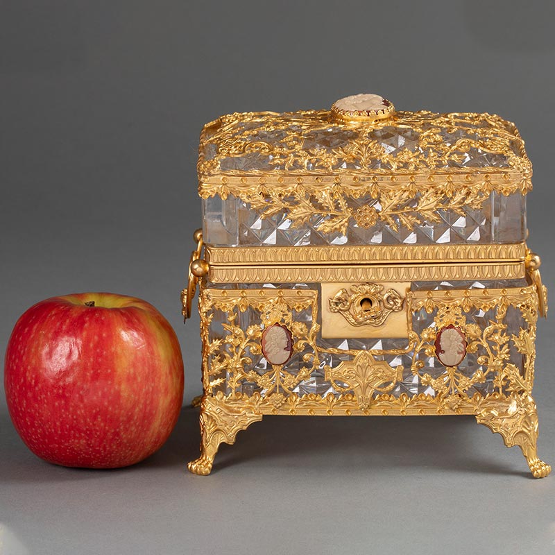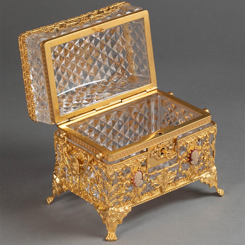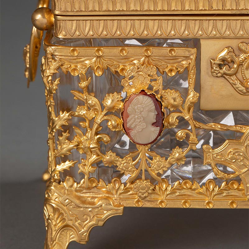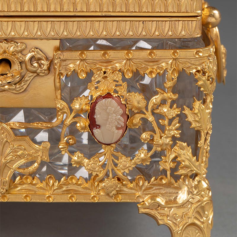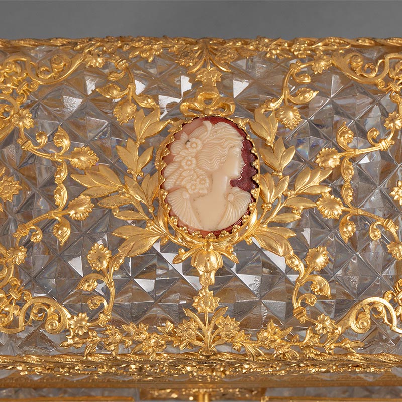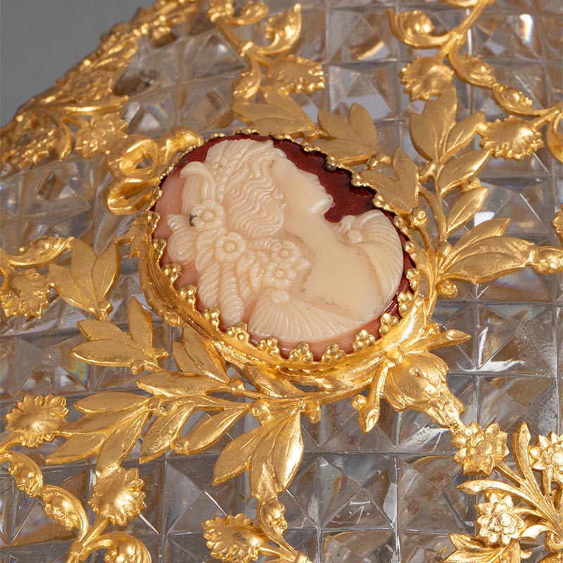 19世纪末法国出品路易十六风格自然花叶主题铜鎏金精雕嵌古典女子肖像卡梅奥装饰水晶珍宝盒