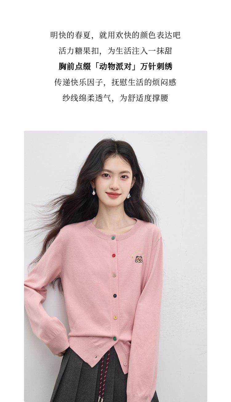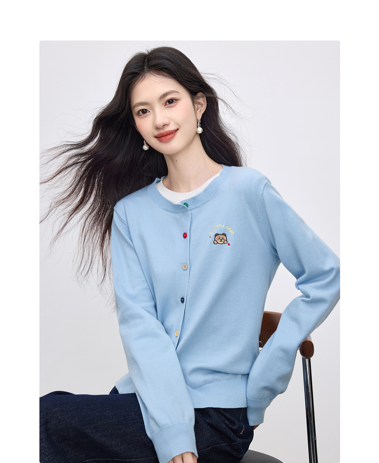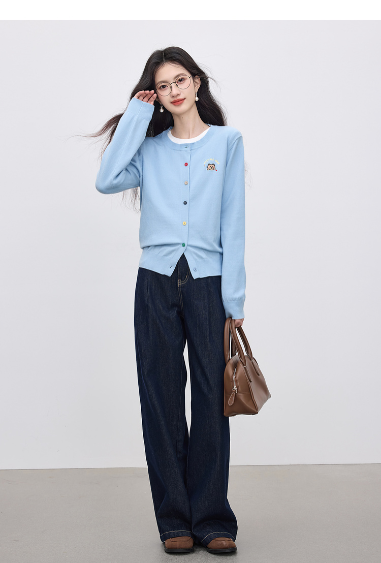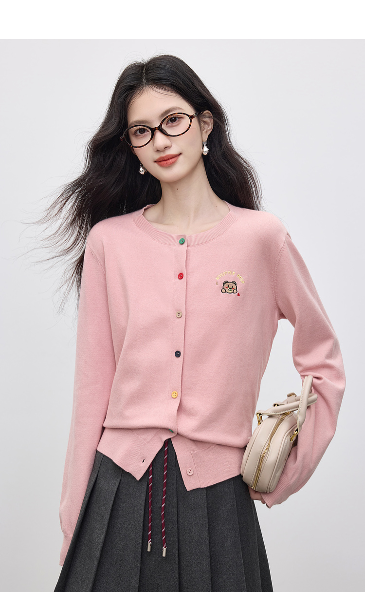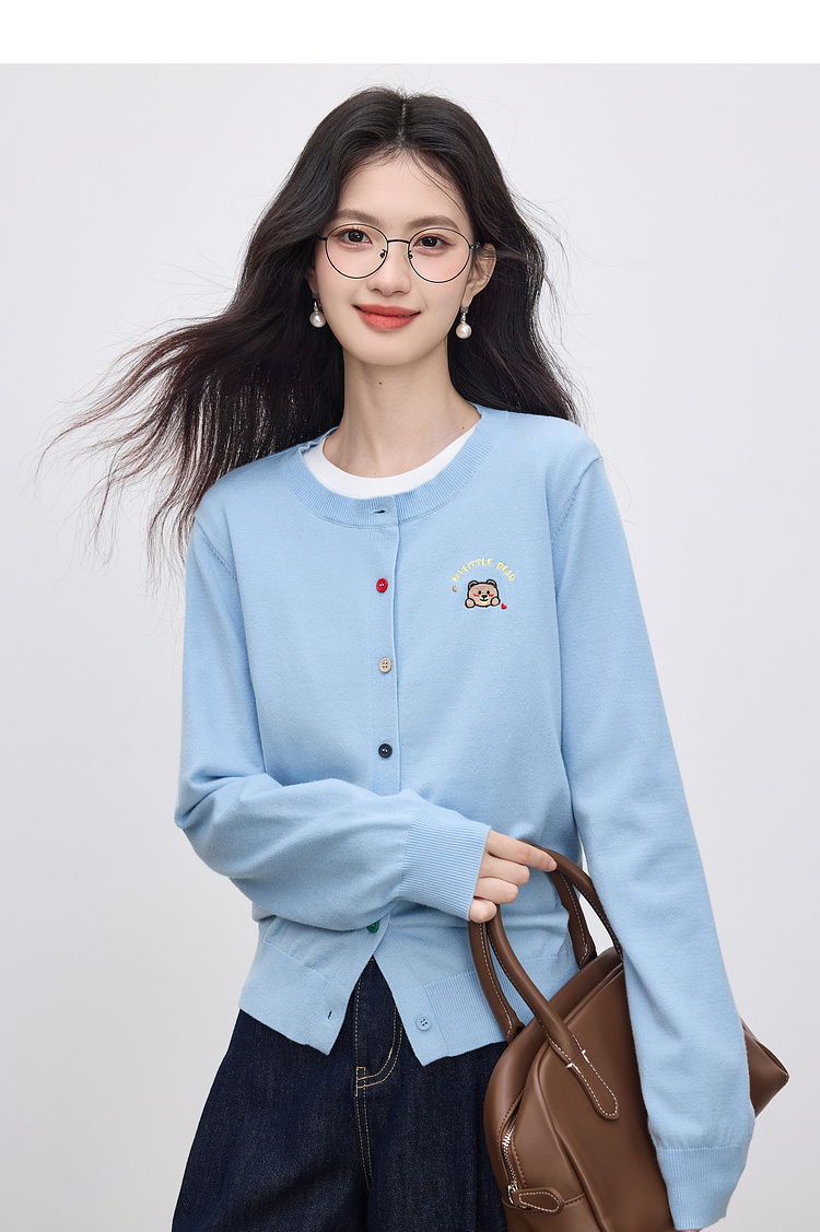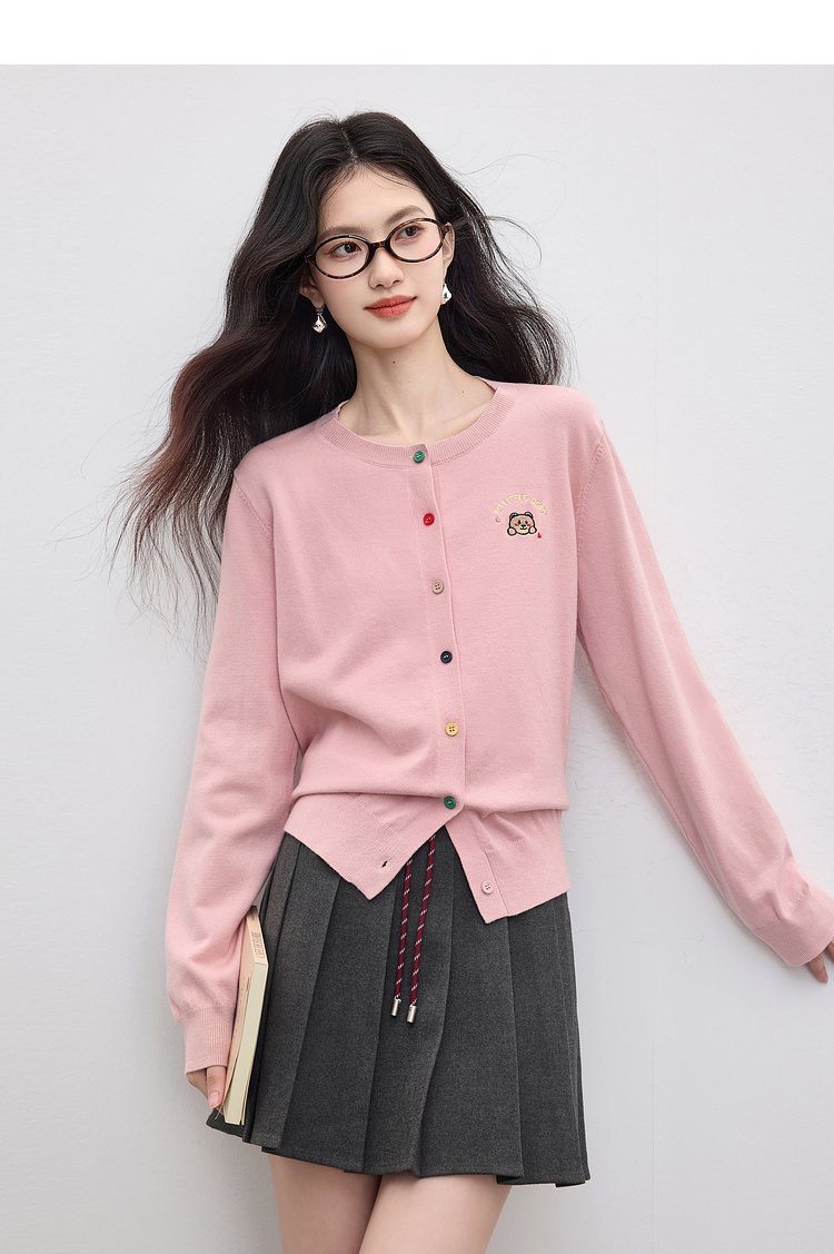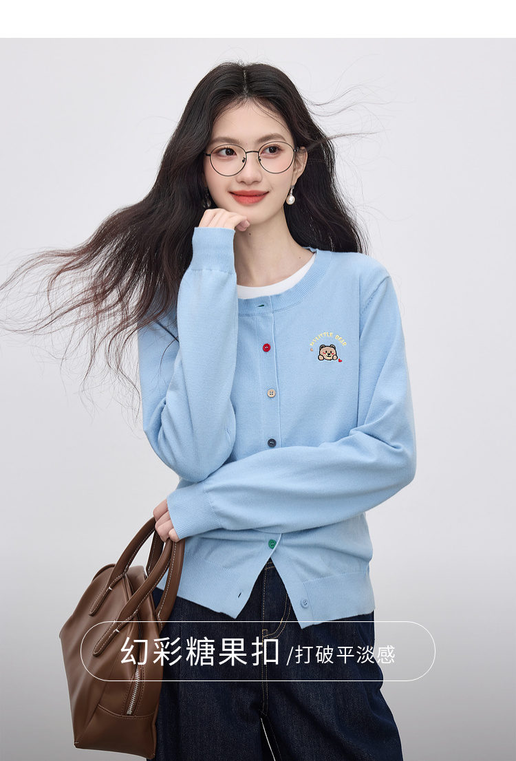 【专属特价】熙世界2025年秋季新款圆领针织开衫女长袖学院风卡通刺绣软糯上衣