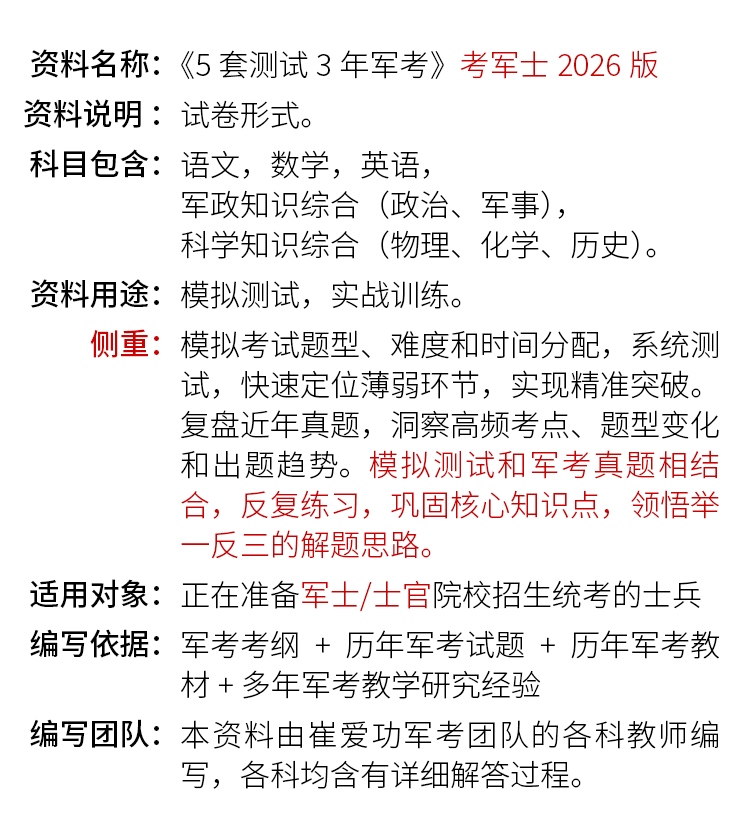 【考军士/警士】2026版崔爱功《5套测试3年军考(2012-2024年真题)》解放军和武警(士官版)