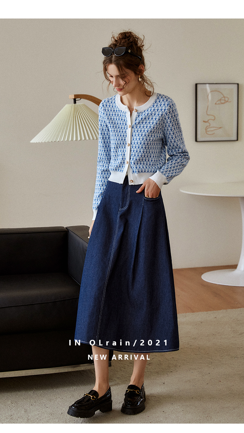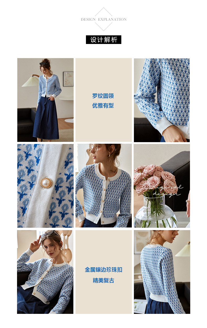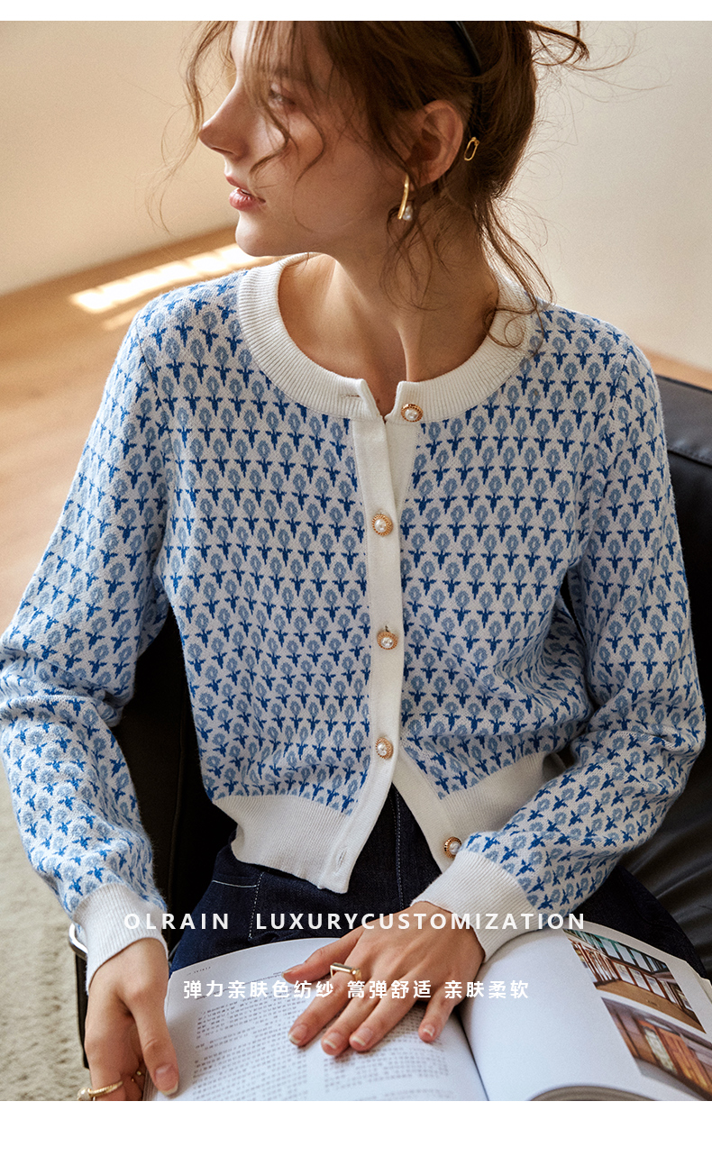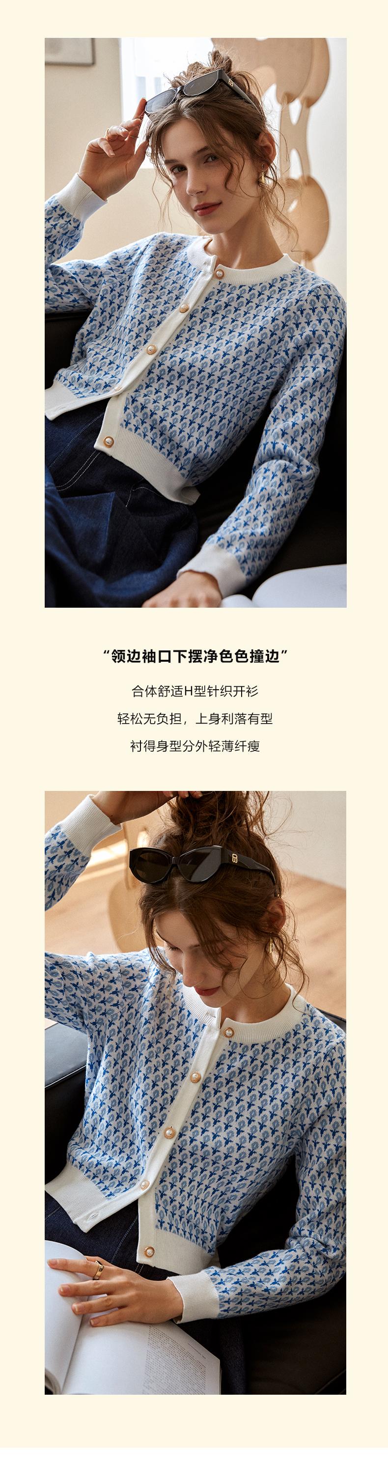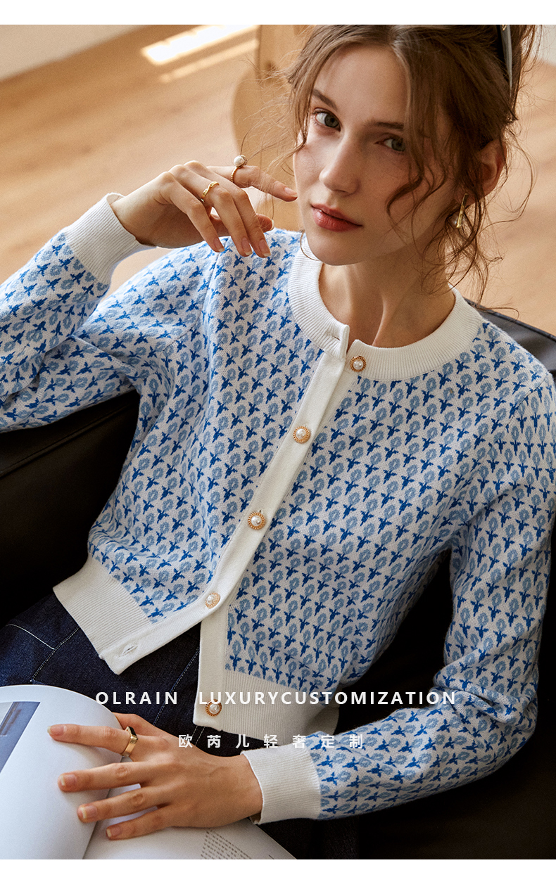 欧芮儿2021春秋新款蓝色针织衫毛衣女圆领时尚外穿开衫外套早秋