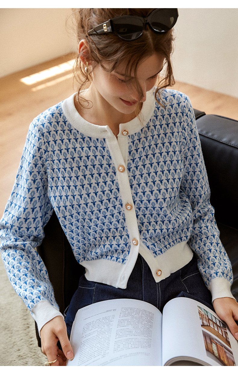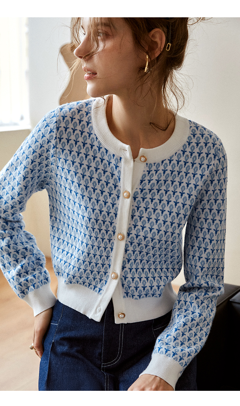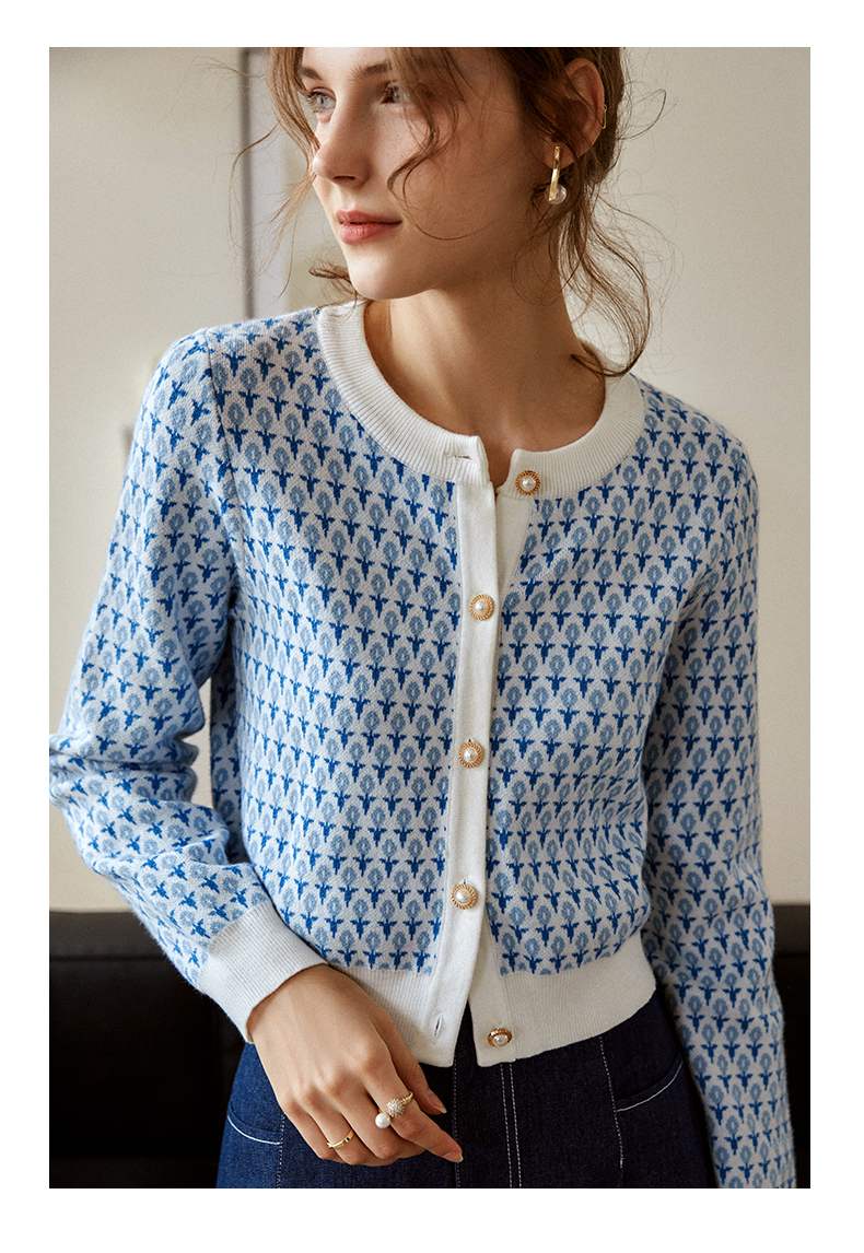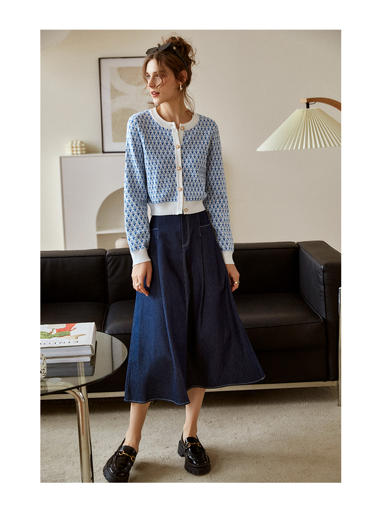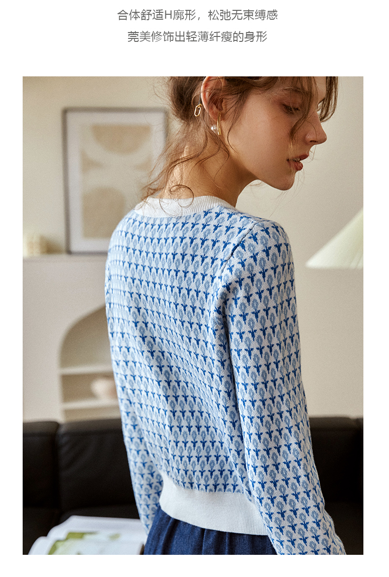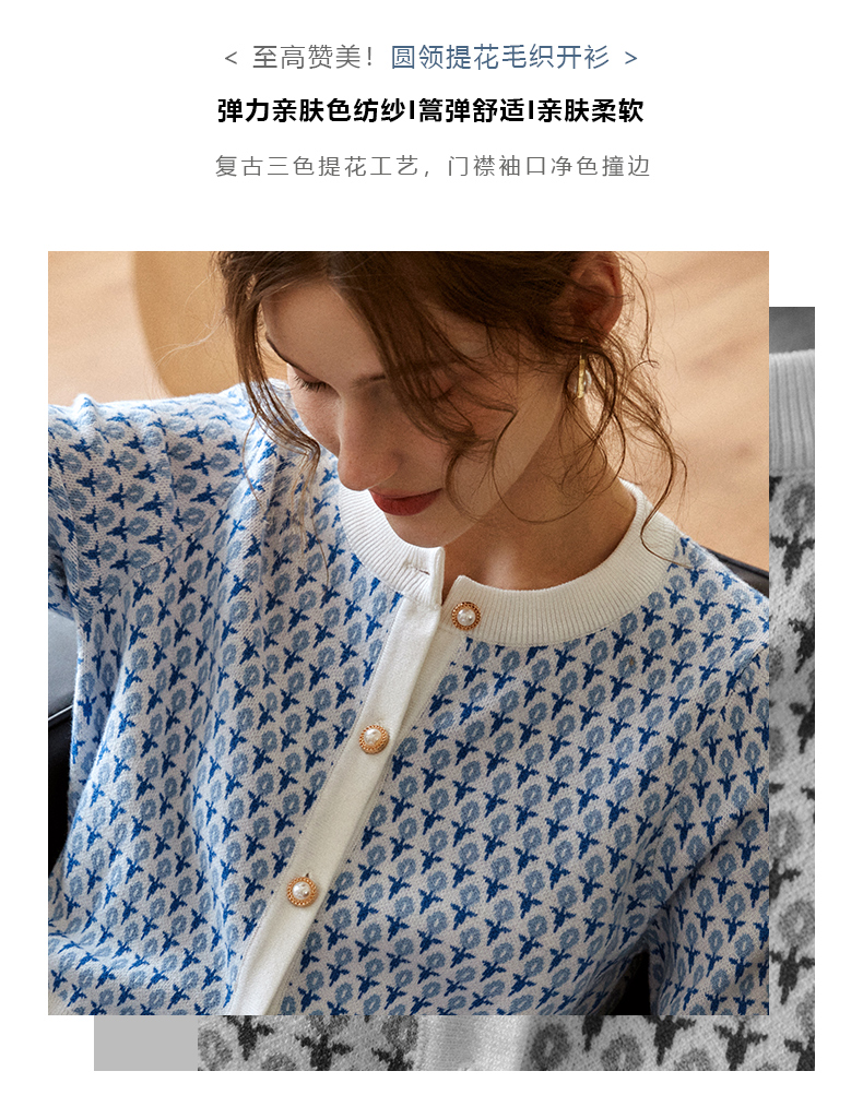 欧芮儿2021春秋新款蓝色针织衫毛衣女圆领时尚外穿开衫外套早秋
