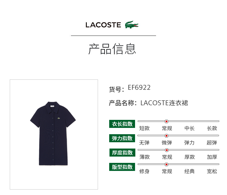 【海南专供价】Lacoste法国鳄鱼女装休闲百搭休闲POLO连衣裙EF6922-98