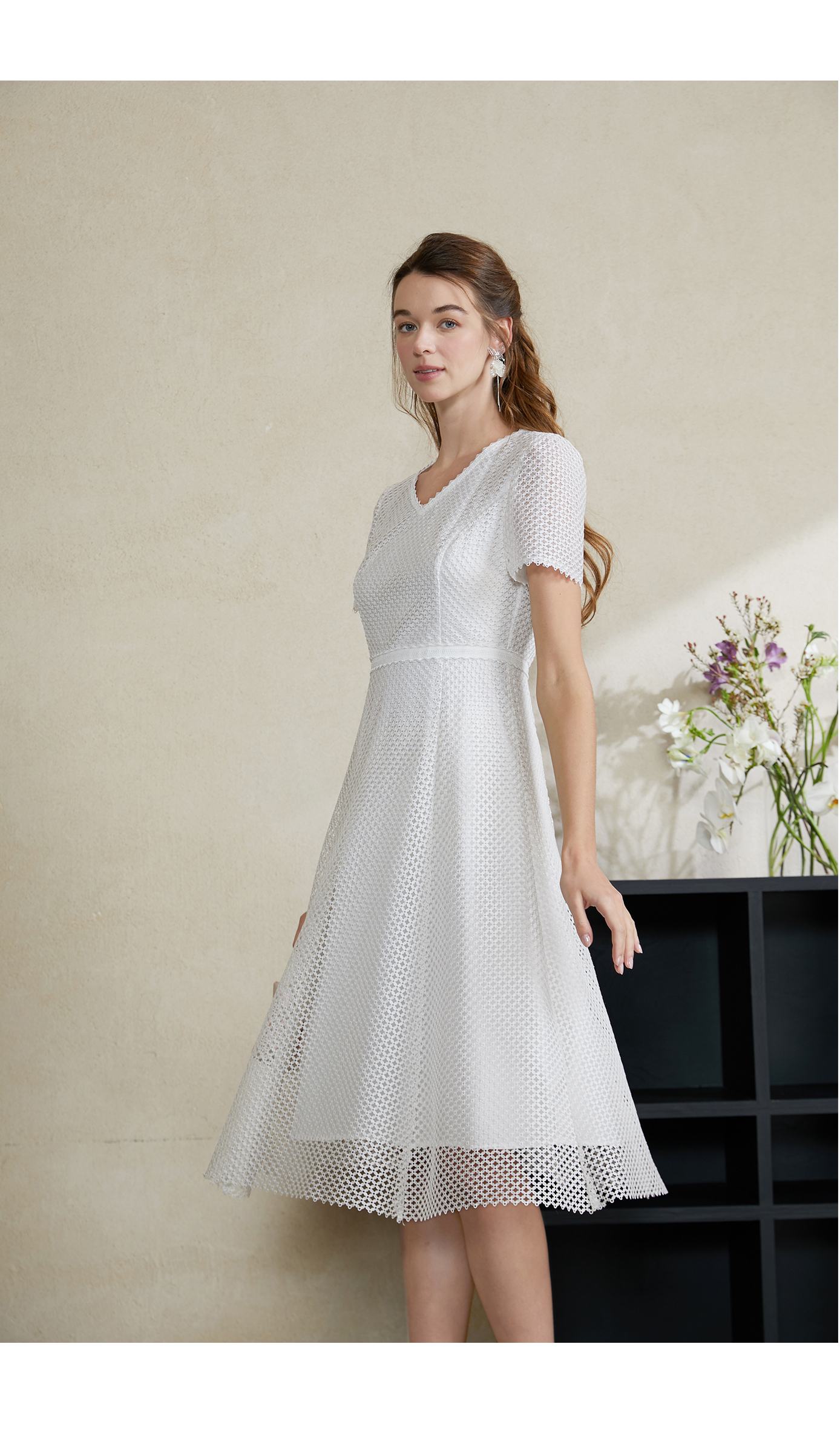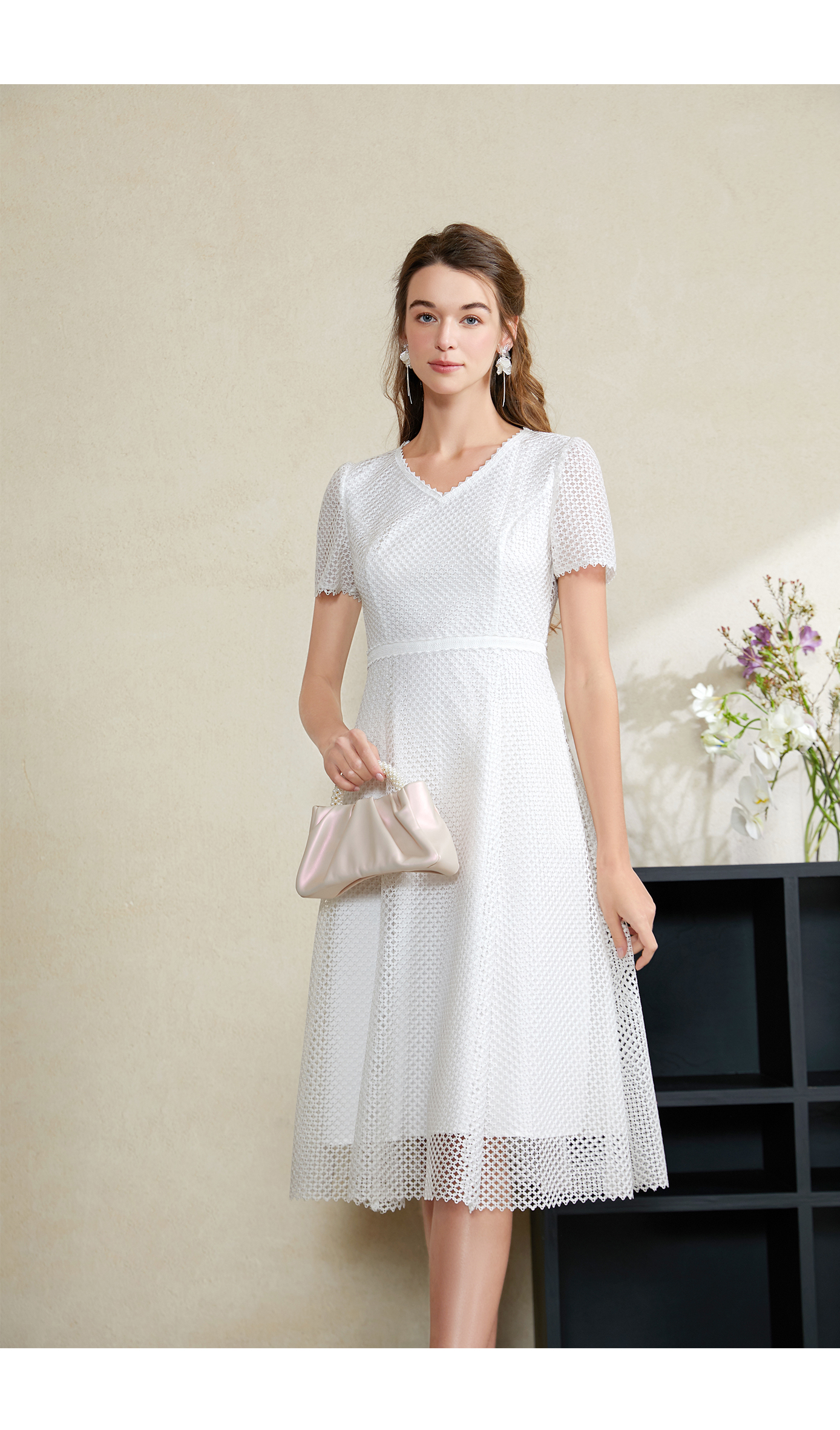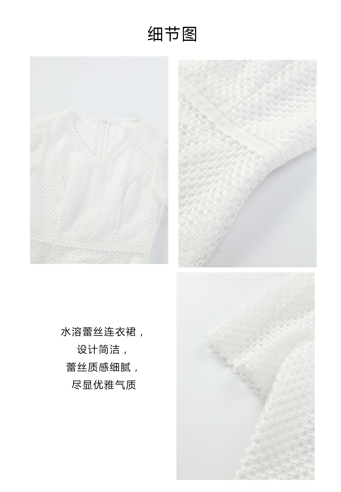 司歌蕾丝短袖v领收腰连衣裙A911215X