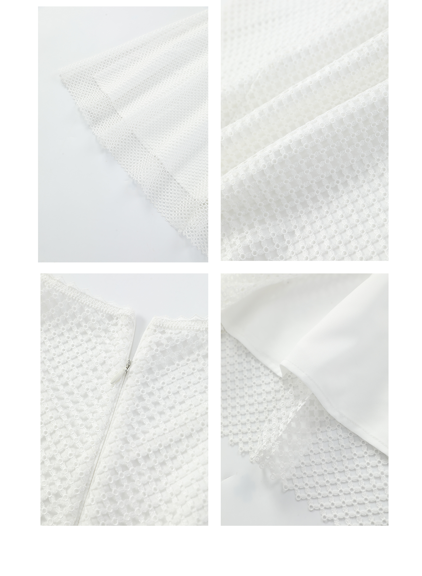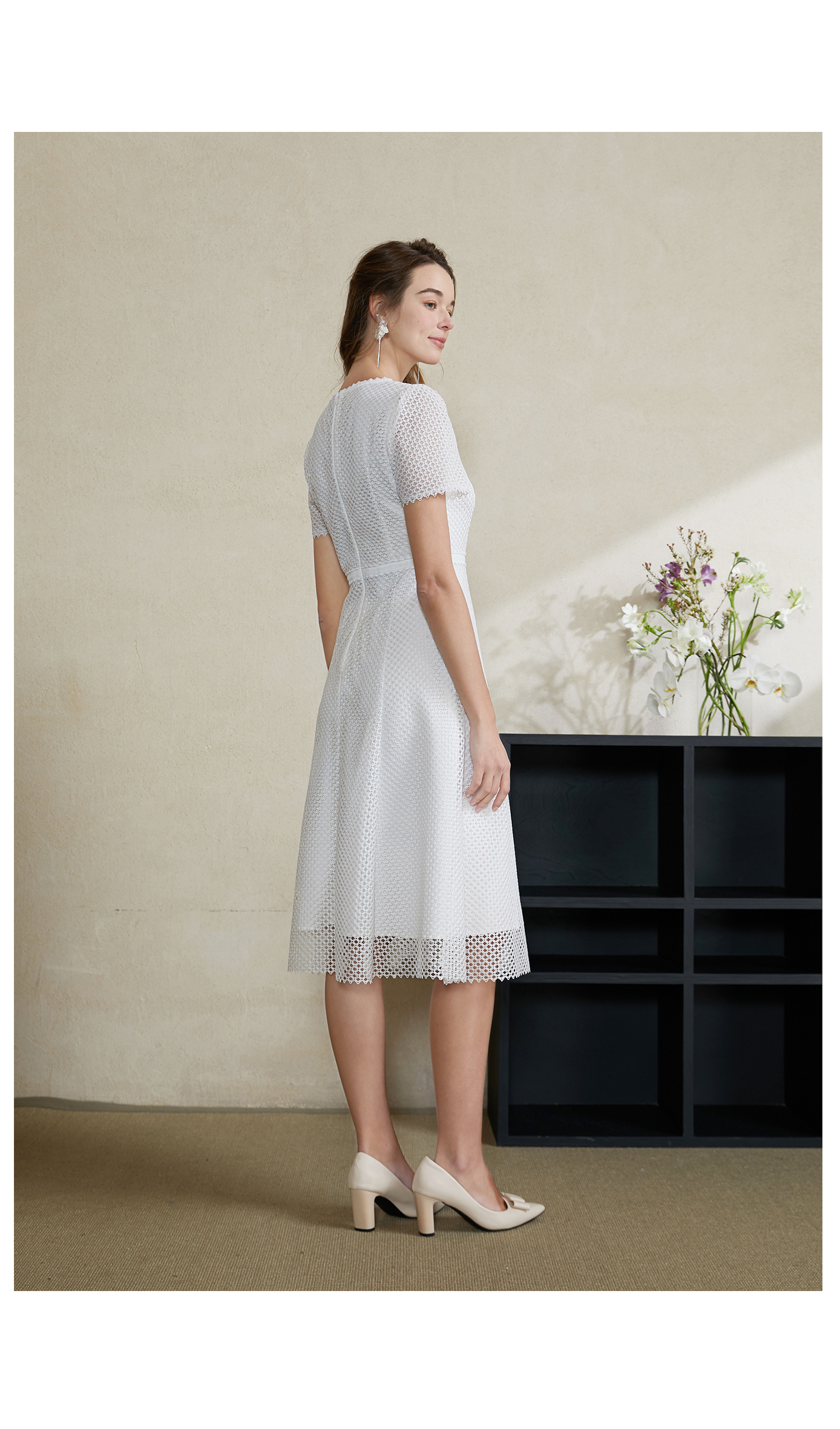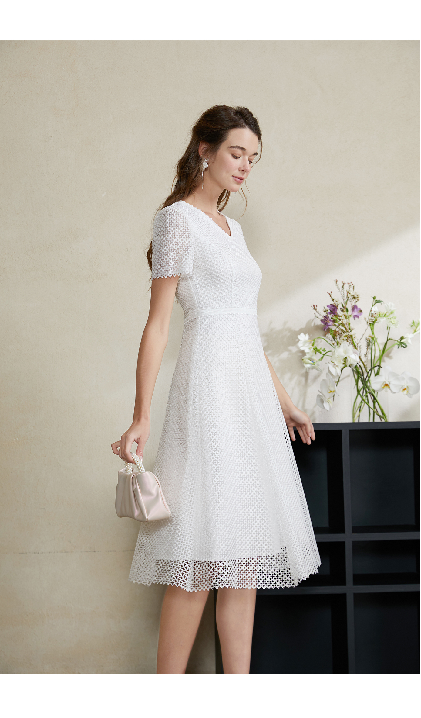 司歌蕾丝短袖v领收腰连衣裙A911215X