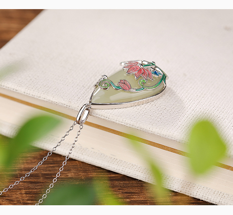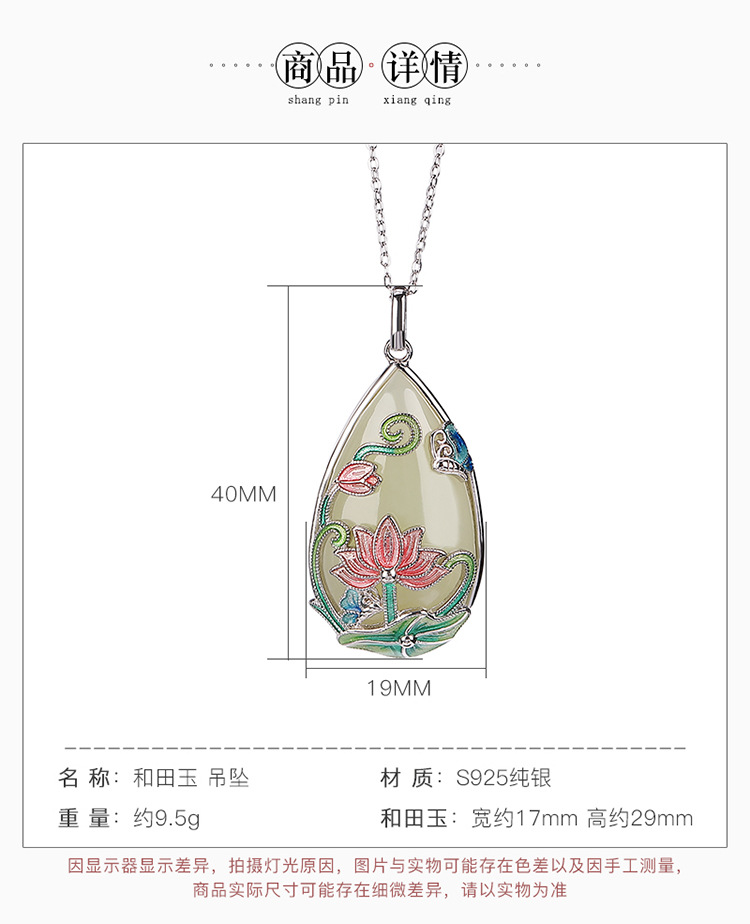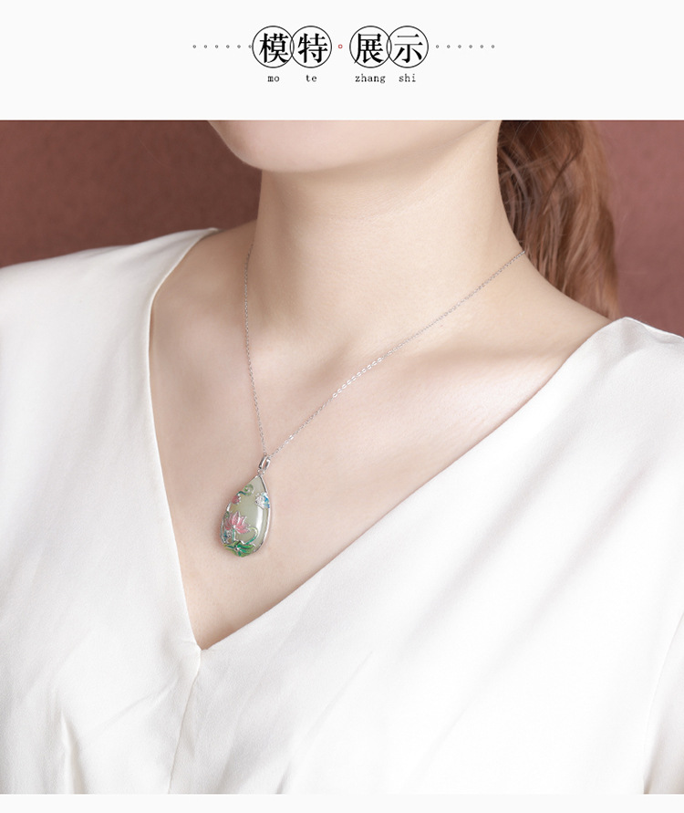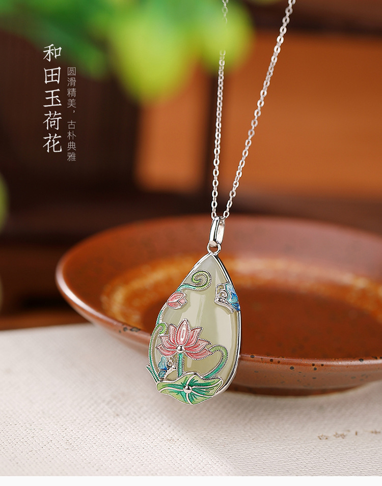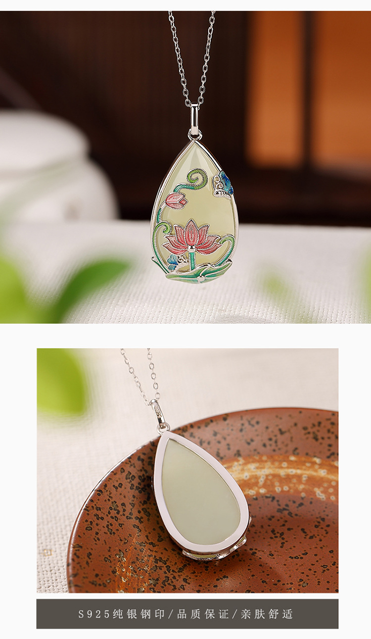 【荷花祥云】S925银和田玉白玉国潮珐琅吊坠【CW-51410】
