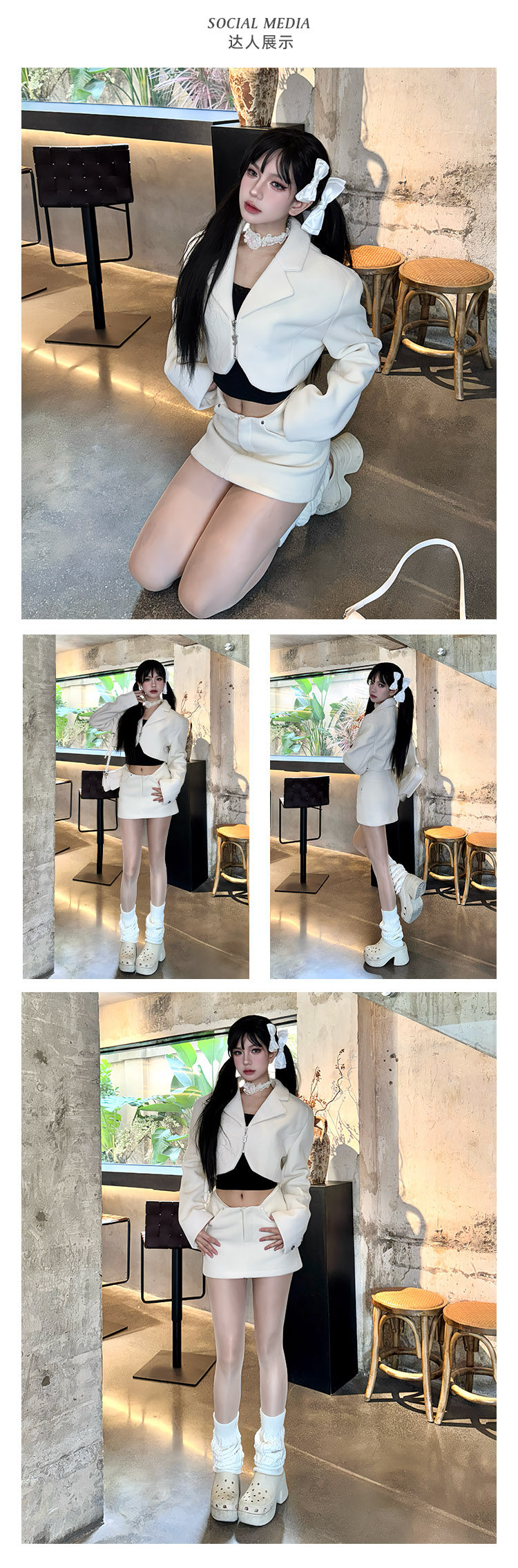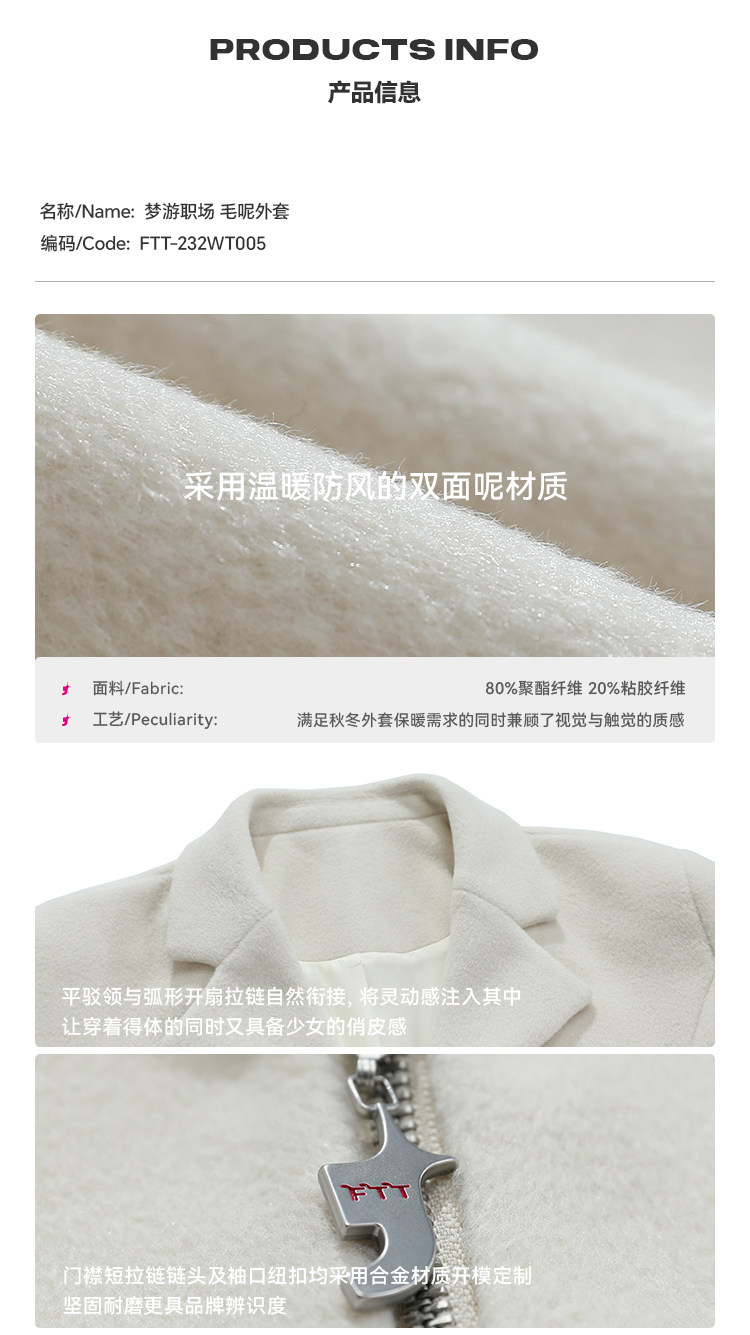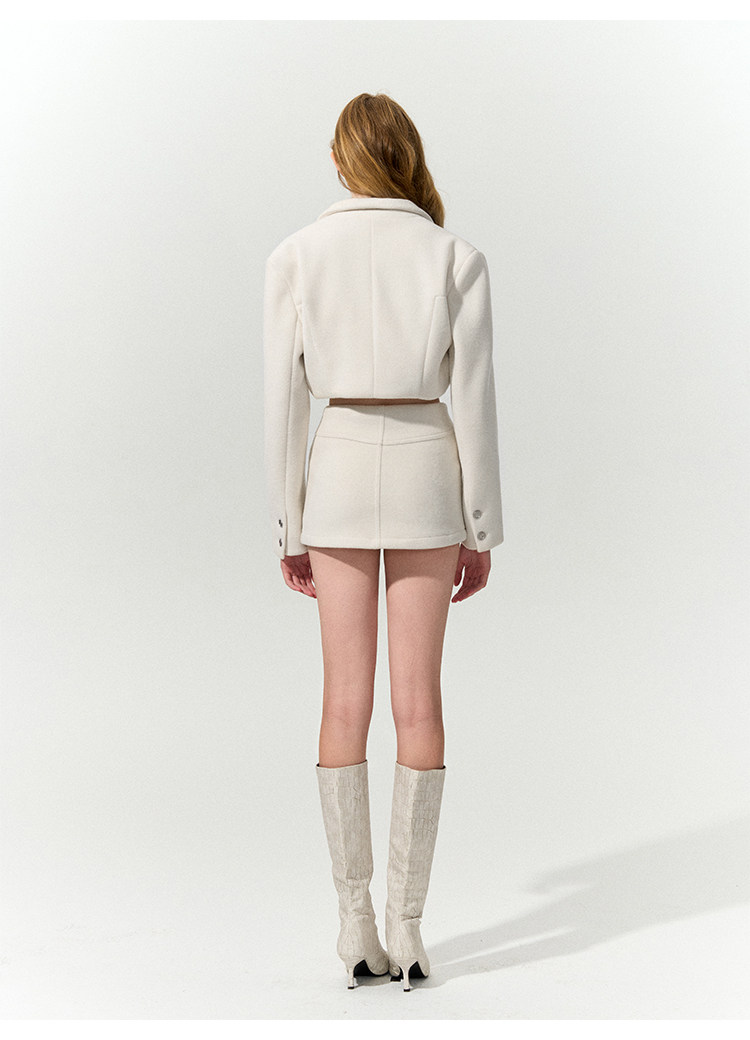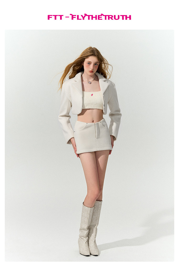 FTT FlyTheTruth『梦游职场』白色毛呢短外套女秋V字腰半身裙短裙