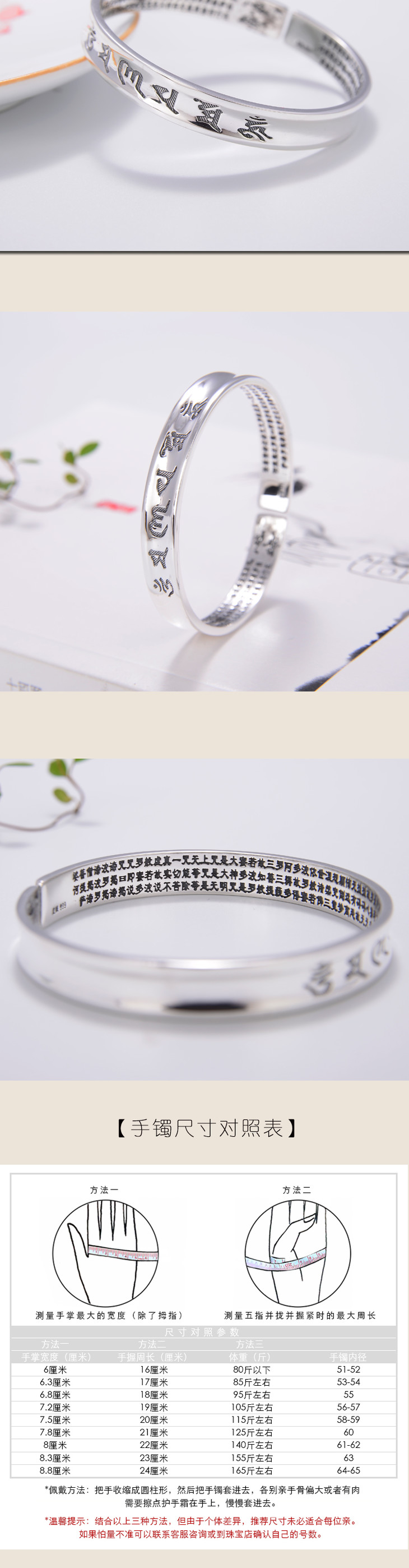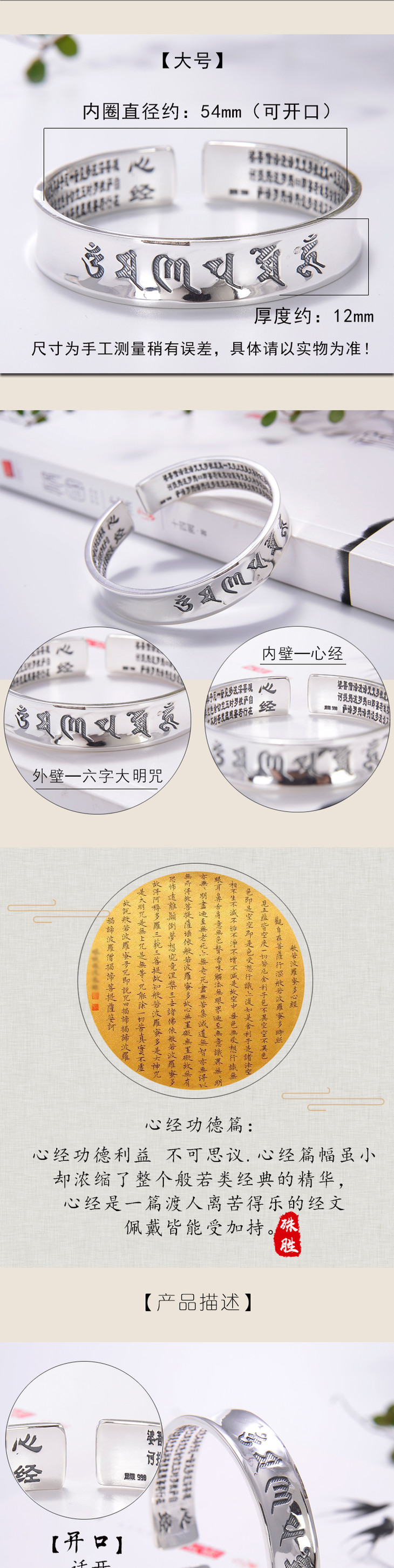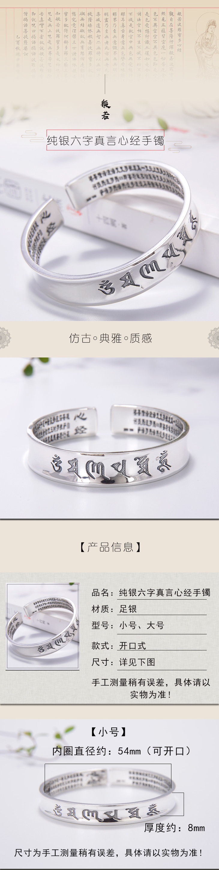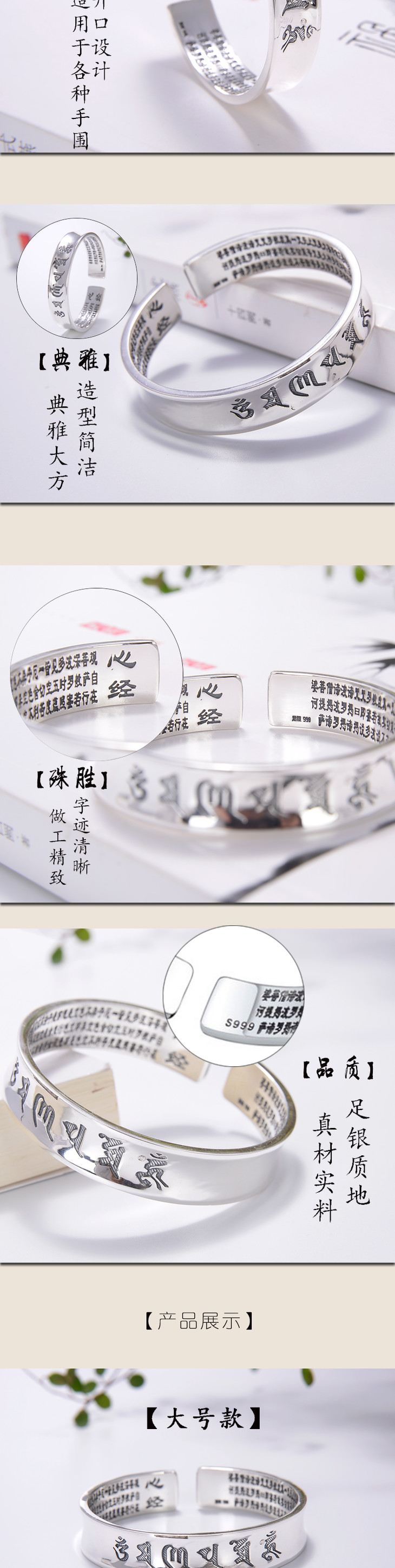 天语龙吟 足银六字真言心经手镯经文 亚光实心开口纯银手镯镯子