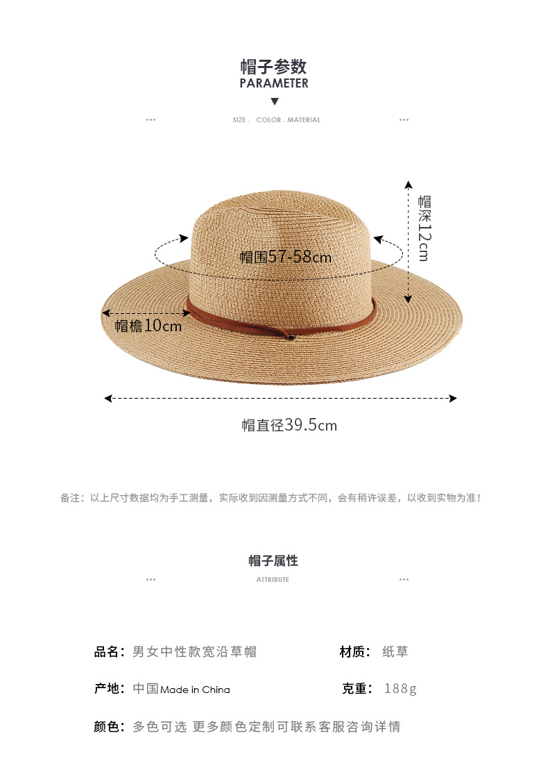 男女中性款夏季遮阳草帽,时尚宽沿太阳帽户外旅游沙滩帽 FT-0234