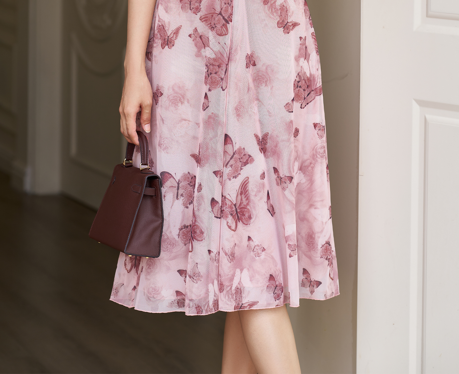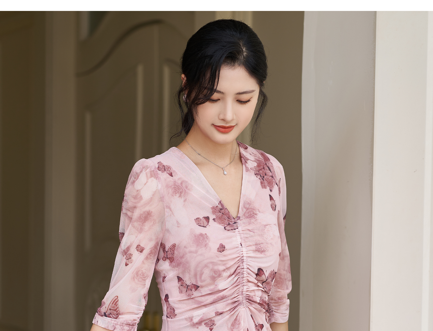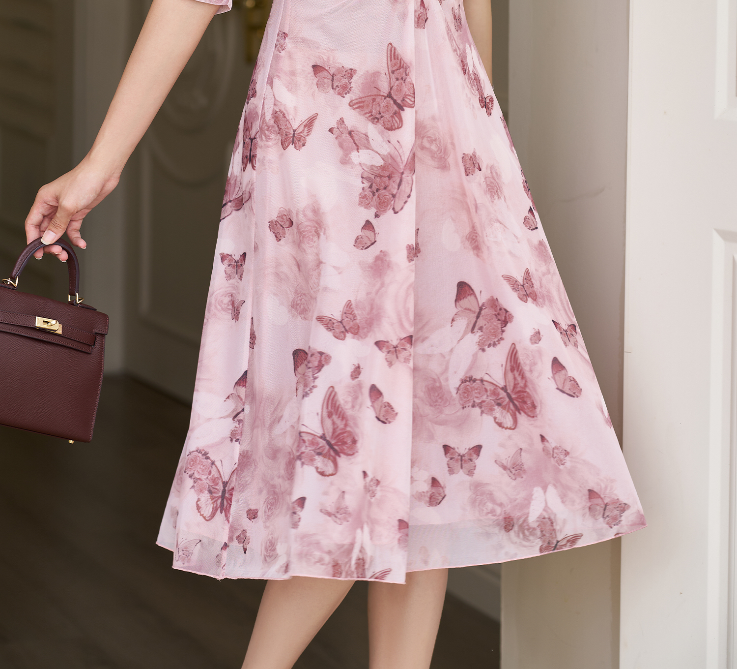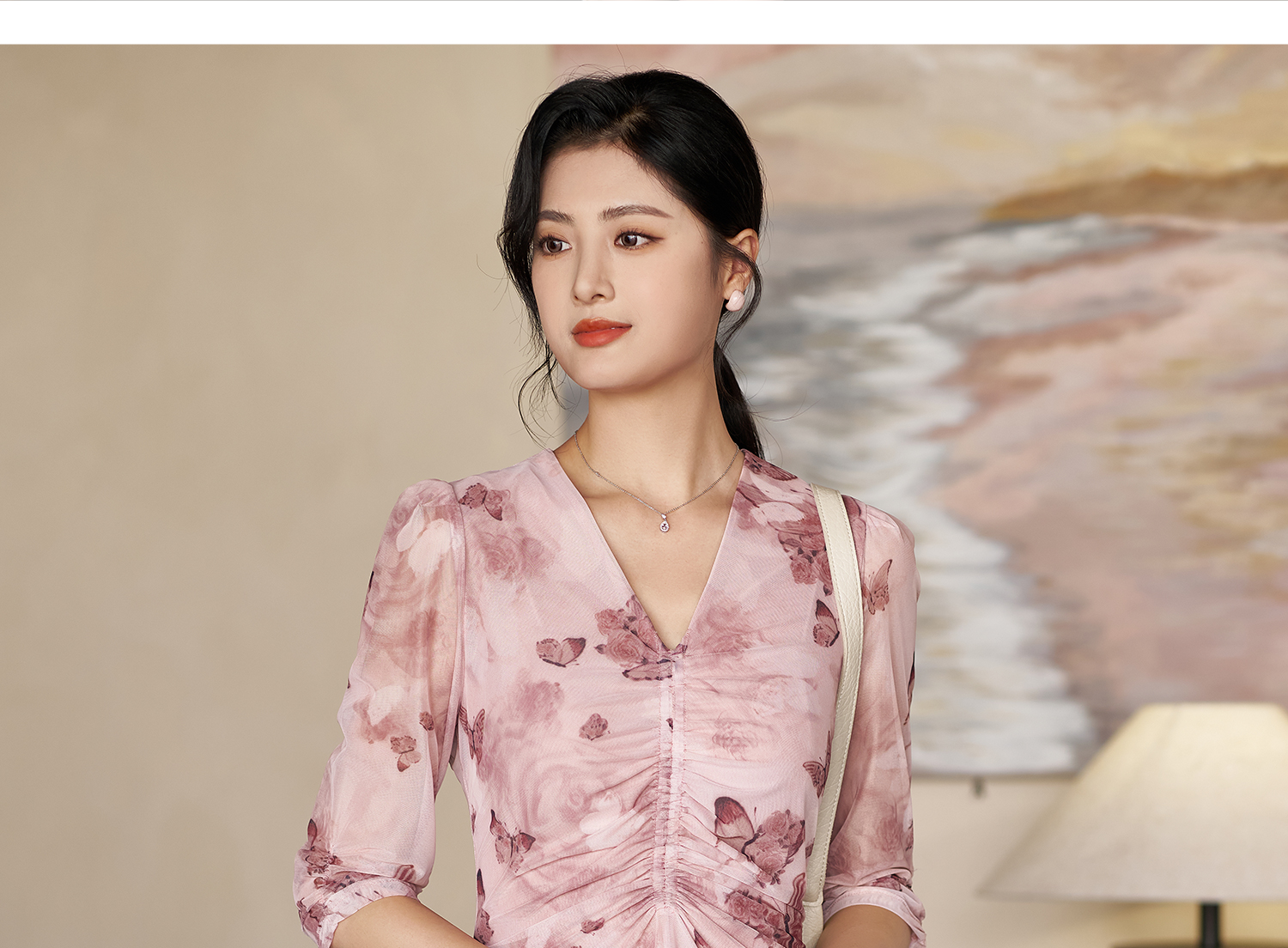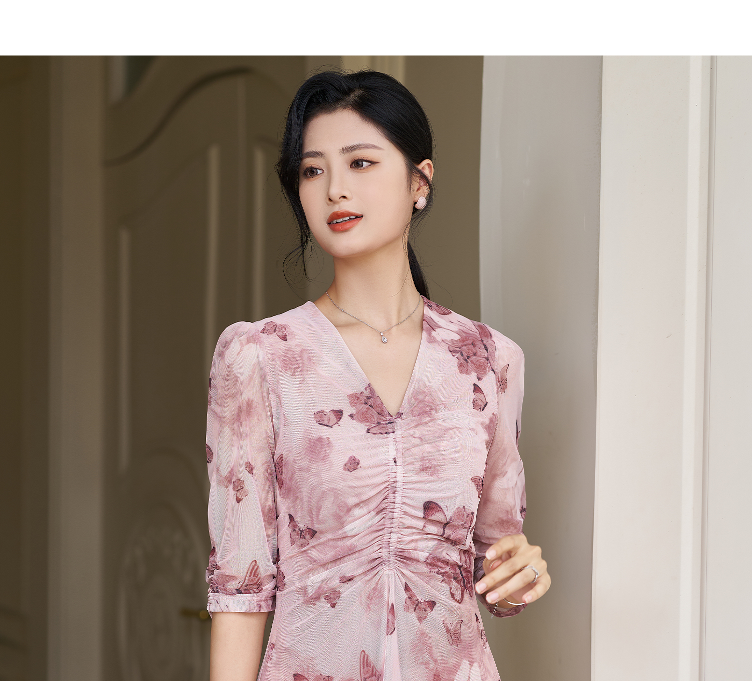 米思阳2026春季网纱裙浪漫法式印花裙设计感抽褶清新粉色连衣裙3711