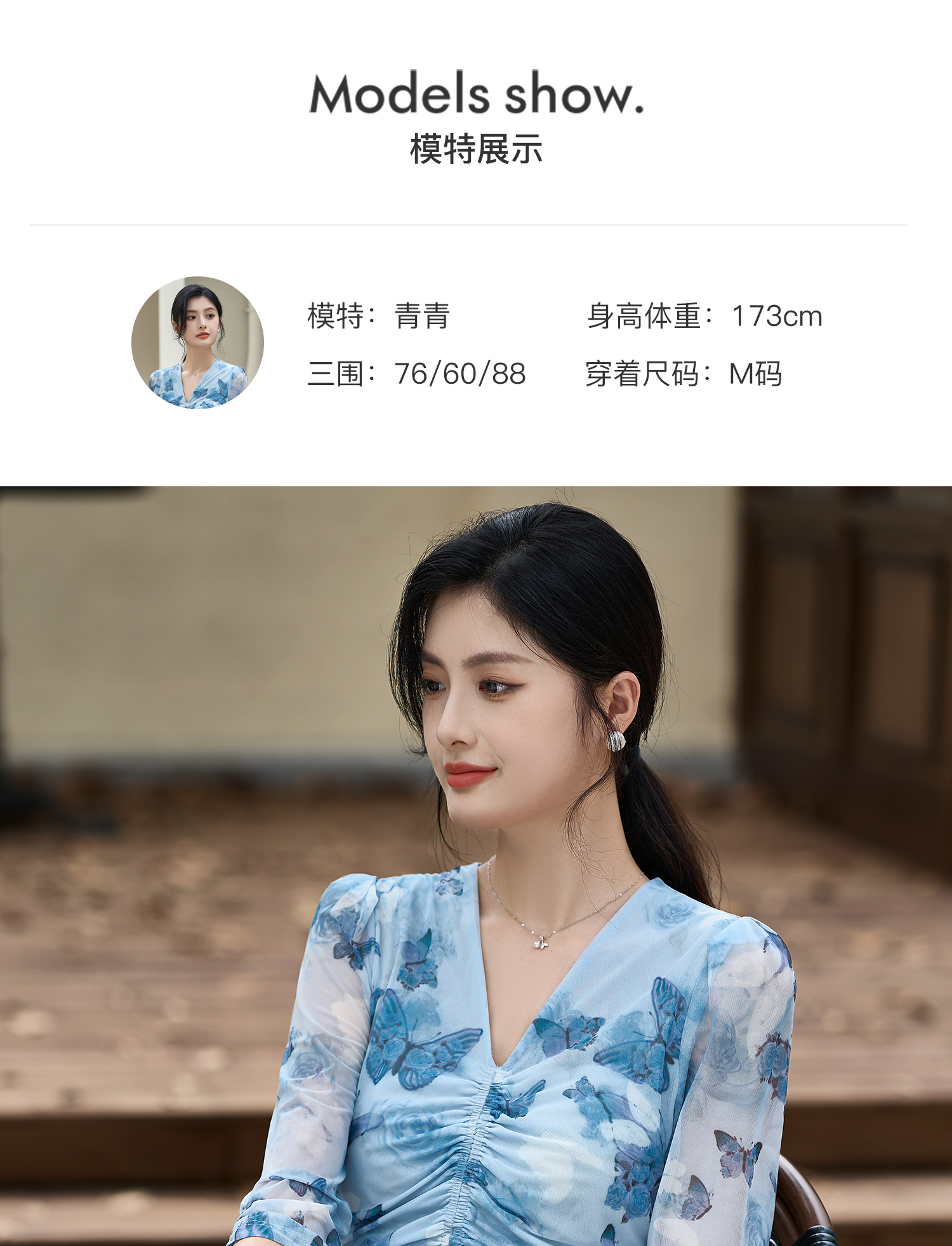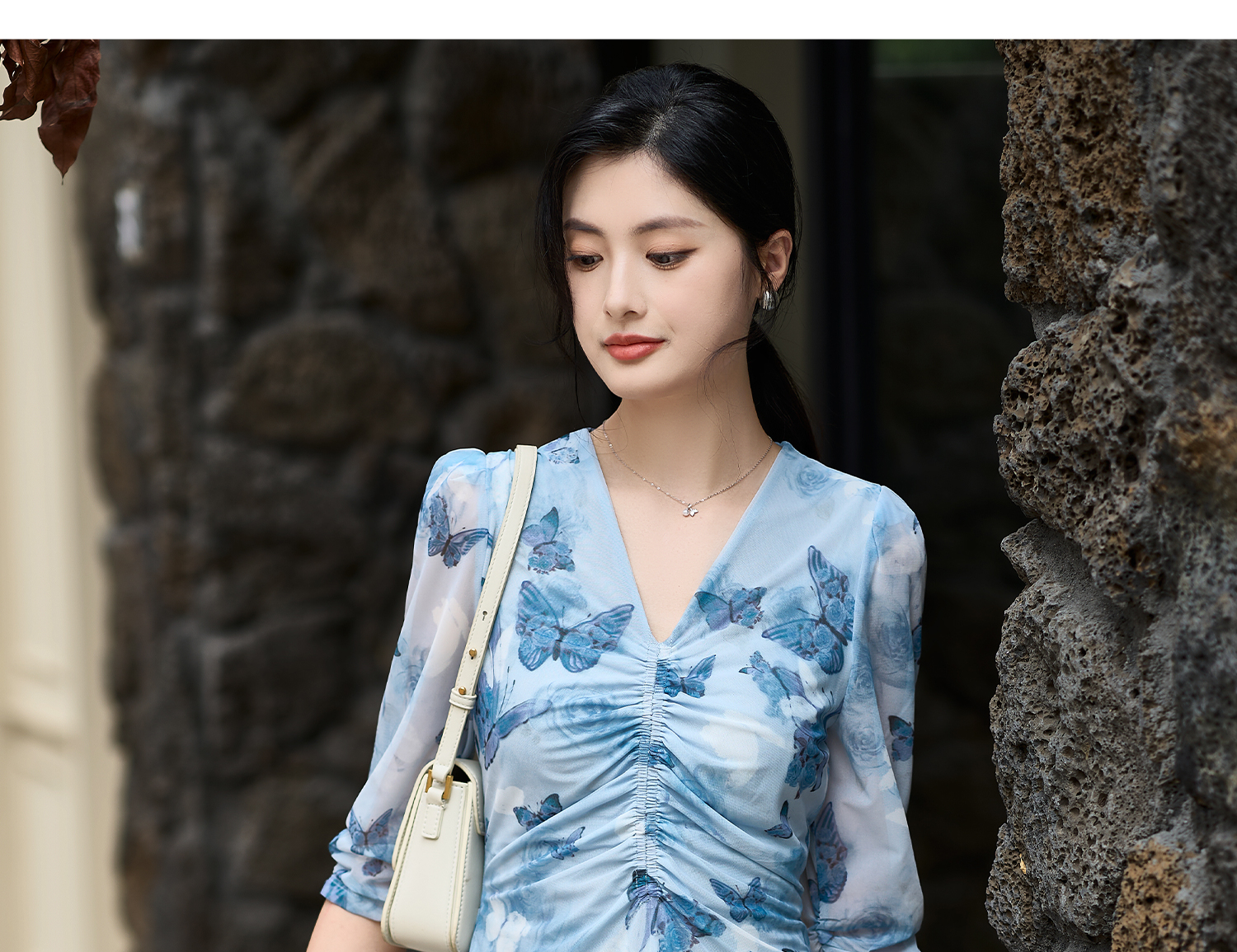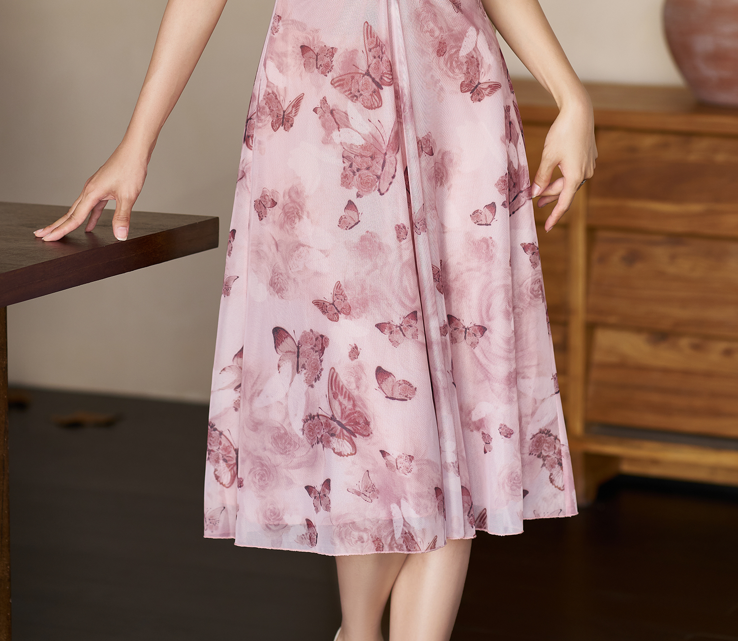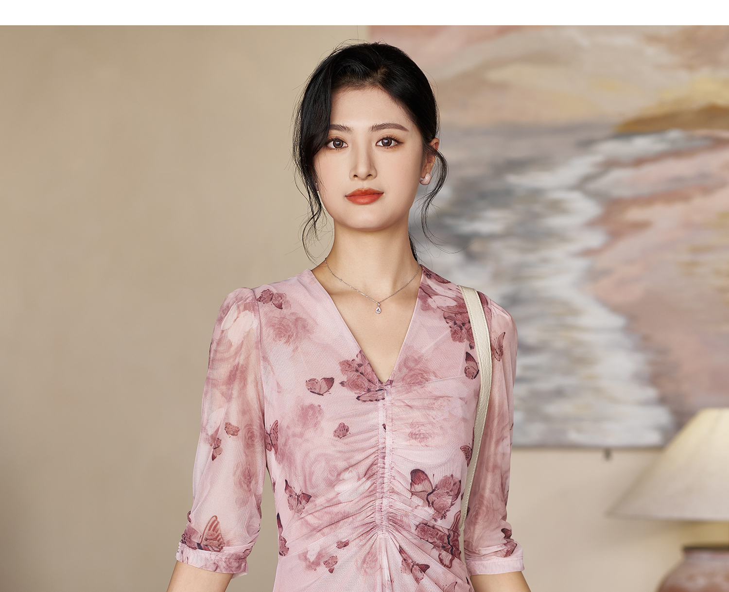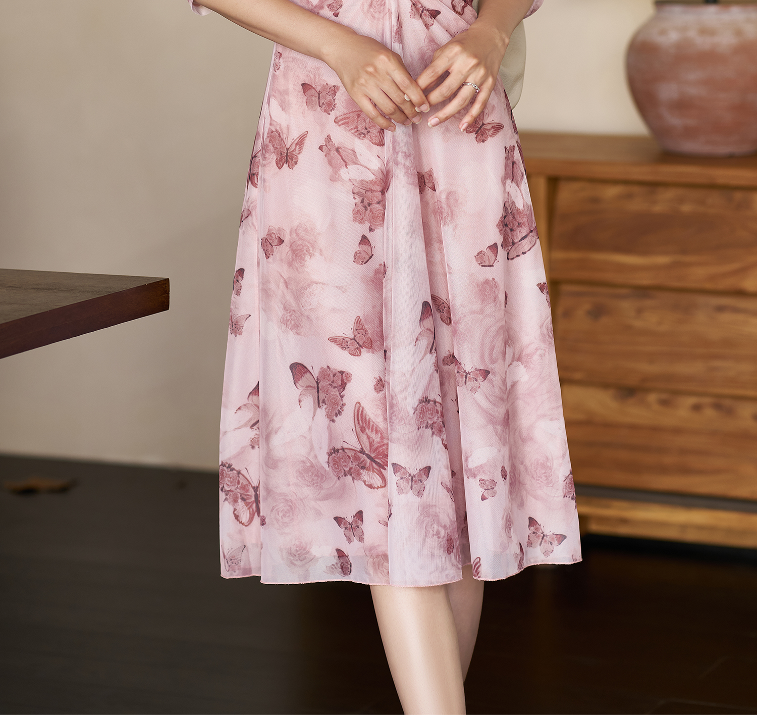米思阳2026春季网纱裙浪漫法式印花裙设计感抽褶清新粉色连衣裙3711