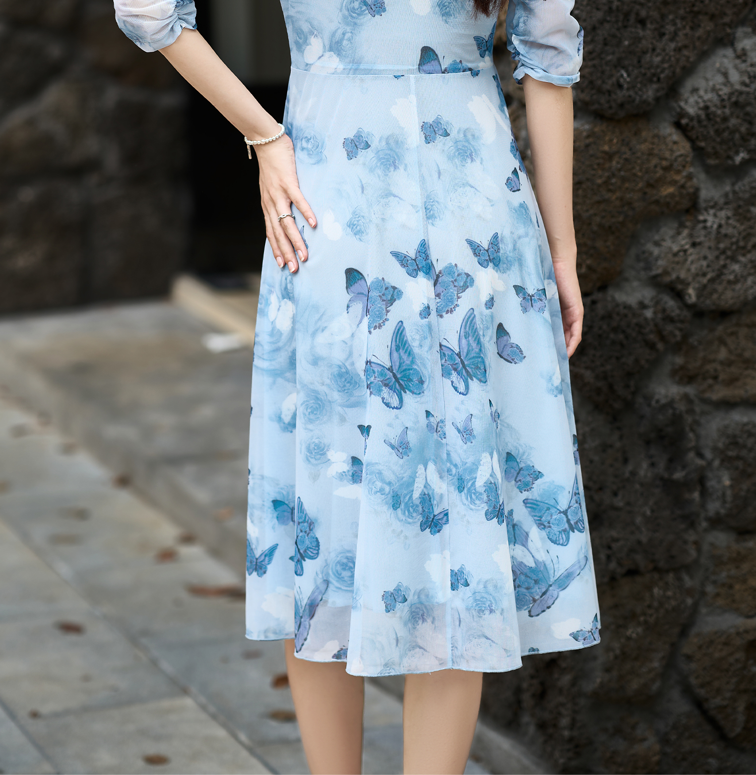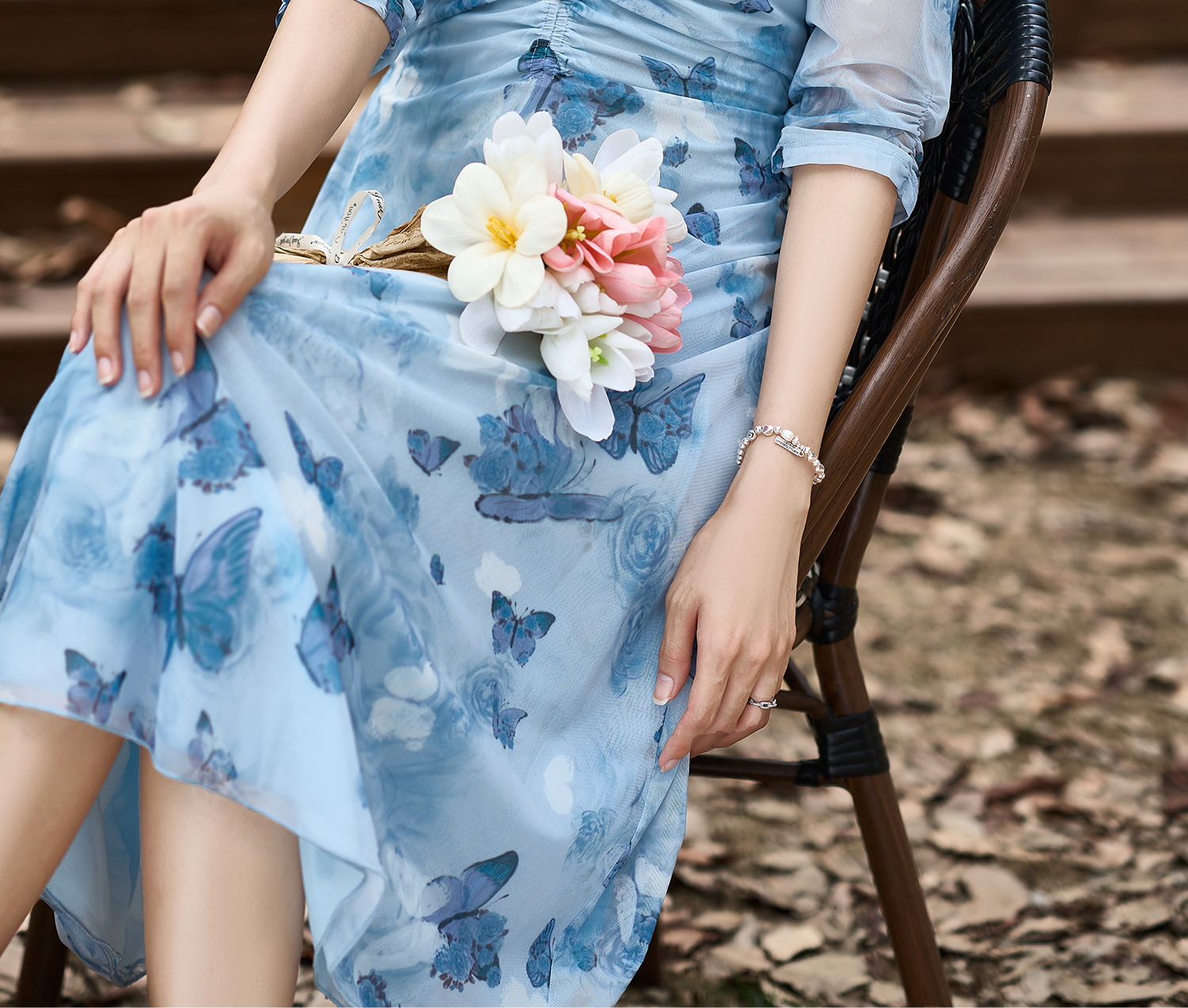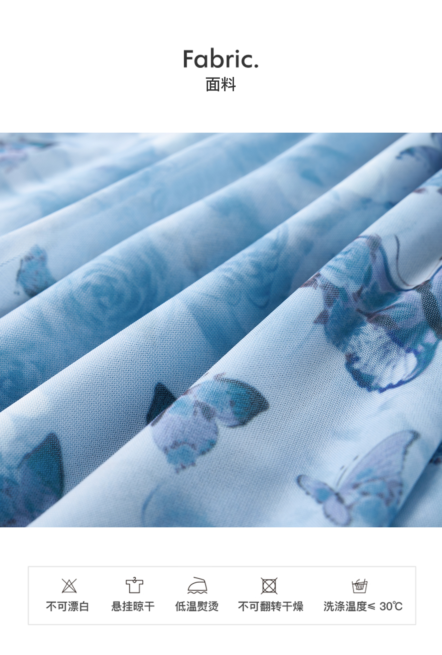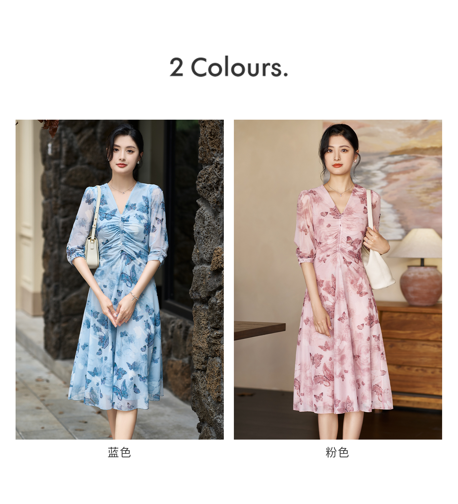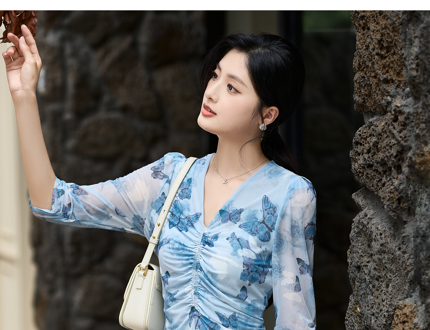 米思阳2026春季网纱裙浪漫法式印花裙设计感抽褶清新粉色连衣裙3711