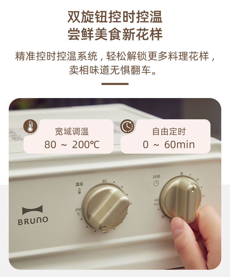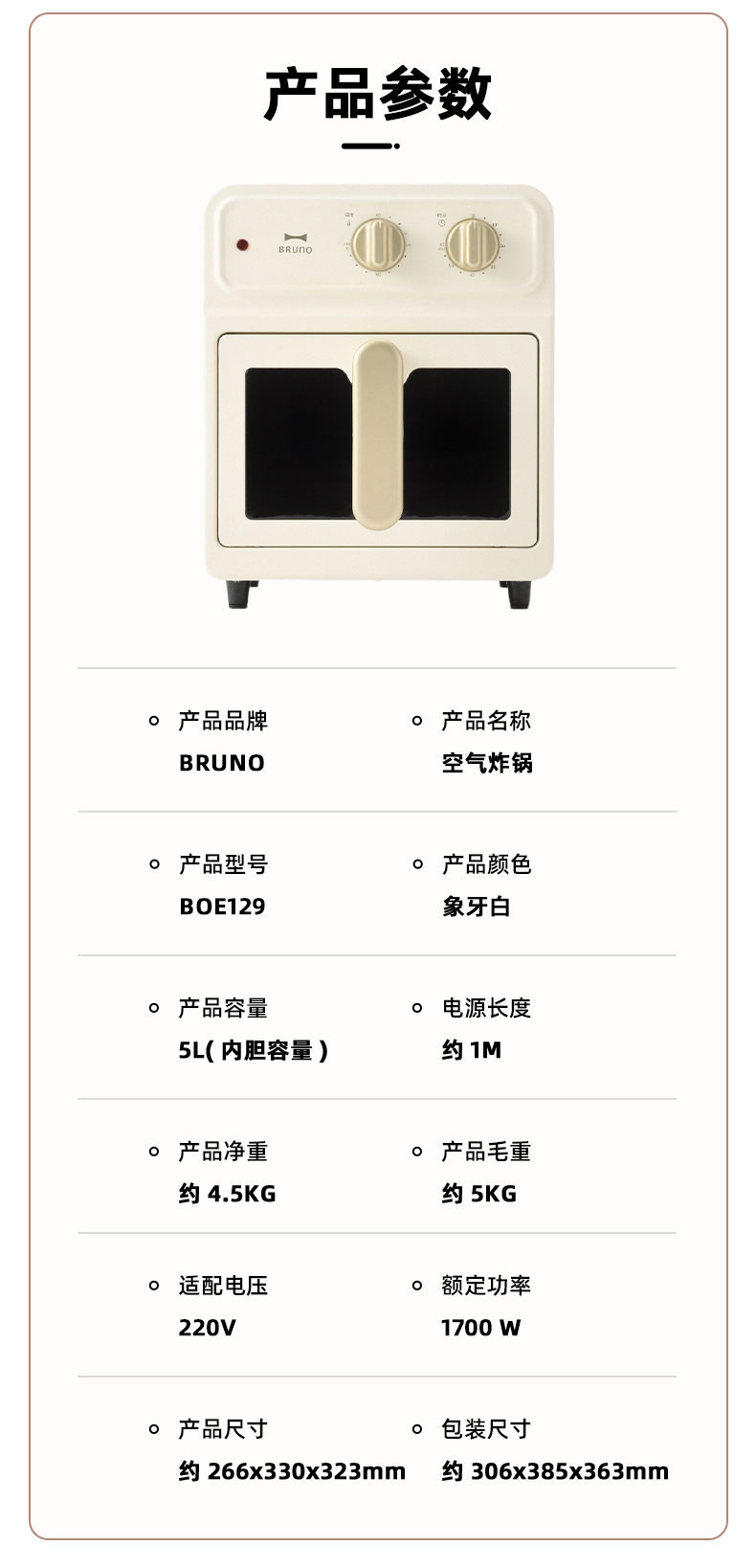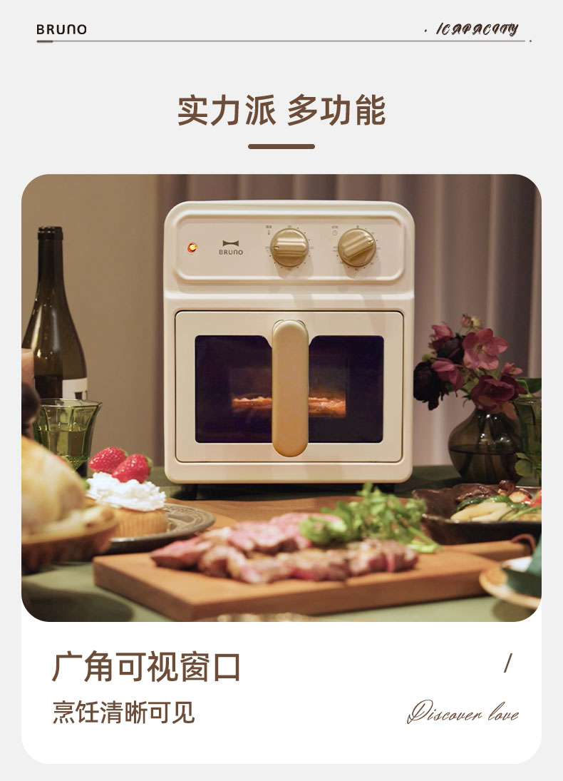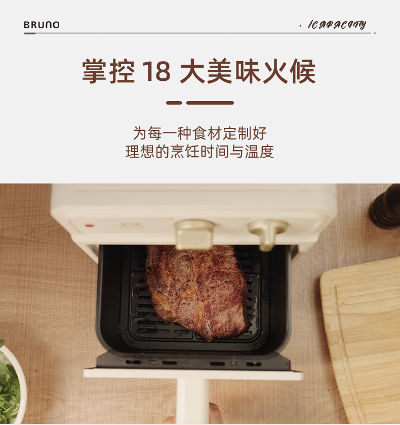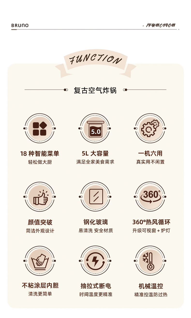 【可视空气炸锅】BRUNO复古5L空气炸锅BOE129-IV 蒸汽嫩烤 无需翻面 一机6用 18种菜单 容量5L 360度热风 不粘涂层内胆 抽拉式断电