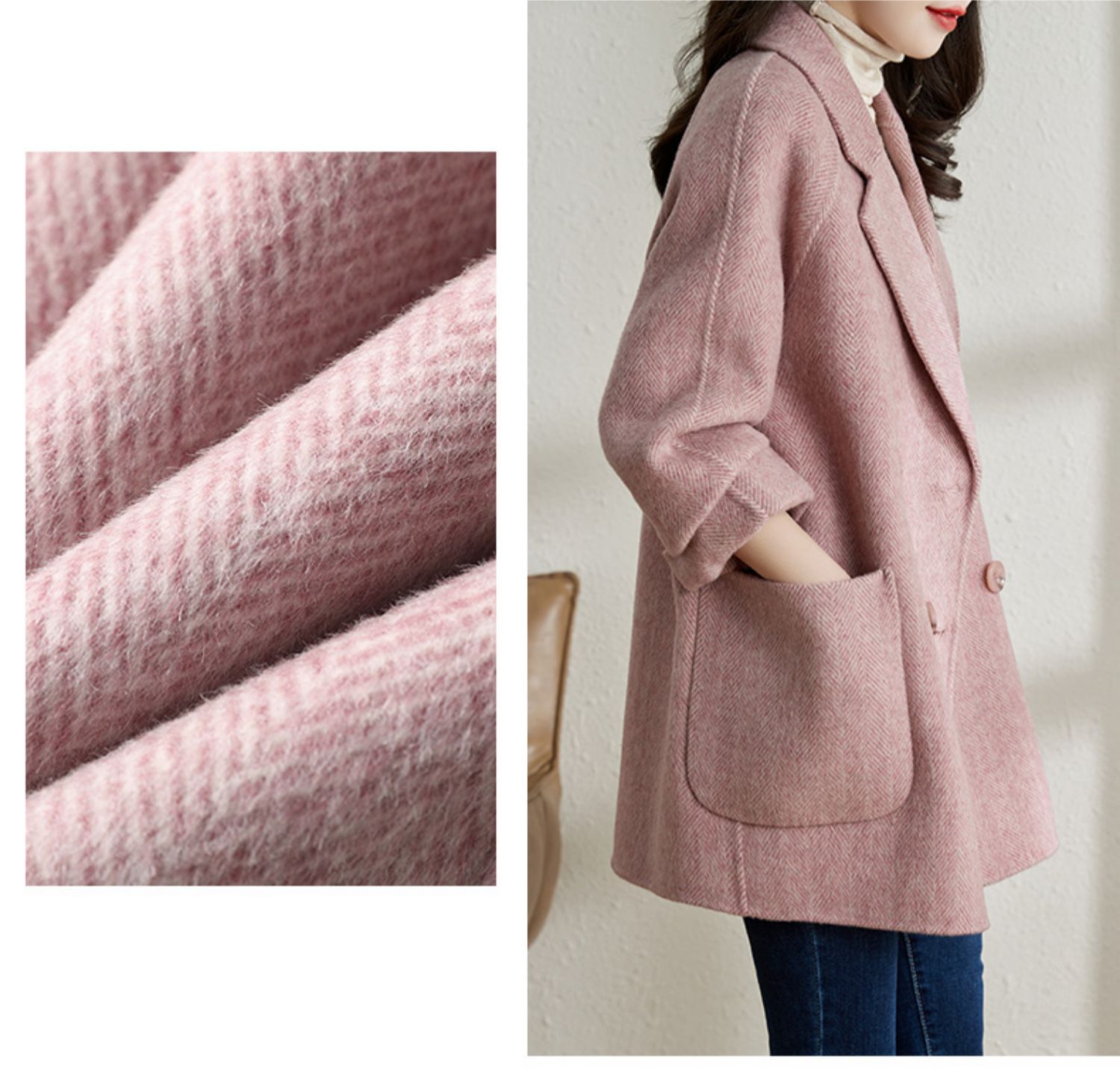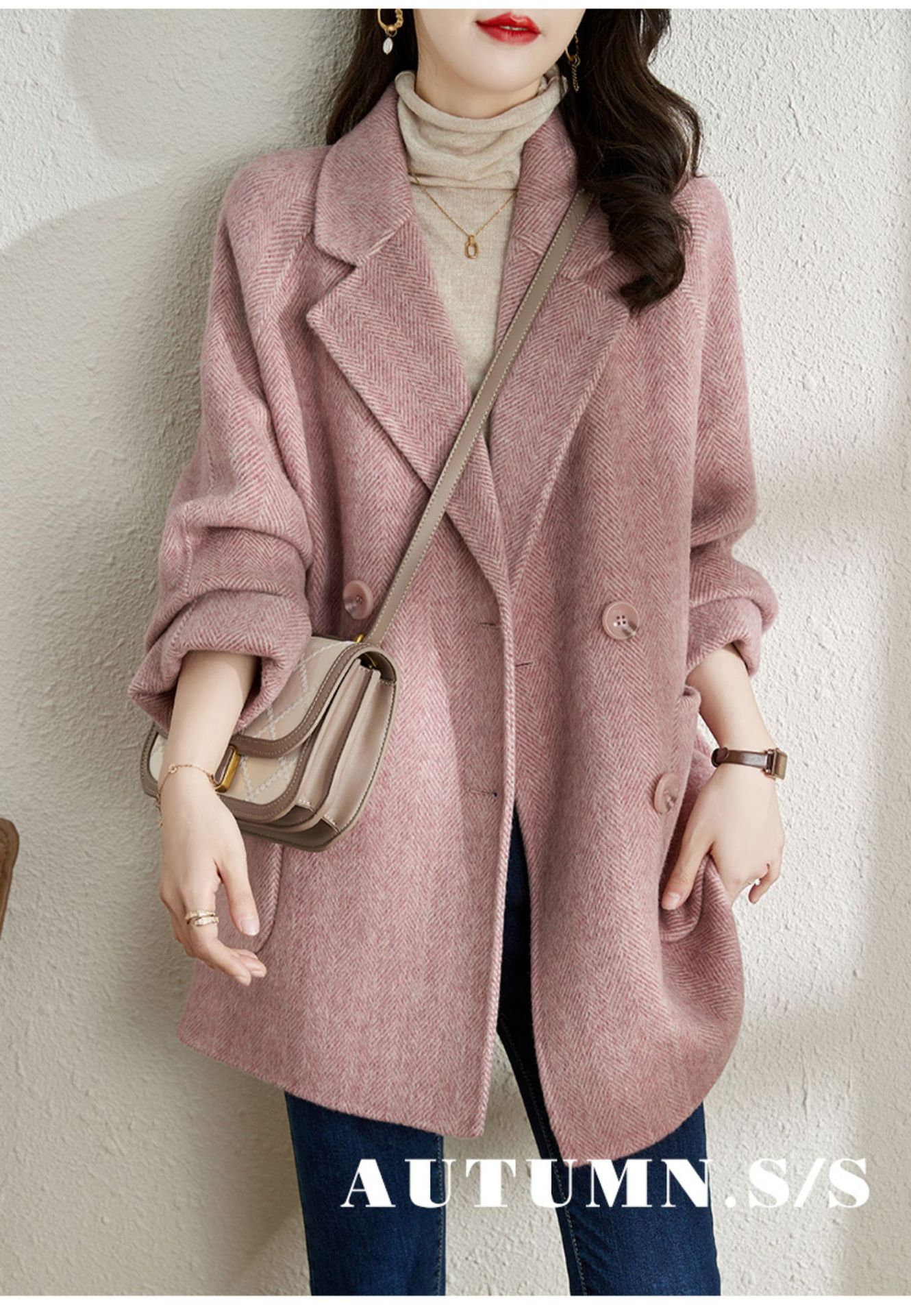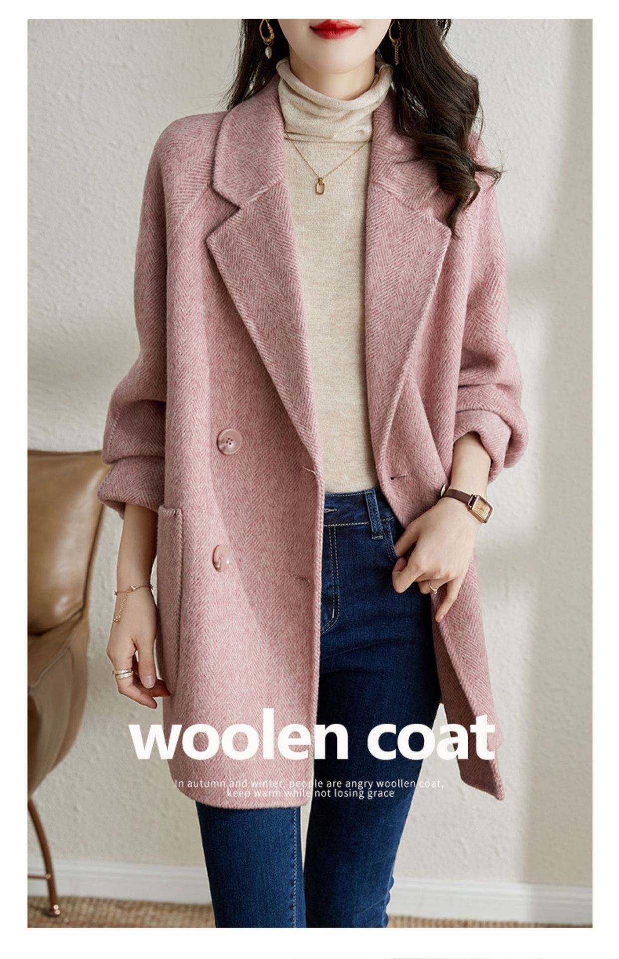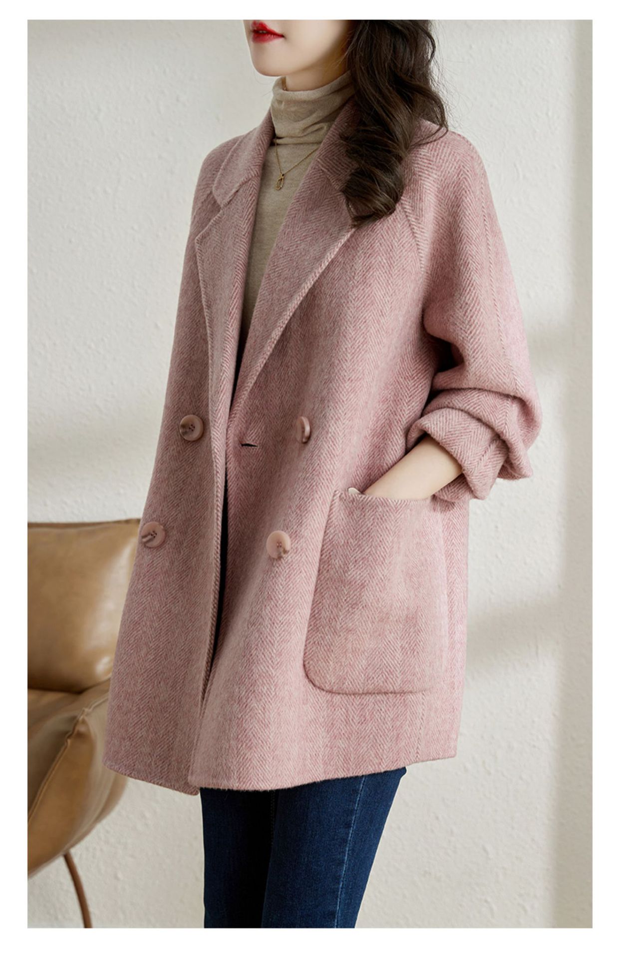 2025秋冬季新款粉色毛呢大衣女小个子中长款气质休闲呢外套