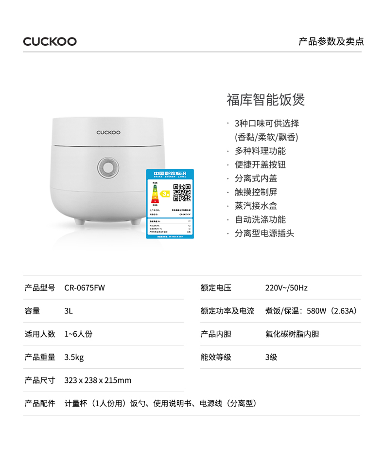 福库CUCKOO 韩国品牌电饭锅 可预约家用蒸煮多功能小型迷你智能 自动洗涤功能电饭煲 CR-0675FW(3L 2-6人份)
