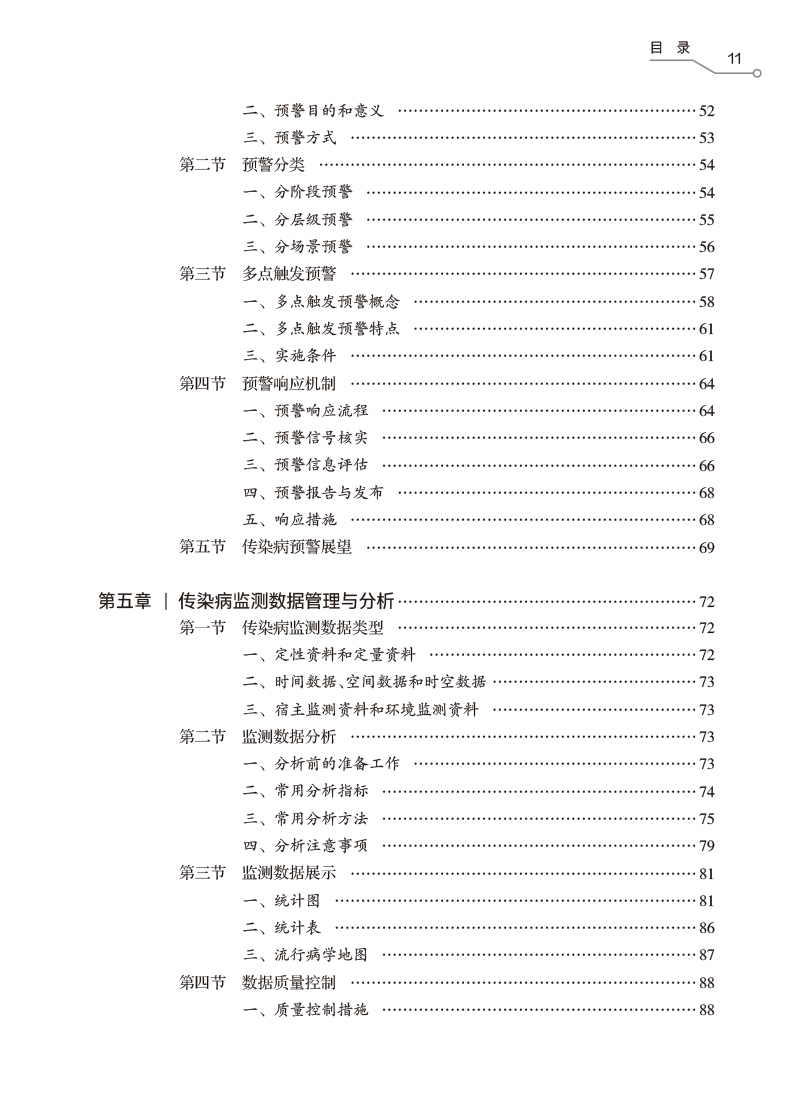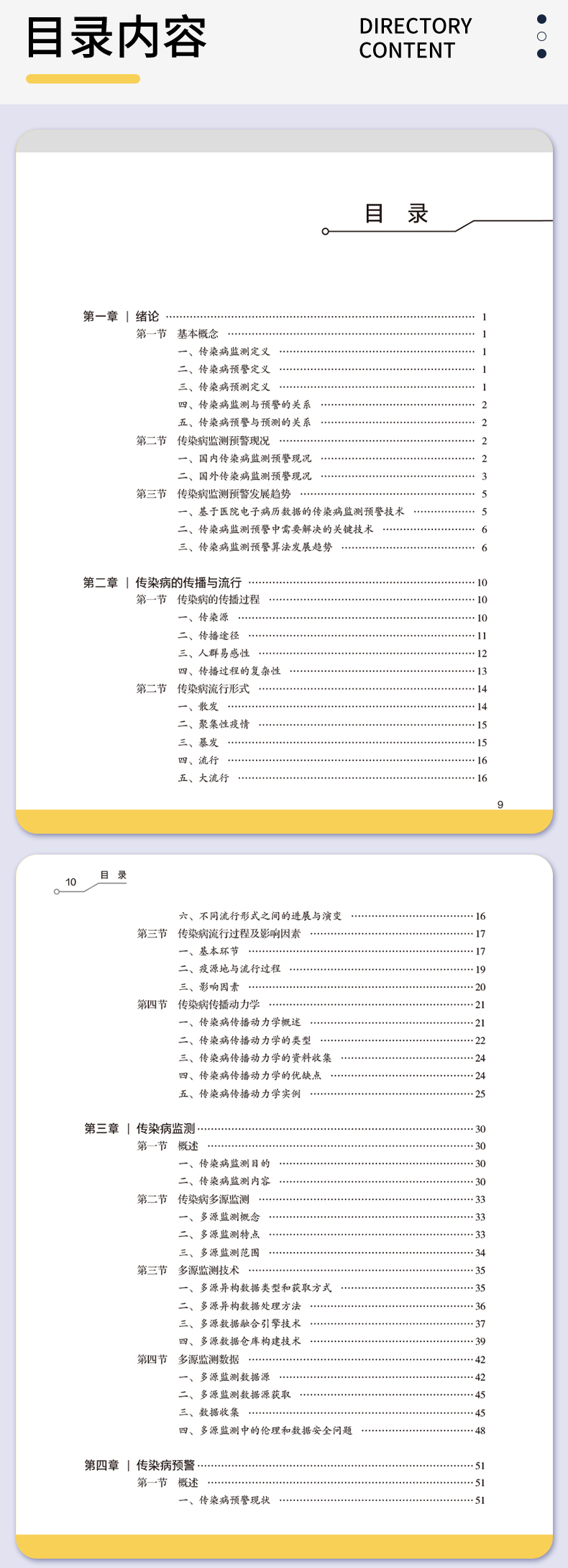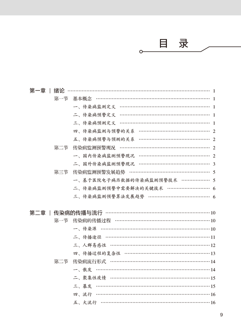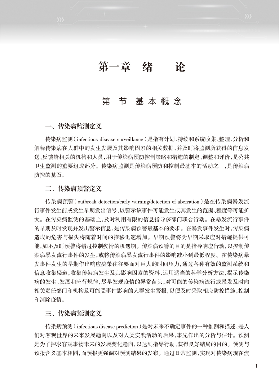 本书从传染病预防控制的重要环节监测预警出发,分为理论和实践两部分,共9章。第1~6章着重介绍传染病监测预警相关的理论知识、技术方法、预警模型、预警响应、监测数据分析管理、数智化应用等,总结梳理传统传染病监测存在的问题和不足,提出全程全域传染病多源监测的理念。根据传染病发生发展过程,针对传染病不同时段、不同层级、不同场景的分级分类预警机制,创新性提出“三三制”预警理论,开创现代传染病监测预警的理论基础。第7~9章重点围绕国内外传染病监测预警现状及相关实践,介绍全球基于网络化、信息化、数字化的传染病监测系统及应用实践,结合案例阐述传染病相关多源监测数据、信息技术、预警模型的实际应用。
