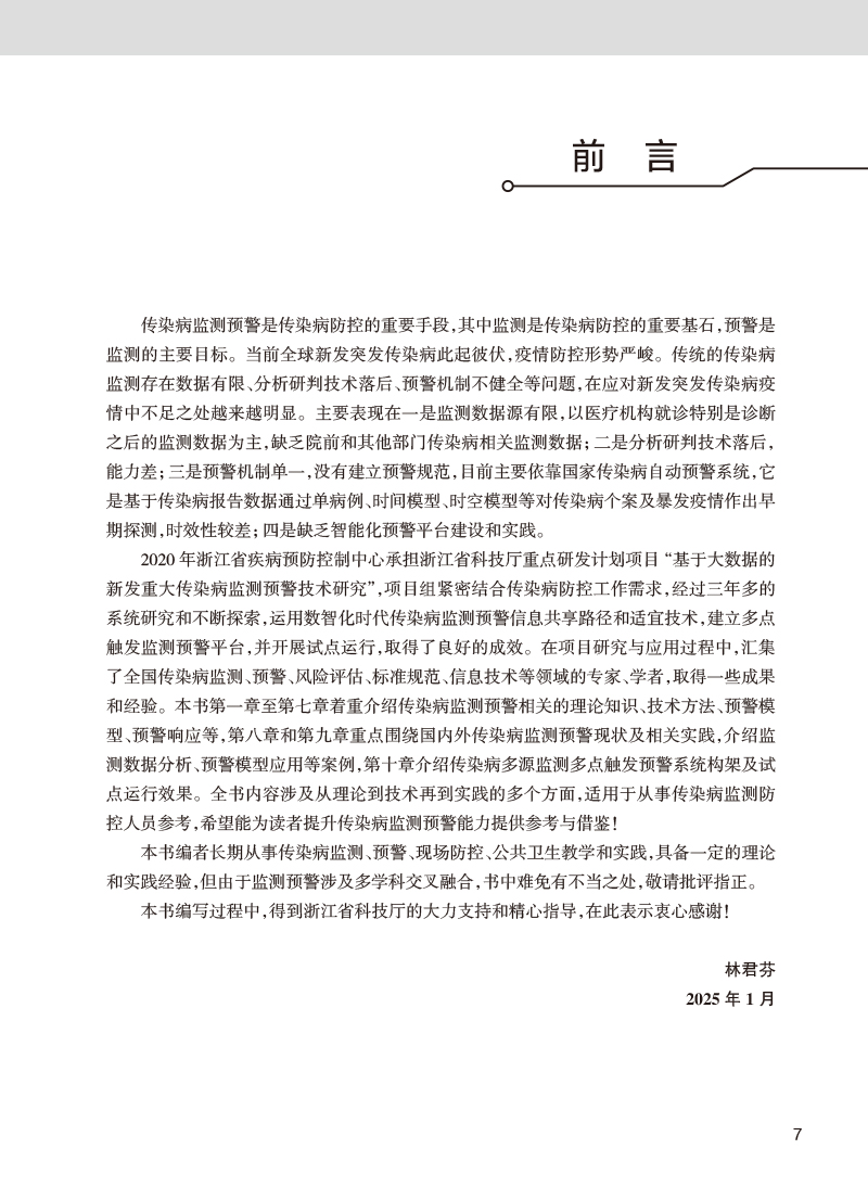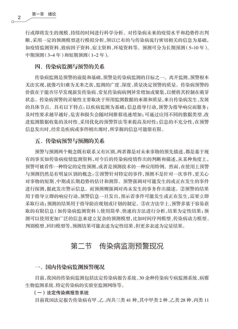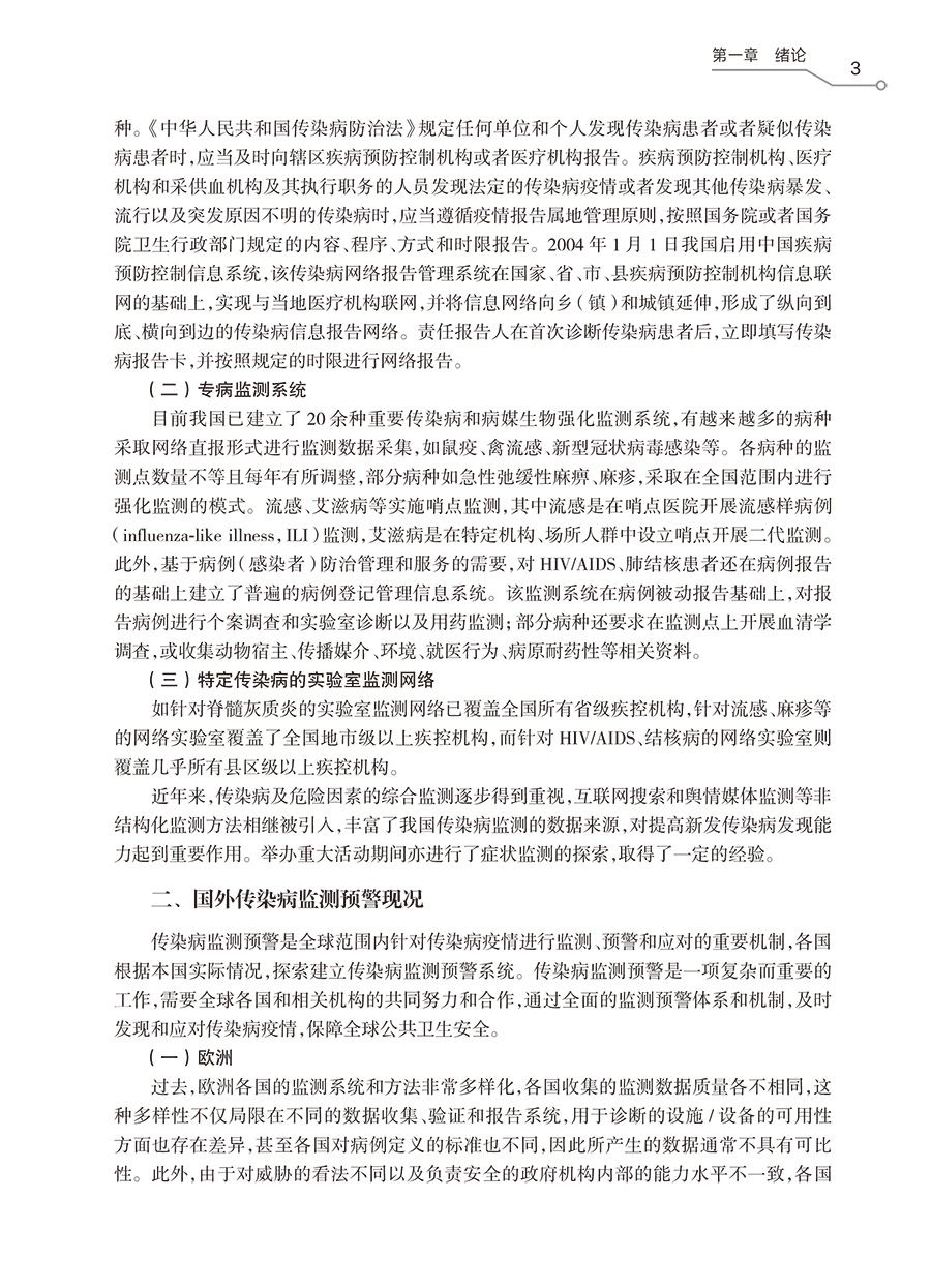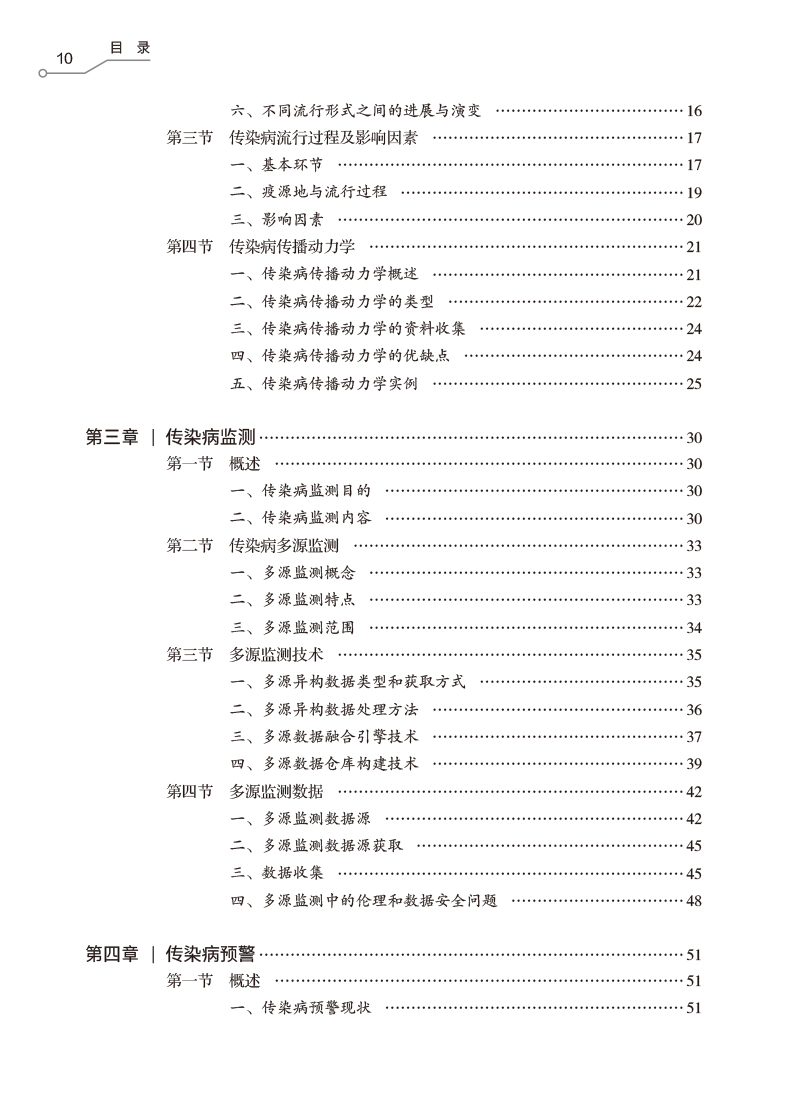 本书从传染病预防控制的重要环节监测预警出发,分为理论和实践两部分,共9章。第1~6章着重介绍传染病监测预警相关的理论知识、技术方法、预警模型、预警响应、监测数据分析管理、数智化应用等,总结梳理传统传染病监测存在的问题和不足,提出全程全域传染病多源监测的理念。根据传染病发生发展过程,针对传染病不同时段、不同层级、不同场景的分级分类预警机制,创新性提出“三三制”预警理论,开创现代传染病监测预警的理论基础。第7~9章重点围绕国内外传染病监测预警现状及相关实践,介绍全球基于网络化、信息化、数字化的传染病监测系统及应用实践,结合案例阐述传染病相关多源监测数据、信息技术、预警模型的实际应用。