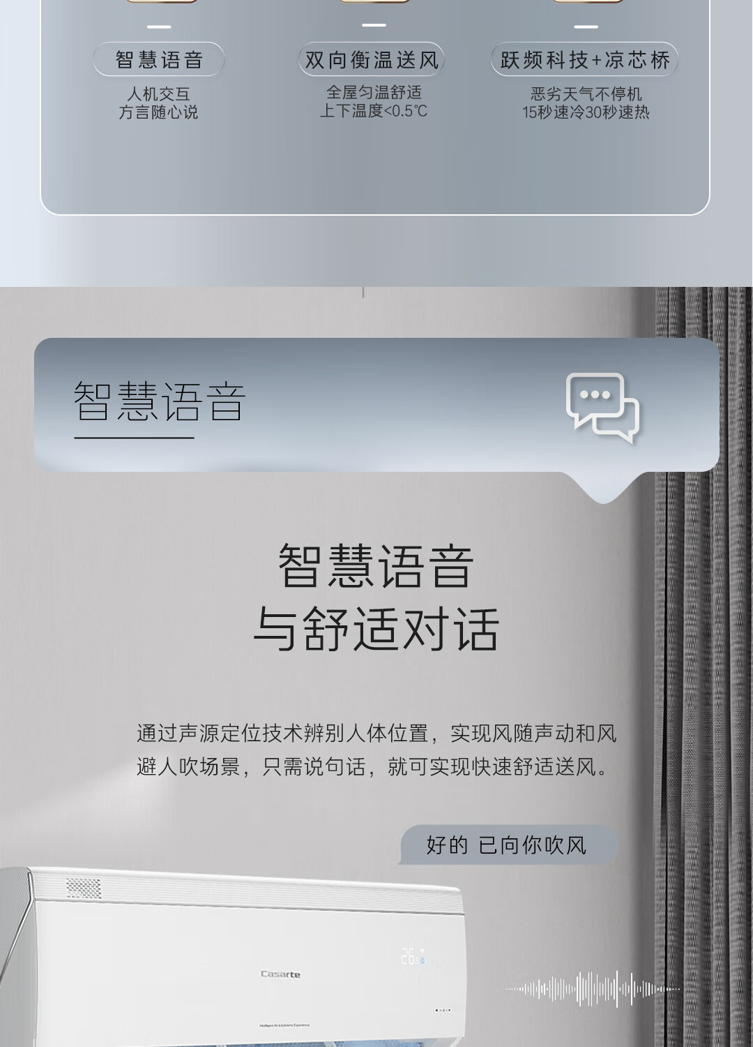 卡萨帝空调 星悦1.5P挂机 智慧语音控制 通过声音定位送风 离线唤醒 OTA在线升级 62℃高温制冷 双向衡温送风 15秒速冷 一级能效 CAS3523FCB(81)VU1