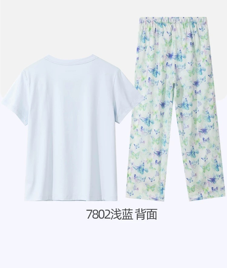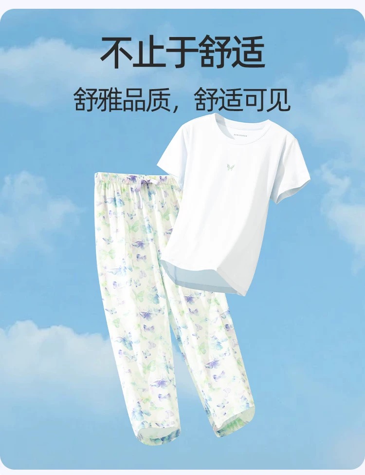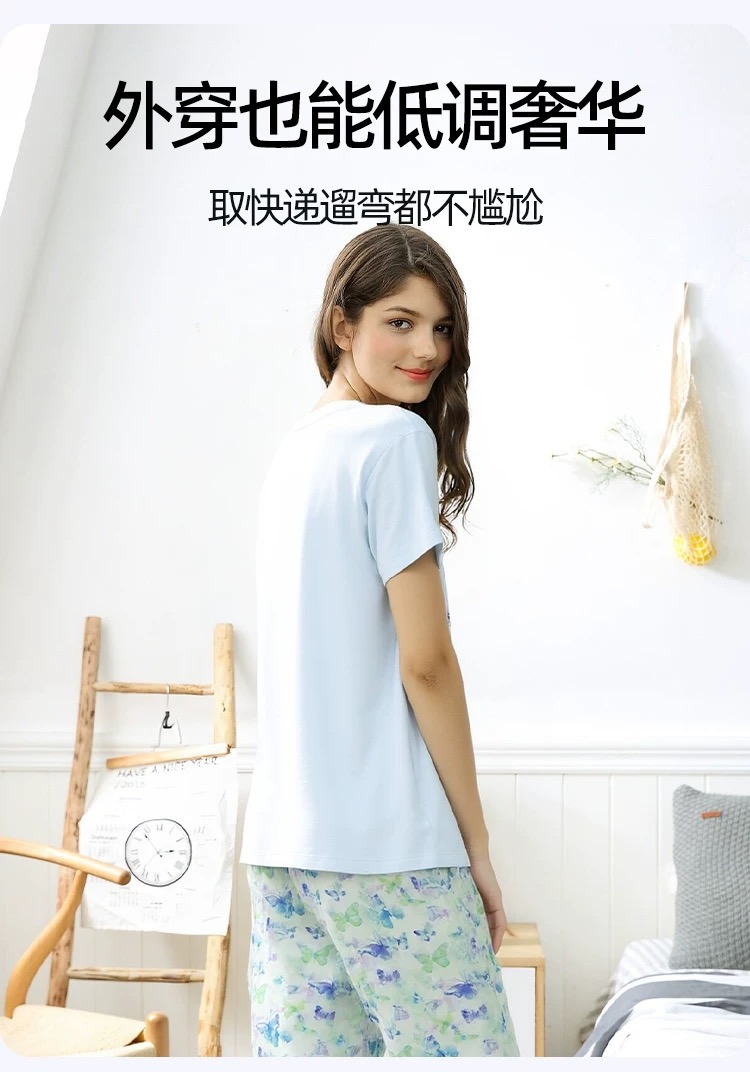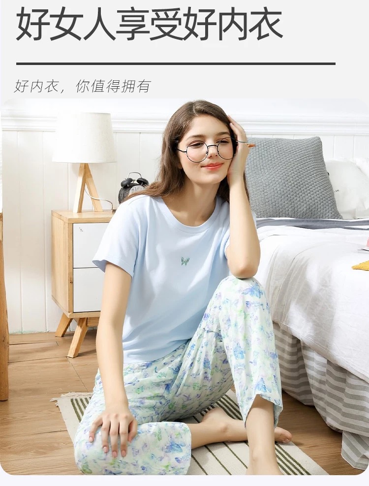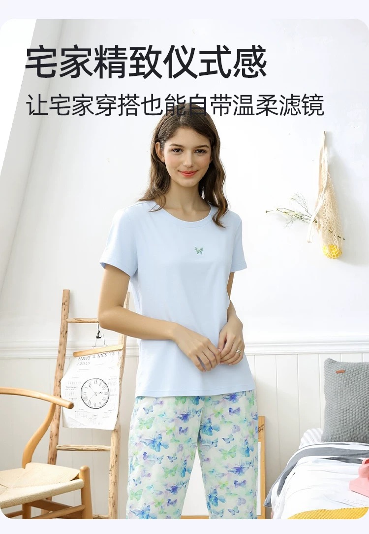 【时尚家居服系列】舒雅女短袖九分裤套装上衣:棉莫单面 50%棉 50%莫代尔 32S 单面 150g/m2 裤子:100%棉 80X80 165X105 31/26420H