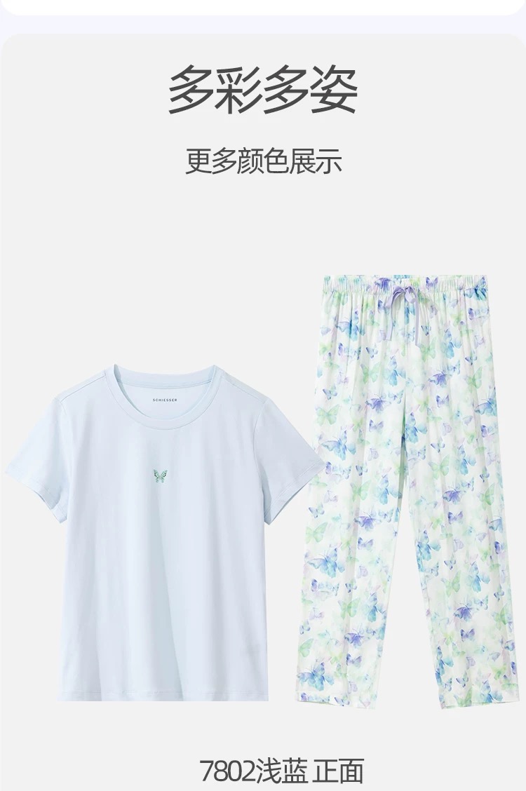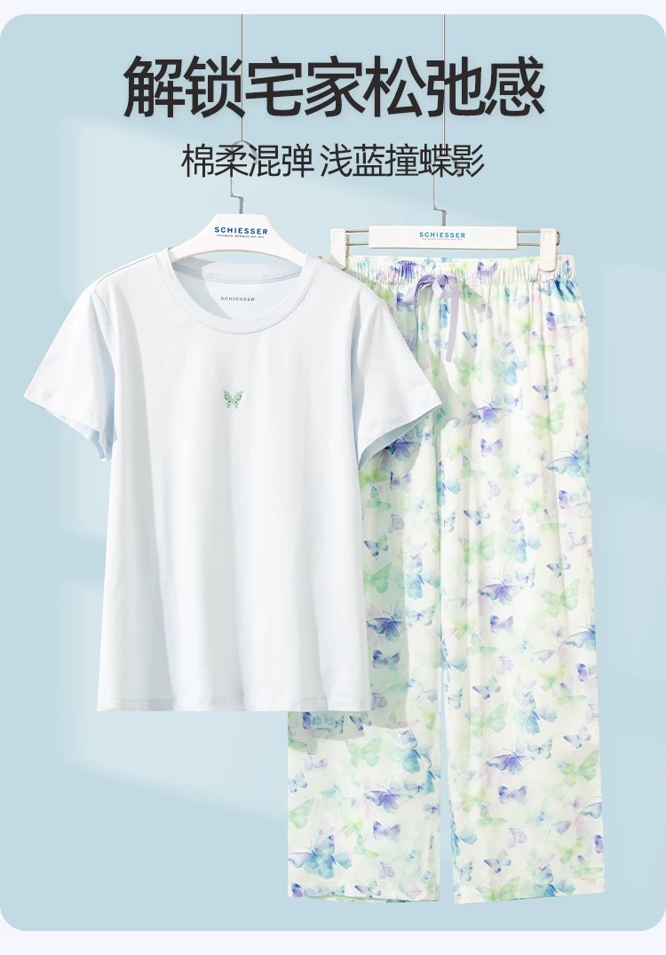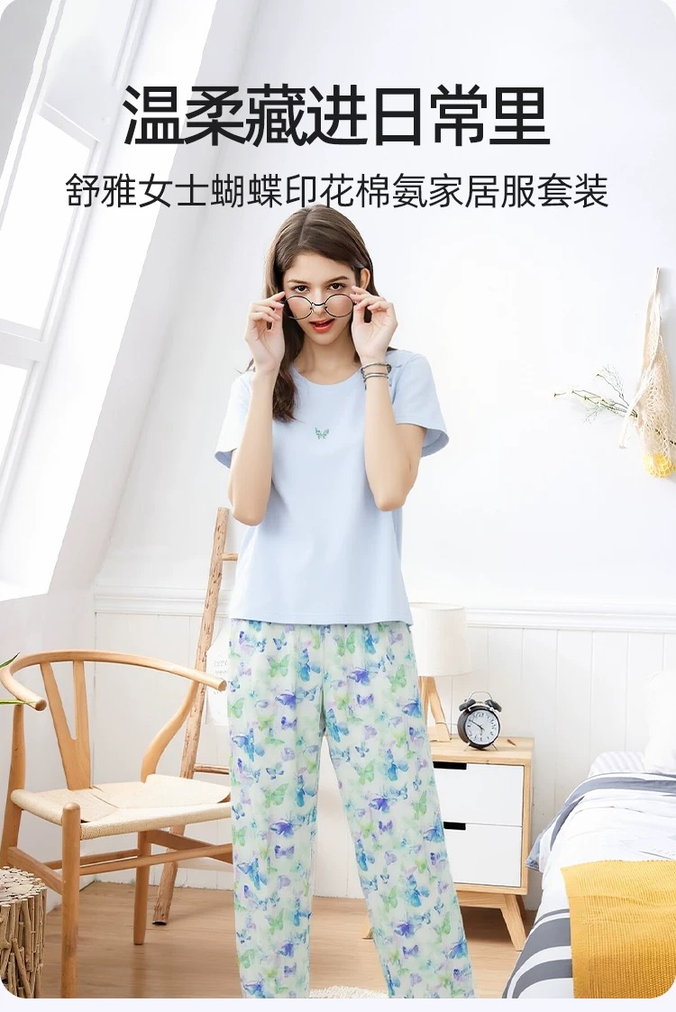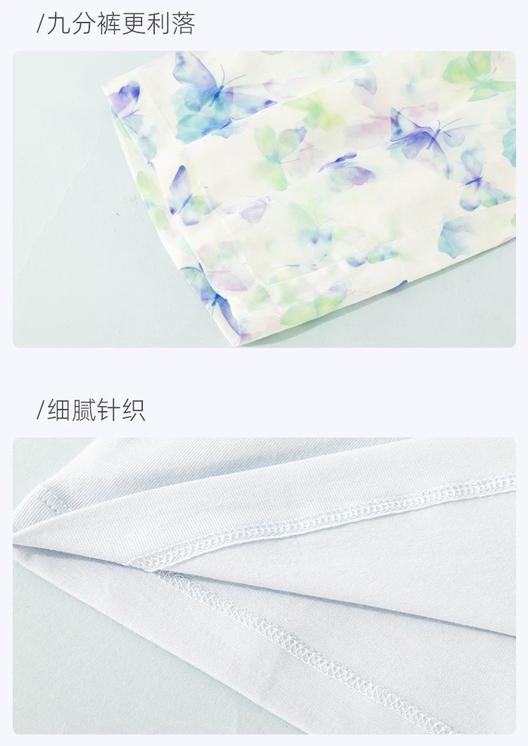 【时尚家居服系列】舒雅女短袖九分裤套装上衣:棉莫单面 50%棉 50%莫代尔 32S 单面 150g/m2 裤子:100%棉 80X80 165X105 31/26420H