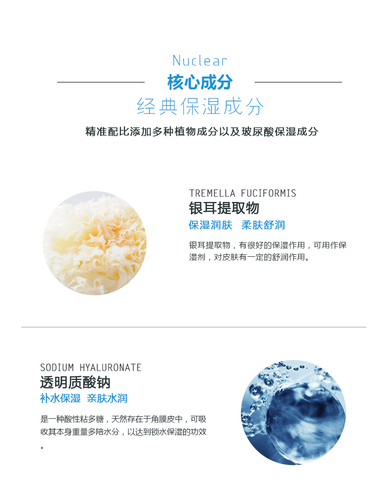 采用雪耳提取物哦,银耳多糖传说中的植物玻尿酸,肤感效果要比玻尿酸更丝滑,为让肌肤成水库,辅助大小分子玻尿酸,锁水补水保水一滴水也不许逃掉,水库级别的。另外雪耳可以肌底生津!