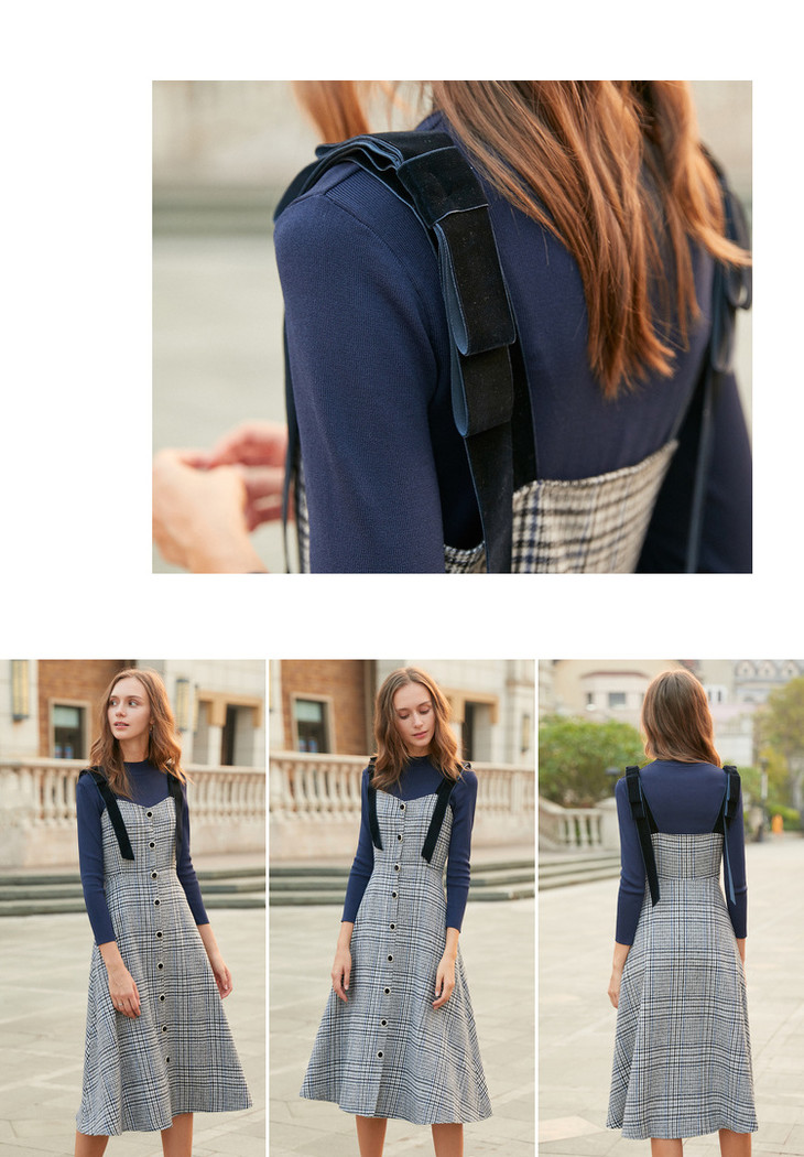 欧芮儿毛呢连衣裙女套装秋冬女2019吊背带格子女裙两件套