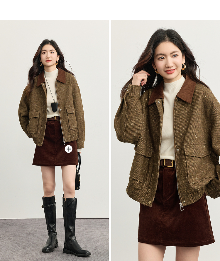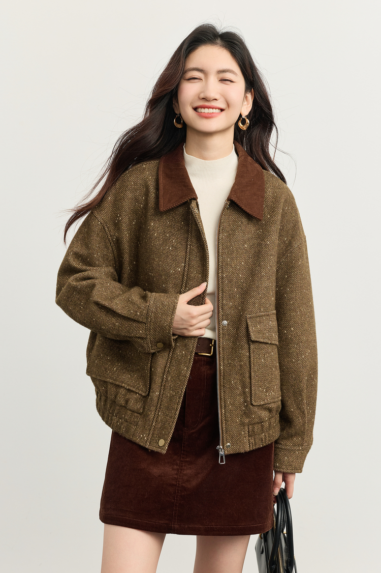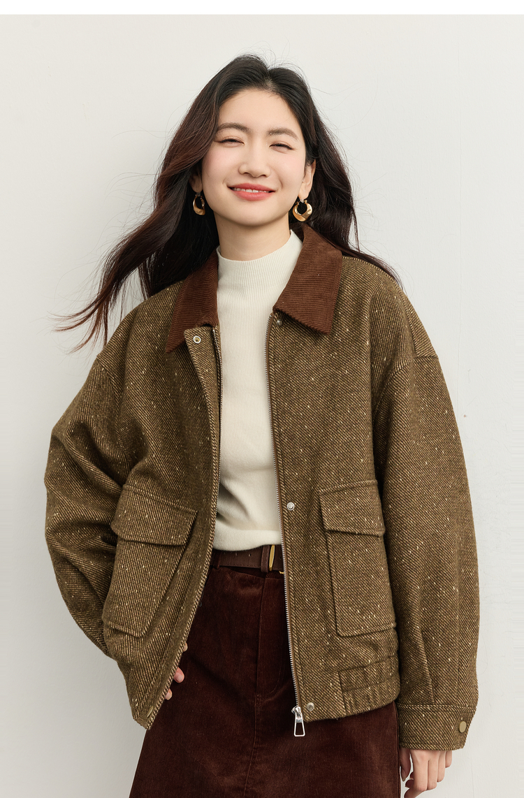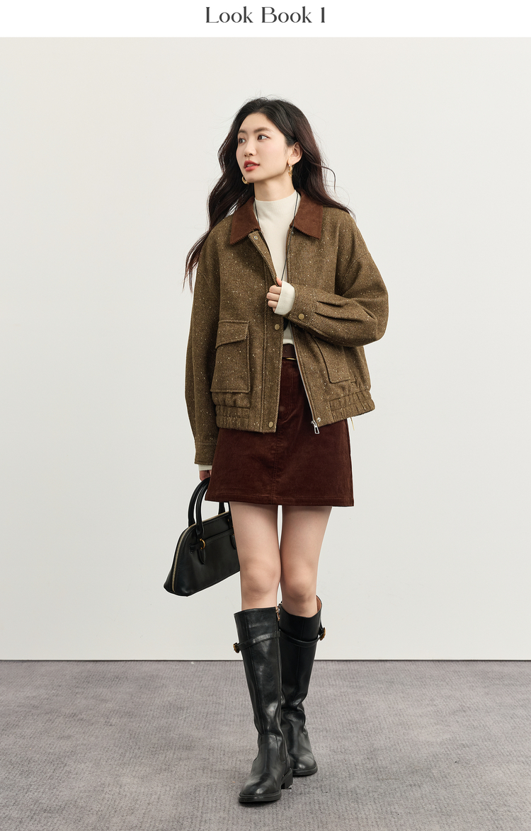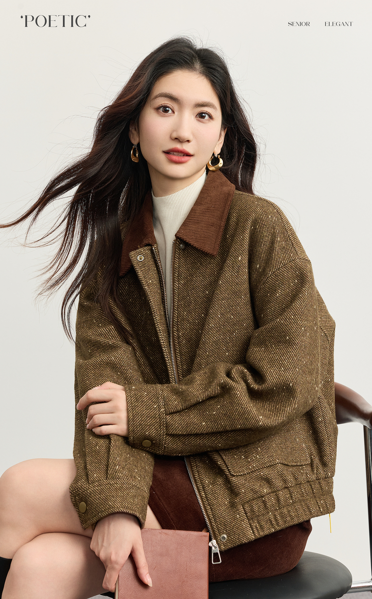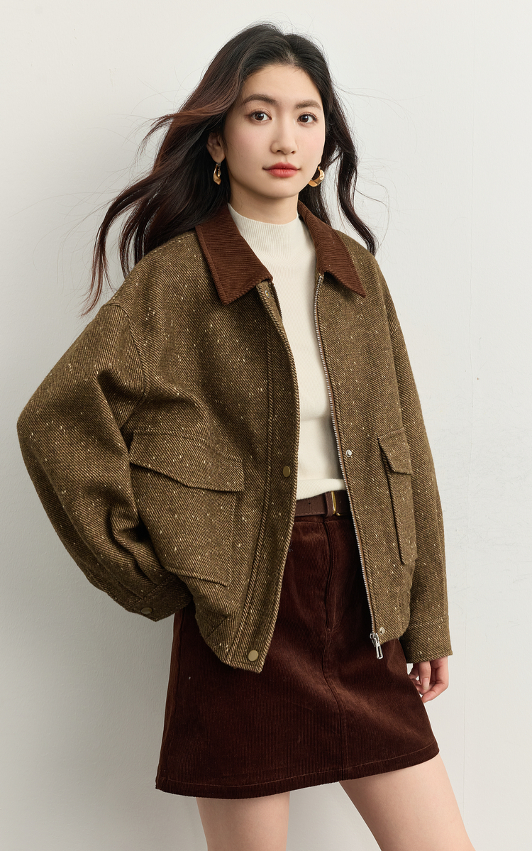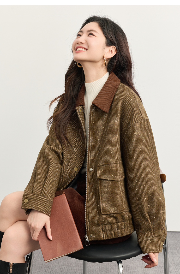 【10/29新品】熙世界复古茶棕花苞夹克羊毛短外套女秋冬巴恩风穿搭撞色翻领上衣