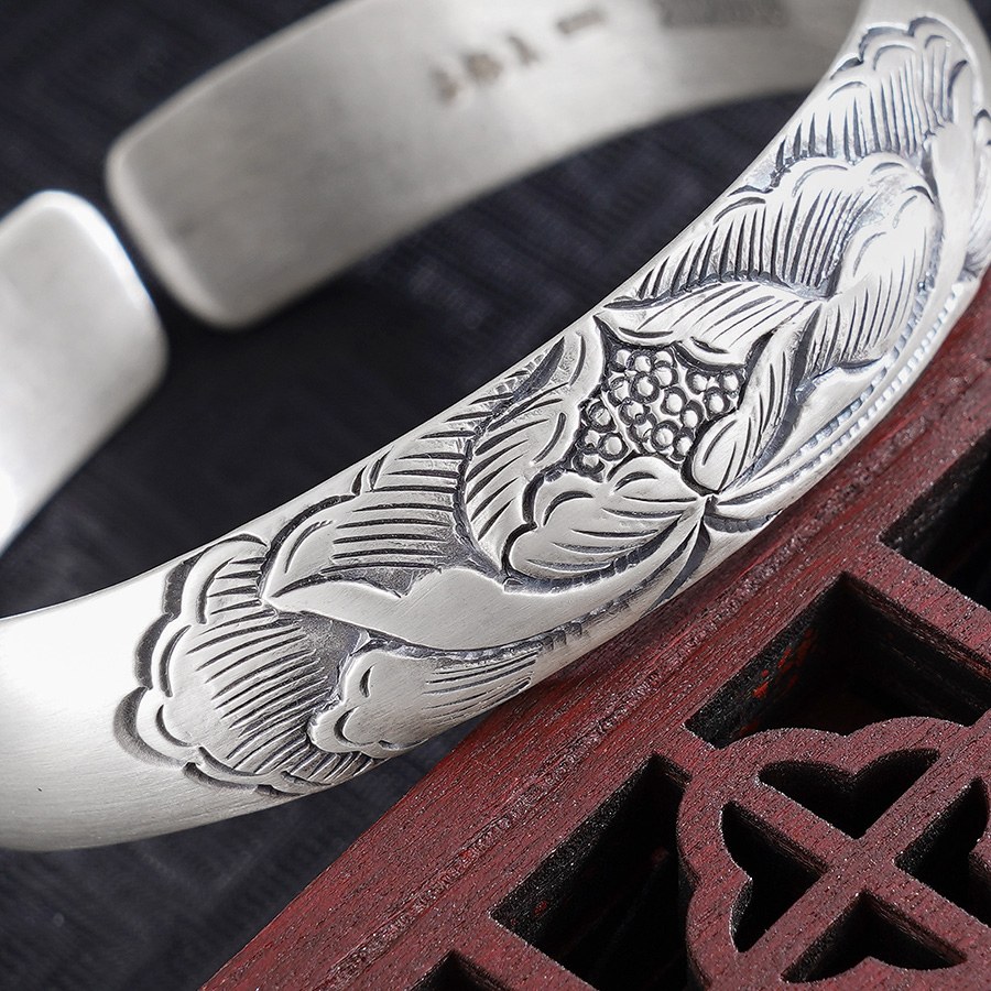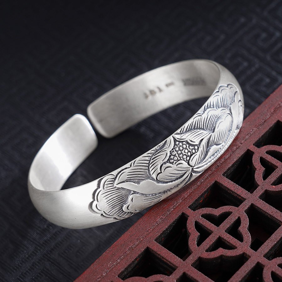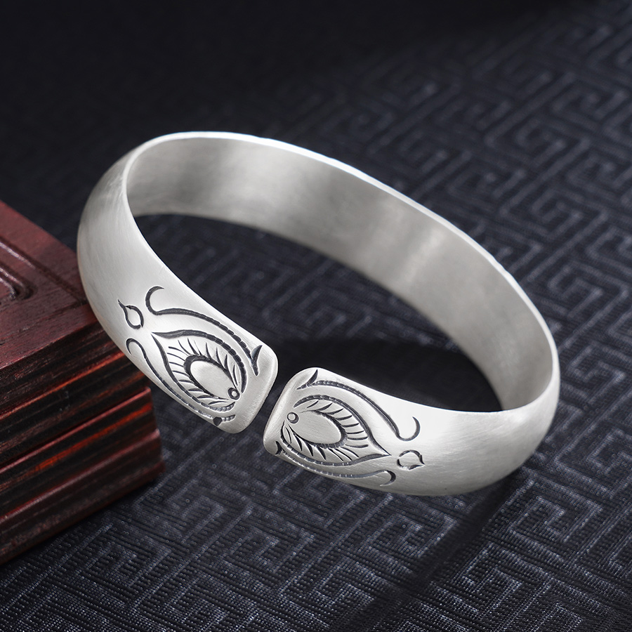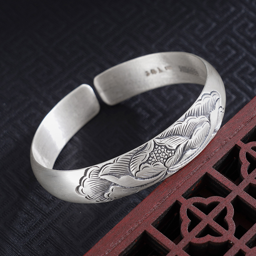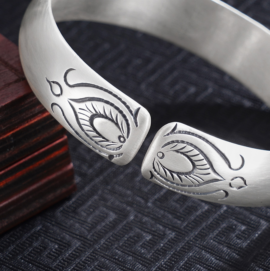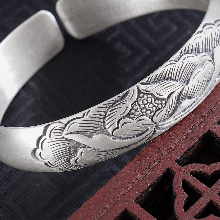 【寓意】:子佩集匠心手作银镯,采用成都金银器制作技艺,于手镯之上錾刻莲花纹饰,寓意莲开好运,静享幸福光阴。