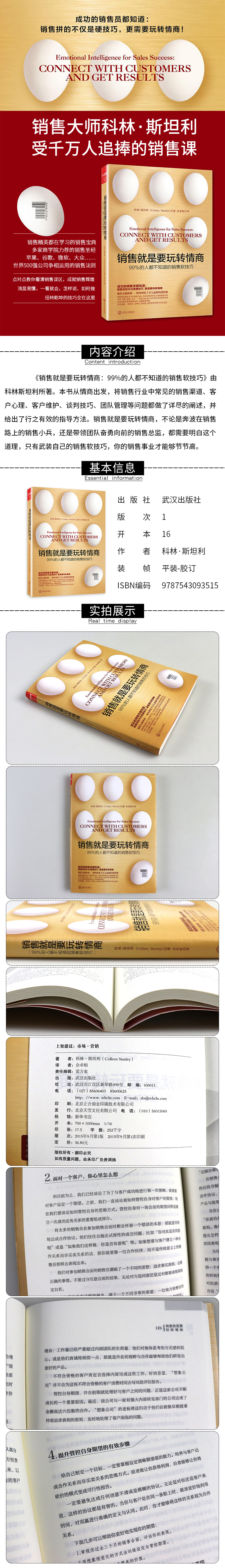 《销售就是要玩转情商:99%的人都不知道的销售软技巧》由科林斯坦利所著。本书从情商出发,将销售行业中常见的销售渠道、客户心理、客户维护、谈判技巧、团队管理等问题都做了详尽的阐述,并给出了行之有效的指导方法。 该书内容深入浅出,在情商销售理论的基础上,将经典案例与操作方法相结合,揭示了情商对销售工作的影响和作用,强调情商软技巧的重要性。本书从销售员及销售行业中常见的困境入手,以事例做对比将销售困境出现的原因进行深刻剖析,并结合各销售问题给出了对应的解决方法,让读者看清销售误区,从自身情绪管控入手,改变目前的销售现状,成就销售辉煌。 销售就是要玩转情商,不论是奔波在销售路上的销售小兵,还是带领团队奋勇向前的销售总监,都需要明白这个道理,只有武装自己的销售软技巧,你的销售事业才能够节节高。