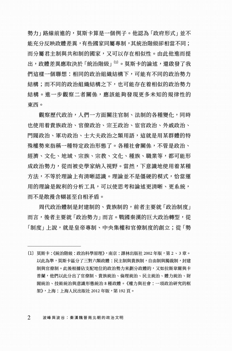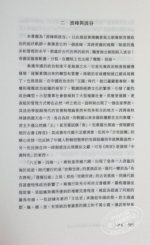 以「政治常態」作為中軸線,兩千年的政治制度變遷可以構成一個波形圖,中央集權強盛階段,呈現「波峰」;中央集權衰弱階段,顯現「波谷」。本書題為「波峰與波谷」,以此描述秦漢魏晉南北朝專制官僚政治的起伏軌跡。秦漢是一個波峰,其時帝國的規模、制度的進步和管理的水平,都處於古代世界的前列;魏晉南北朝則陷入波谷:帝國面臨着動盪、分裂,在體制上也出現了變態、扭曲。