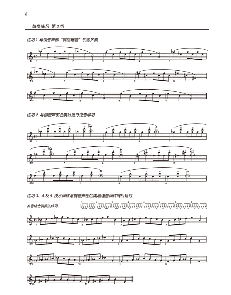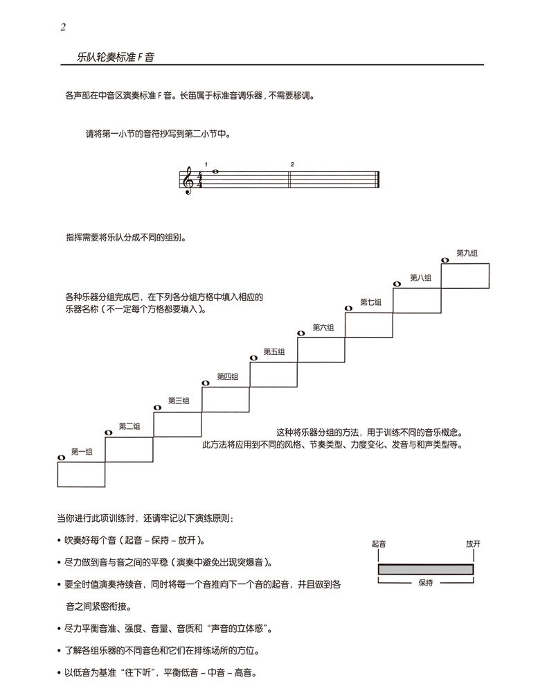 《管乐队标准化热身训练教程》旨在更好地组织日常排练和改进整个乐队的全面演奏水平。无论每天的排练时间仅5分钟,或是每天45分钟,这套教程能为处于任何水平、任何条件和状态的乐队提供机动性良好的排练选择,同时也能为广大乐队指挥们提供能适应每个学生的不同演奏水平的训练素材,并能很好的激励每一个学生为了掌握更高水平的演奏技能而努力训练。《管乐队标准化热身训练教程》共17册,分为长笛、双簧管、大管、单簧管、低音单簧管、高音单簧管、中音萨克斯管、高音萨克斯管、次中音萨克斯管、小号、圆号、长号、次中音号(高音谱号)、次中音号(低音谱号)、大管、打击乐与总谱。