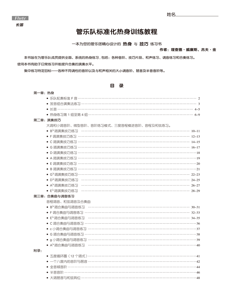 理查德•威廉斯及杰夫•金曾同时任教位于美国得克萨斯州的邓坎维尔中学。该校多次赢得全美比赛奖项,并被视为管乐教学界的楷模。本书的创作便基于这一背景。理查德•威廉斯毕业于辛辛那提大学及北得克萨斯州大学音乐学院。他以萨克斯管演奏家身份参与达拉斯职业乐团、达拉斯爵士乐团、达拉斯萨克斯管重奏团及新爱乐交响乐团等。身为DISD爵士乐队导师的他,同时也是中学初级管乐团及木管乐分部的教练。在他任职邓坎维尔伯德中学乐队期间,他的乐队获得一致好评,多次获奖,并三次入选得州荣誉乐团总决赛。杰夫•金毕业于南方循道大学小号演奏专业,还获得保云•伟勒学院音乐教育专业文凭。他是美国得州达拉斯、邓坎维尔区高中第九中学管乐总监。所带乐团多次获得最佳视奏、演奏及全州荣誉大奖等奖项。他经常受邀在美国及加拿大举办讲座并担任赛事评委。他的工作与得州音乐教育联会、得州音乐评委会、得州管乐指导者协会及美国管乐协会等有密切联系。《管乐队标准化热身训练教程》是理查德•威廉斯及杰夫•金在乐团教学上取得成就的重要因素,也是美国优秀管乐教育系统的根基性教材。