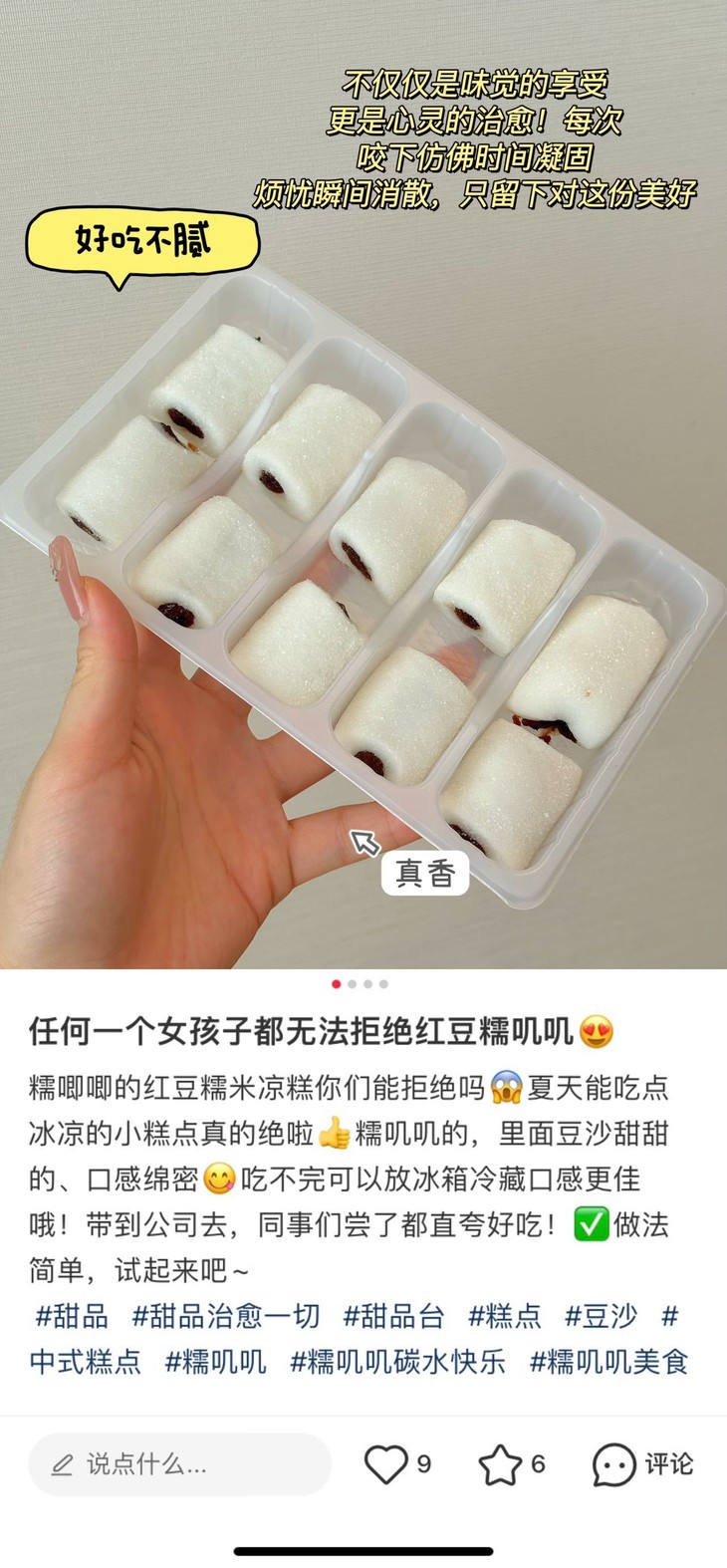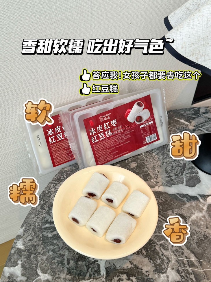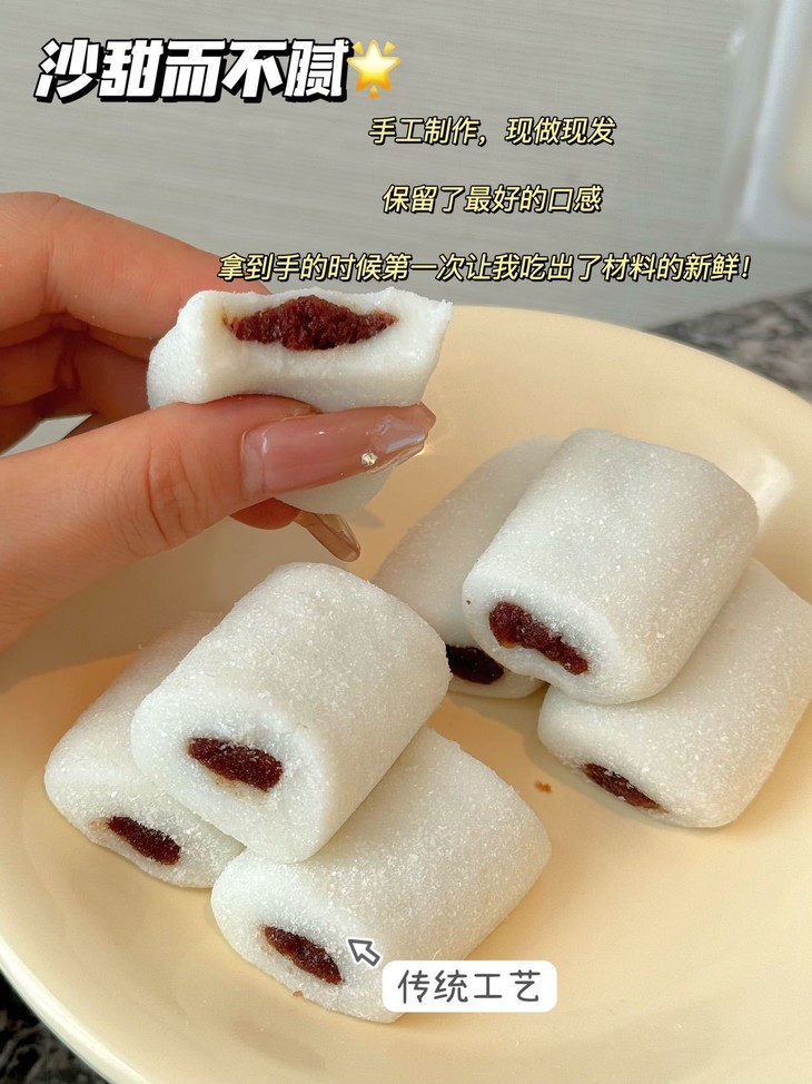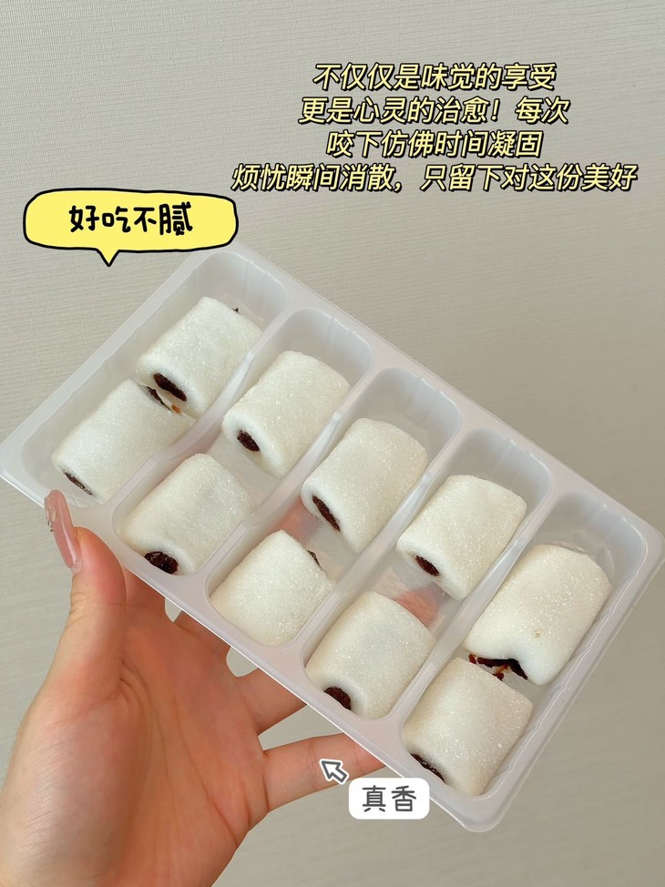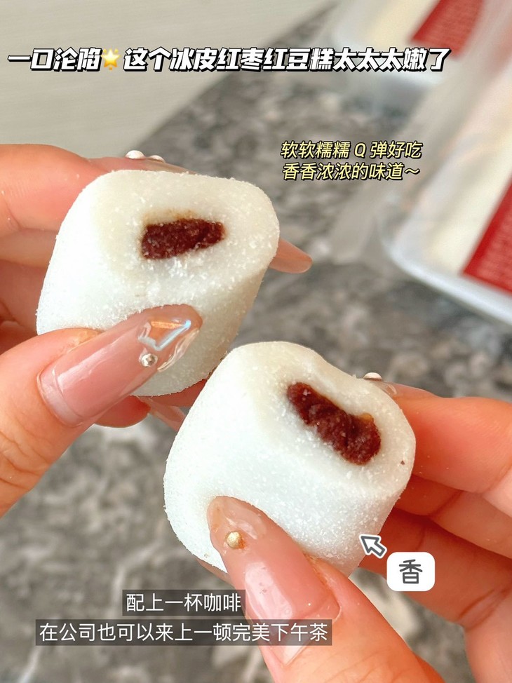 外衣是软糯糯 QQ弹弹的,里面是裹着一层红枣豆沙 还有点浓浓的椰蓉香 甜而不腻~ 有种吃麻薯糯米团的感觉🥰 放冰箱里冷藏一会 冰冰凉凉的 超nice~ 上班的时候带上一条,直接就是一份精致下午茶