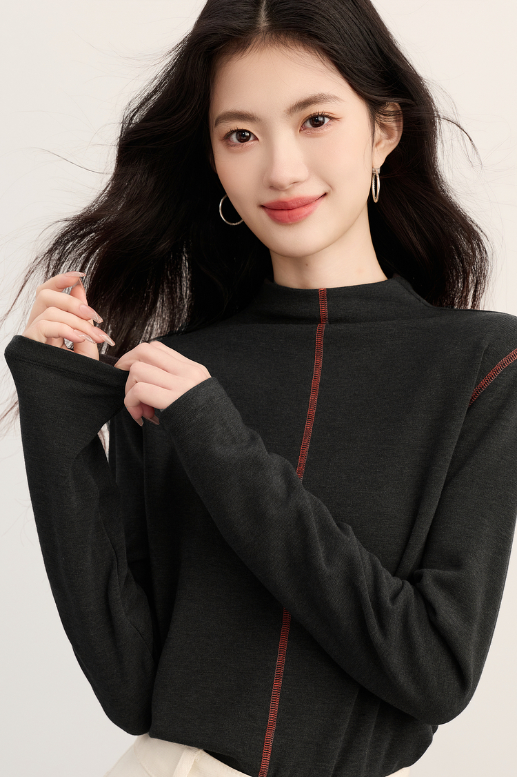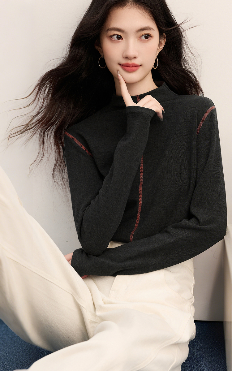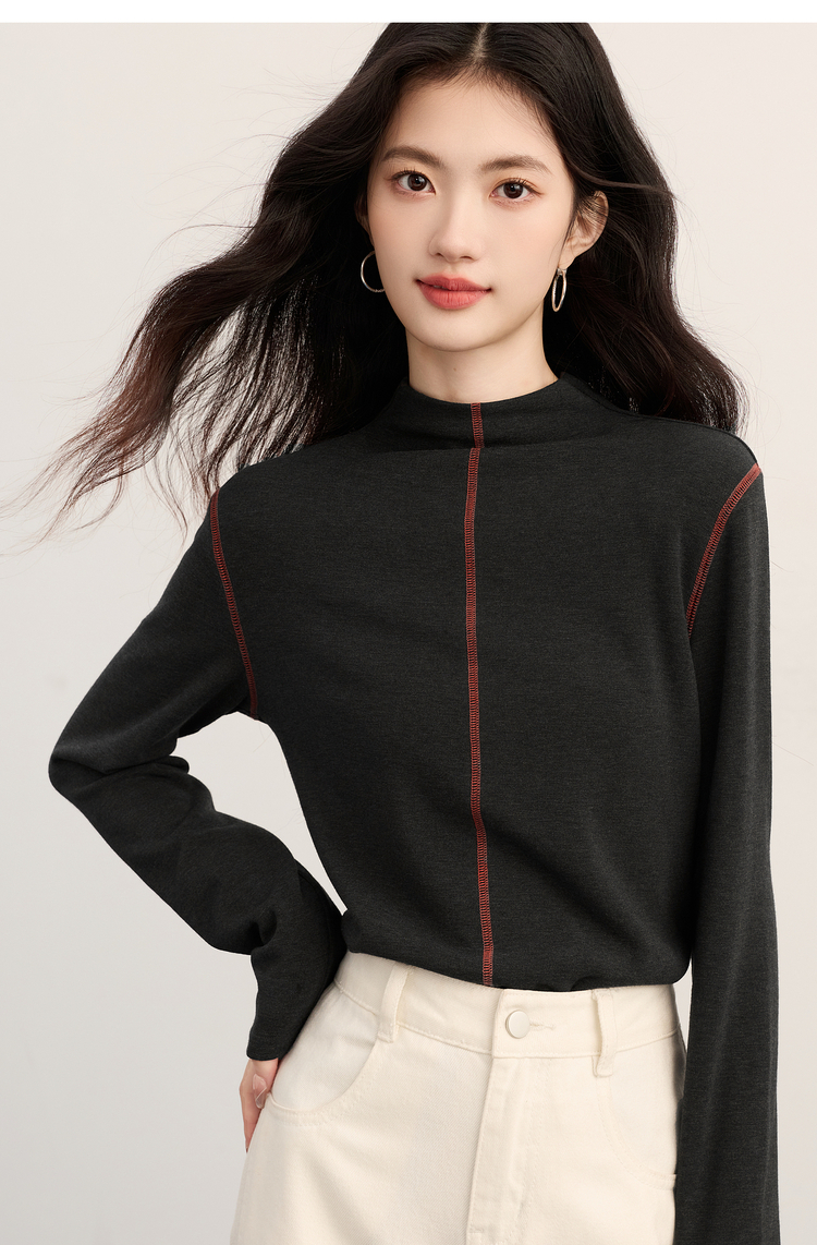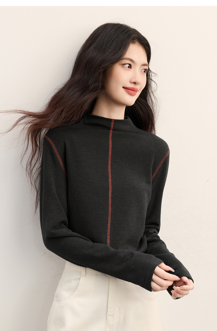 【11/26新品】熙世界明线撞色半高领打底衫女2025秋冬新款弹力保暖内搭T恤上衣