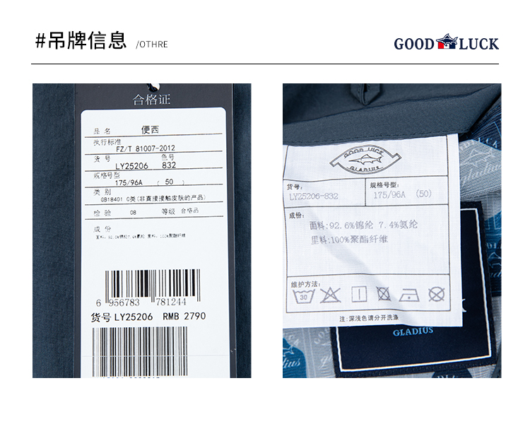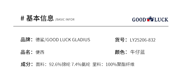 - GOOD LUCK GLADIUS品牌由“浙江德鲨服饰有限公司”引进中国市场,经过多年发展,凭借完善的终端形象,规范化的销售管理,迅速赢得消费者的认可,引领国内消费流行,是成功人士首选男装品牌。