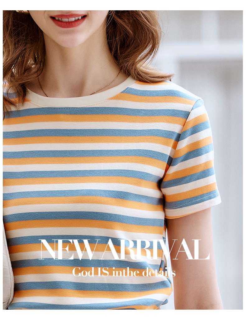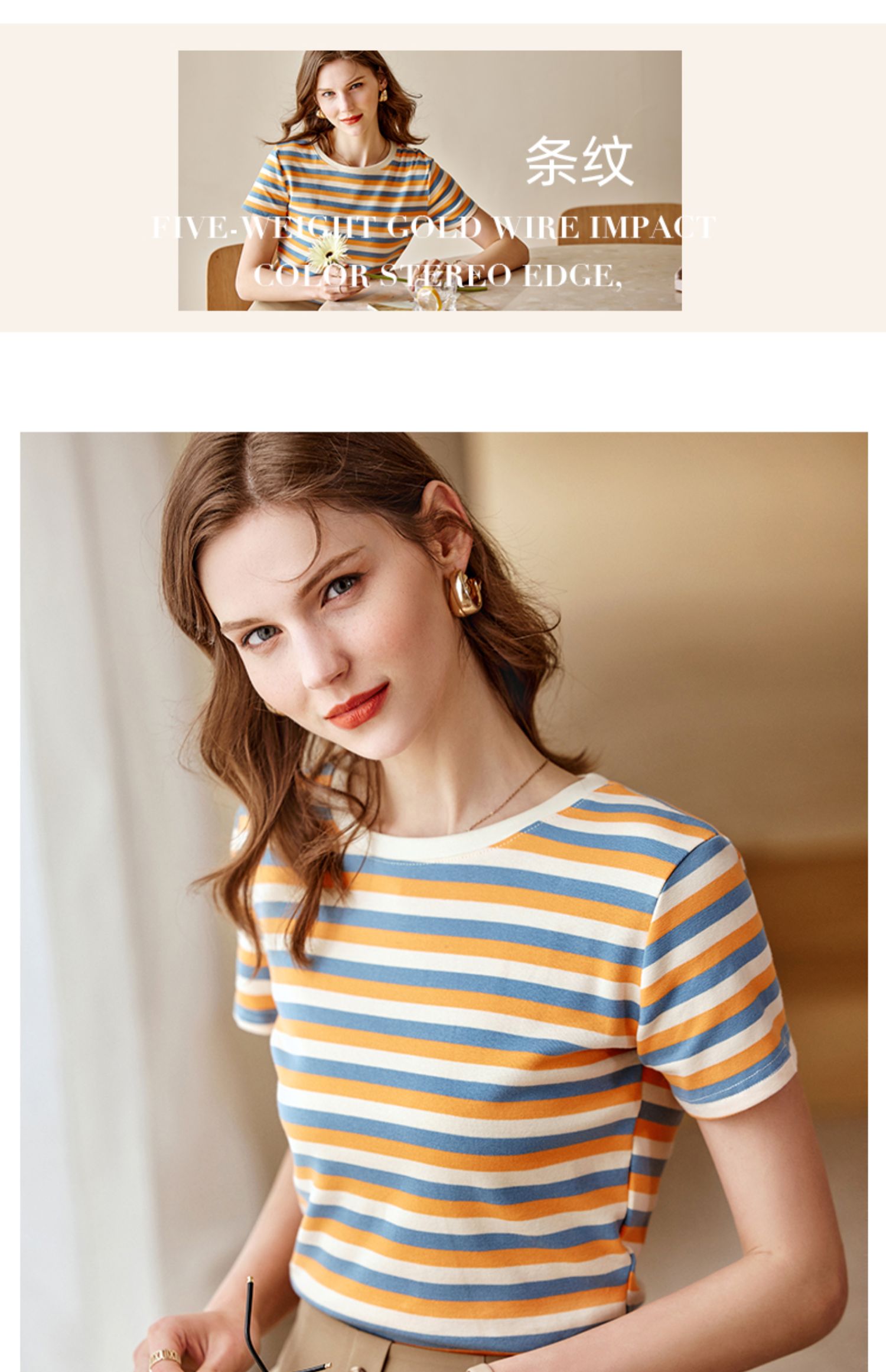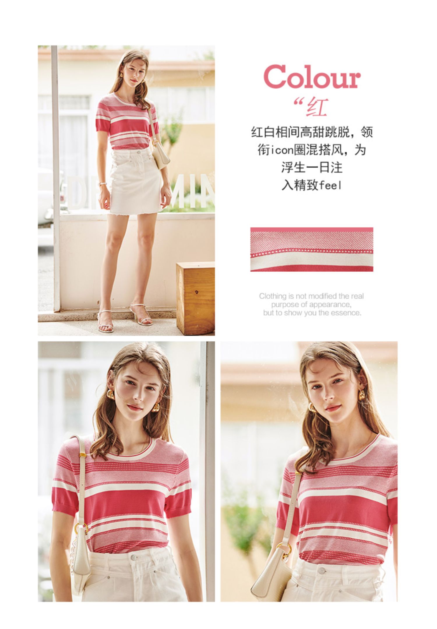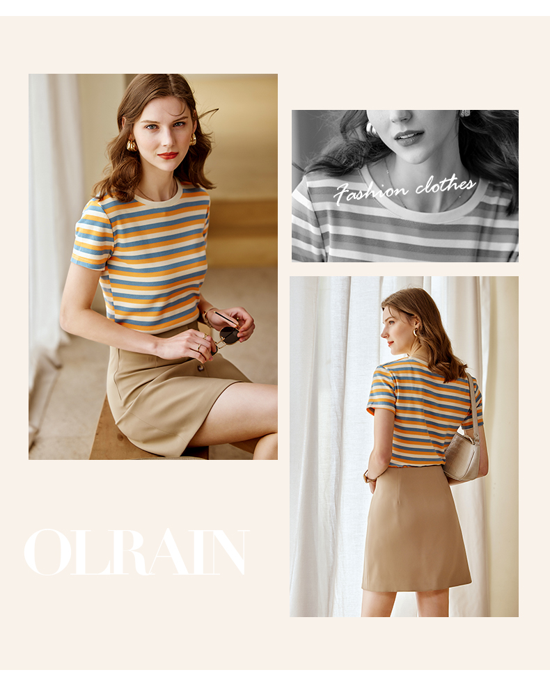欧芮儿短袖针织t恤女冰丝薄款条纹夏季新款2025圆领休闲套头上衣