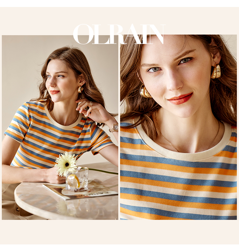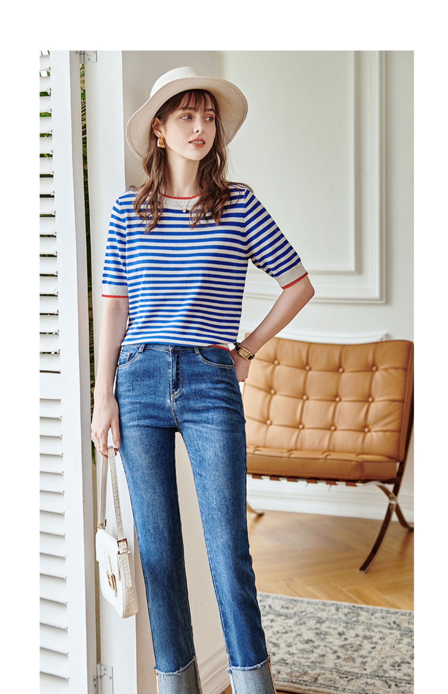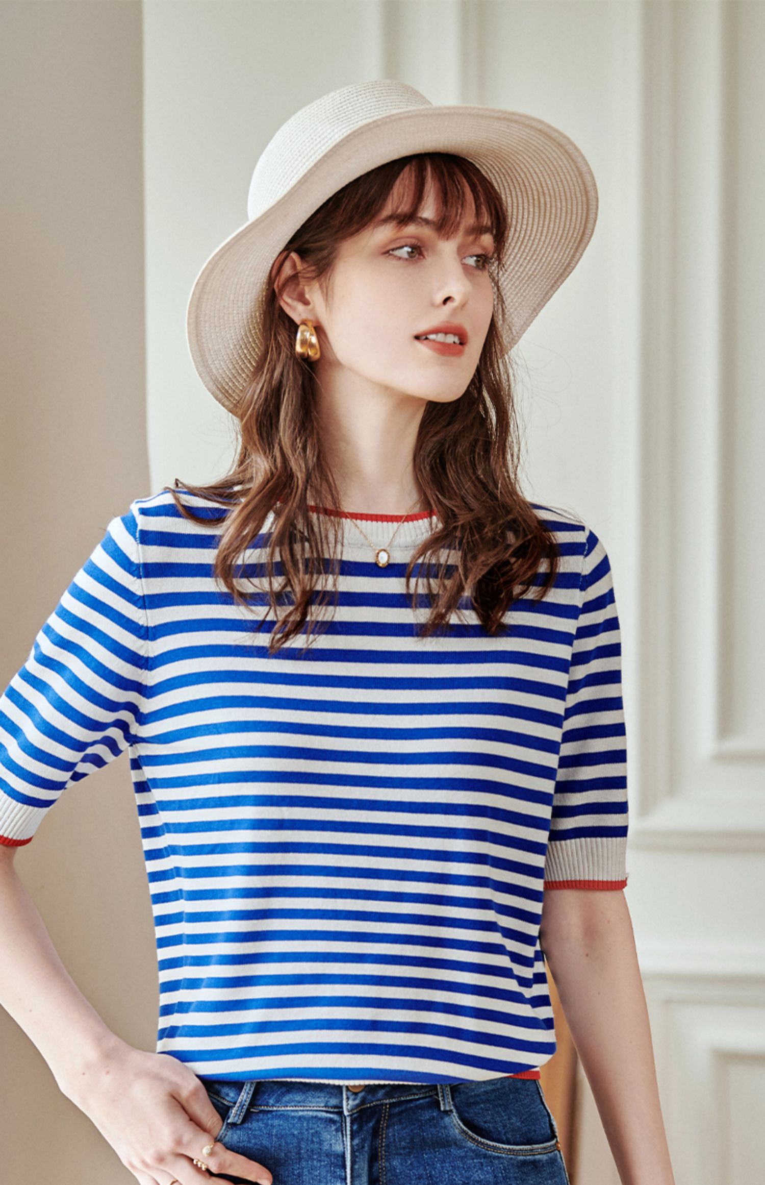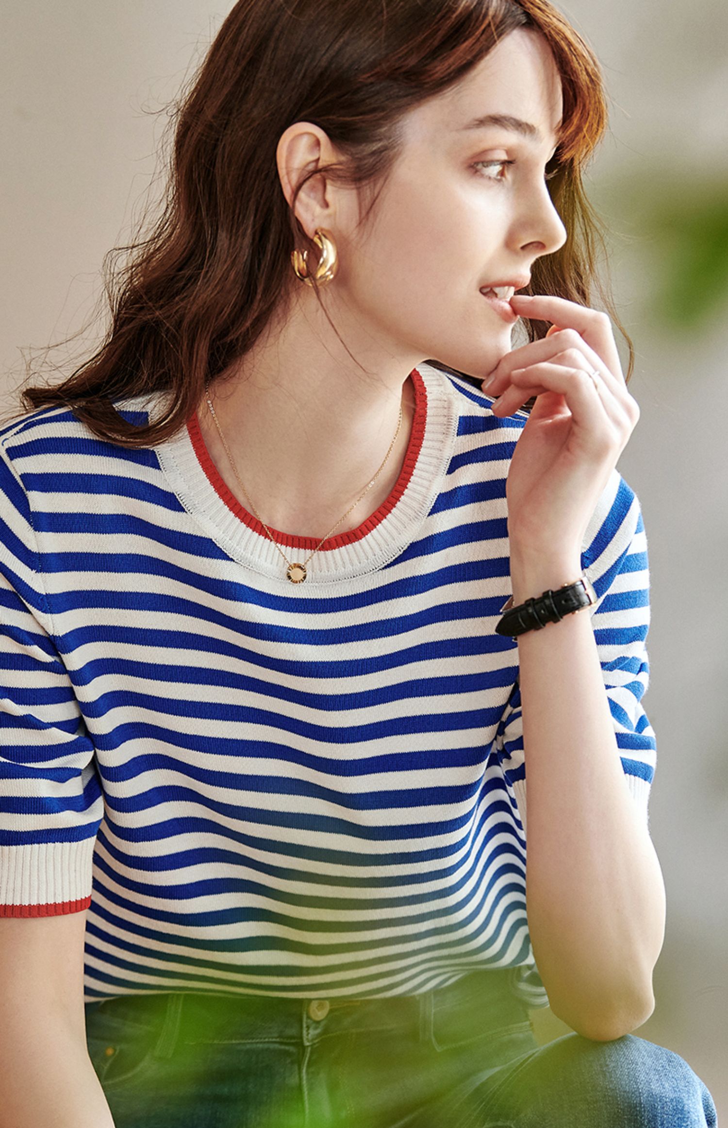 欧芮儿短袖针织t恤女冰丝薄款条纹夏季新款2025圆领休闲套头上衣