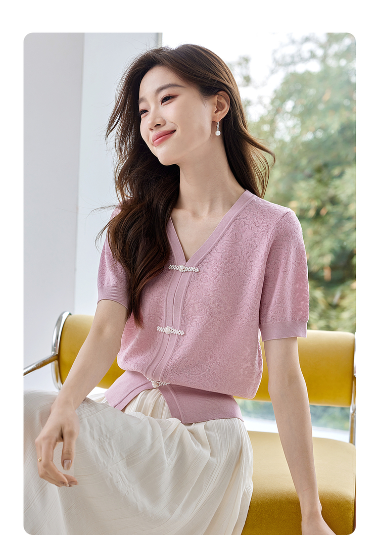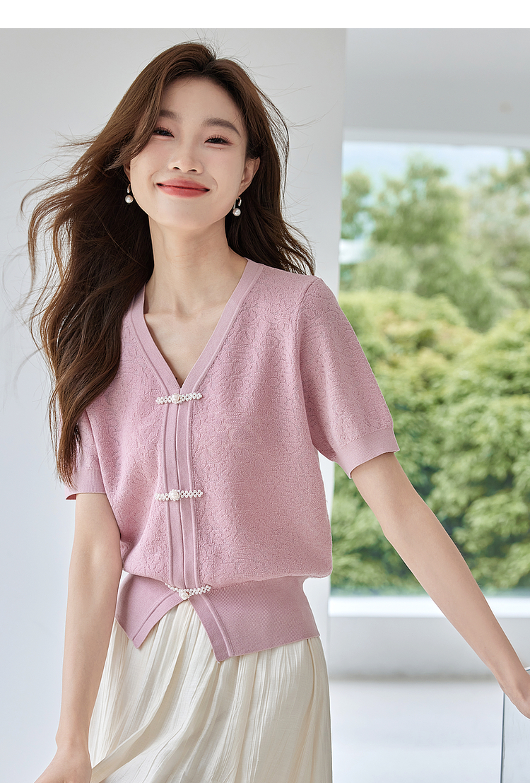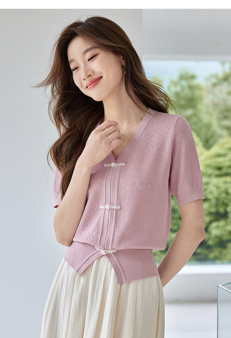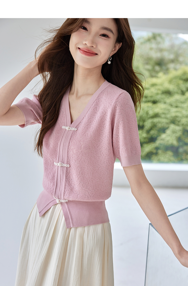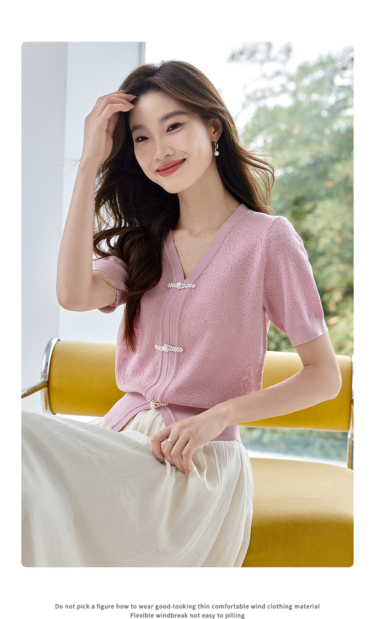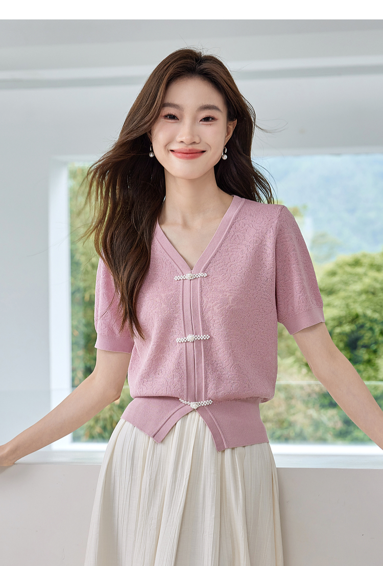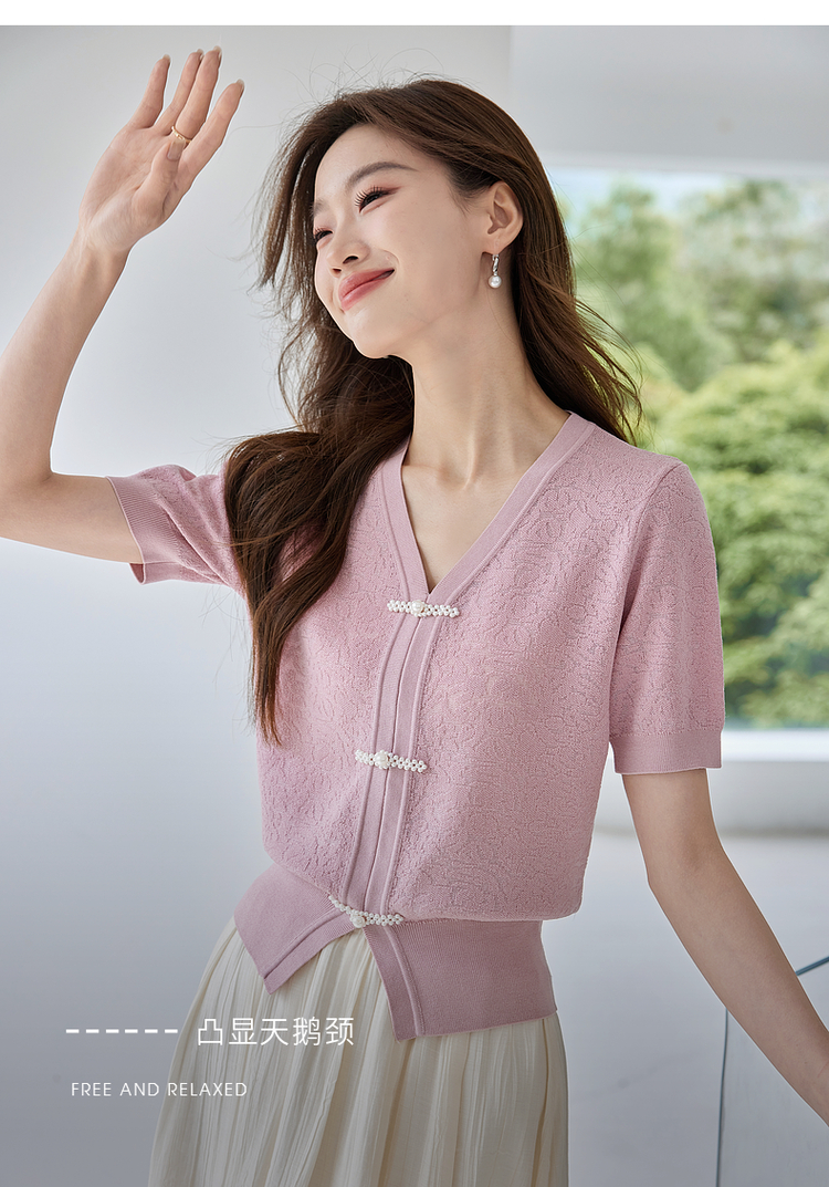 【专属特价】熙世界新中式盘扣V领冰丝针织衫夏季新款套头短袖国风上衣薄款