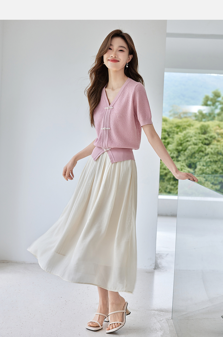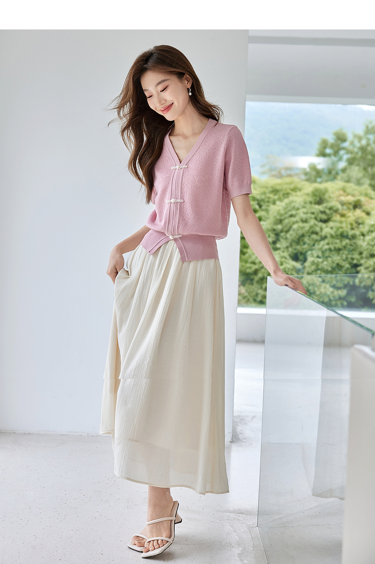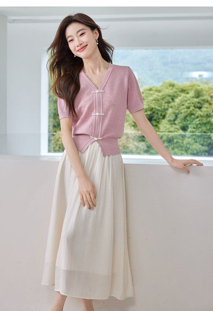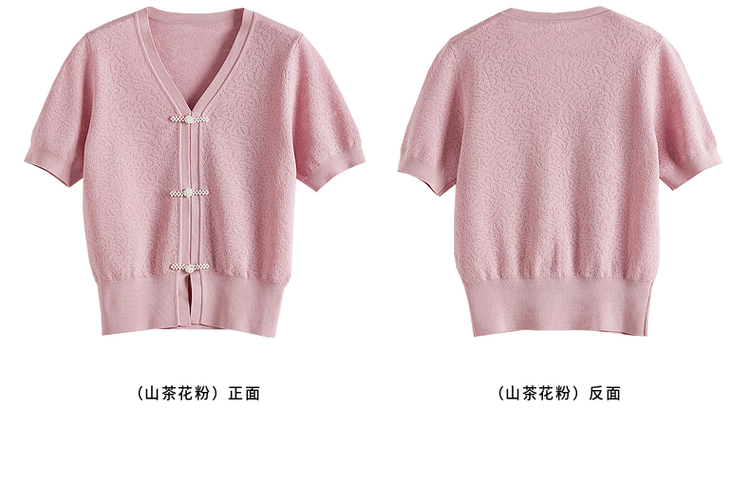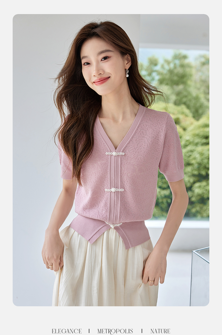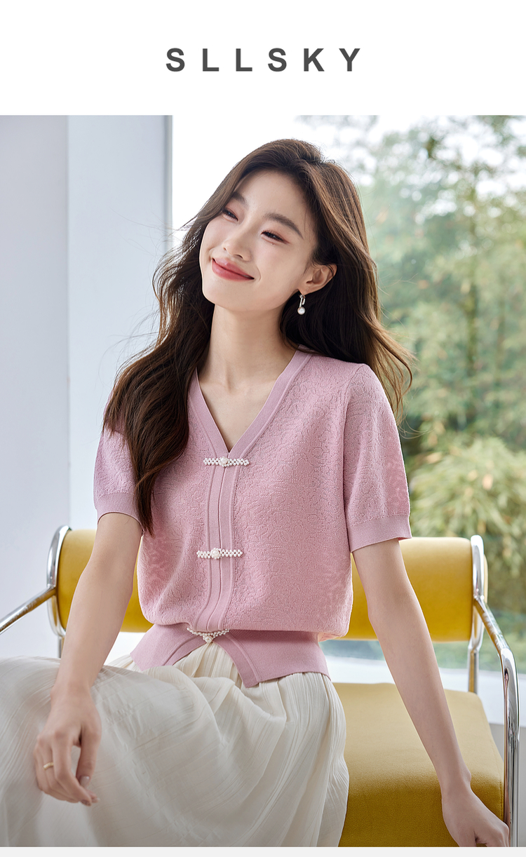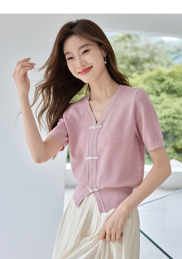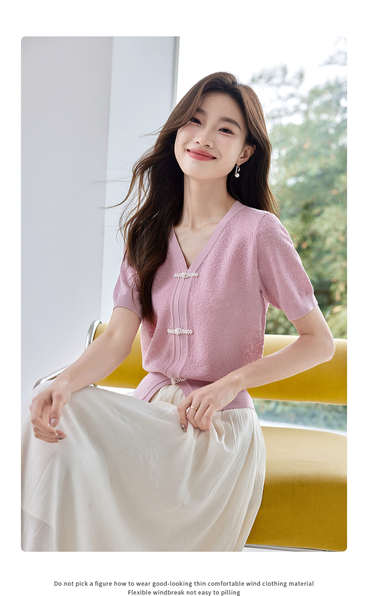 【专属特价】熙世界新中式盘扣V领冰丝针织衫夏季新款套头短袖国风上衣薄款