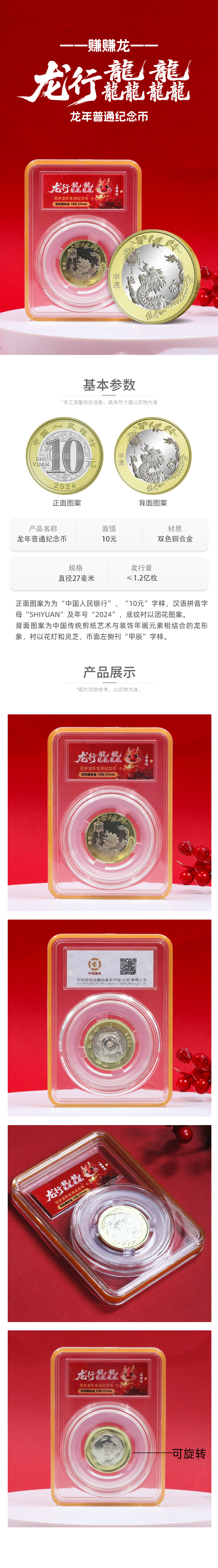 【流通币】2024龙行龘龘龙年纪念币封装版(可旋转)