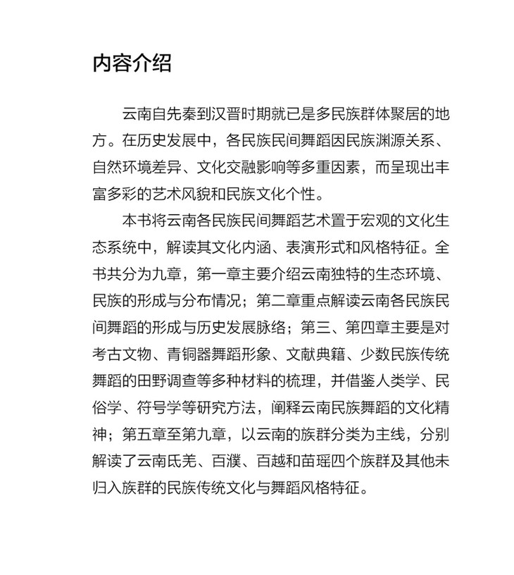 云南自先秦到汉晋时期就已是多民族群体聚居的地方。在历史发展中,各民族民间舞蹈因民族渊源关系、自然环境差异、文化交融影响等多重因素,呈现出丰富多彩的艺术风貌和民族文化个性。本书将云南各民族民间舞蹈艺术置于宏观的文化生态系统中,解读其文化内涵、表演形式和风格特征。全书共分为九章。第一章主要介绍云南独特的生态环境、民族的形成与分布情况。第二章重点解读云南各民族民间舞蹈的形成与历史发展脉络。第三、四章通过对考古文物、青铜器舞蹈形象、文献典籍、少数民族传统舞蹈的田野调查等多种材料的梳理,借鉴人类学、民俗学、符号学等研究方法,阐释云南民族舞蹈的文化精神。第五章至第九章,以云南的族群分类为主线,分别解读了云南氐羌、百濮、百越和苗瑶四个族群及其他未归入族群的民族传统文化与舞蹈风格特征。