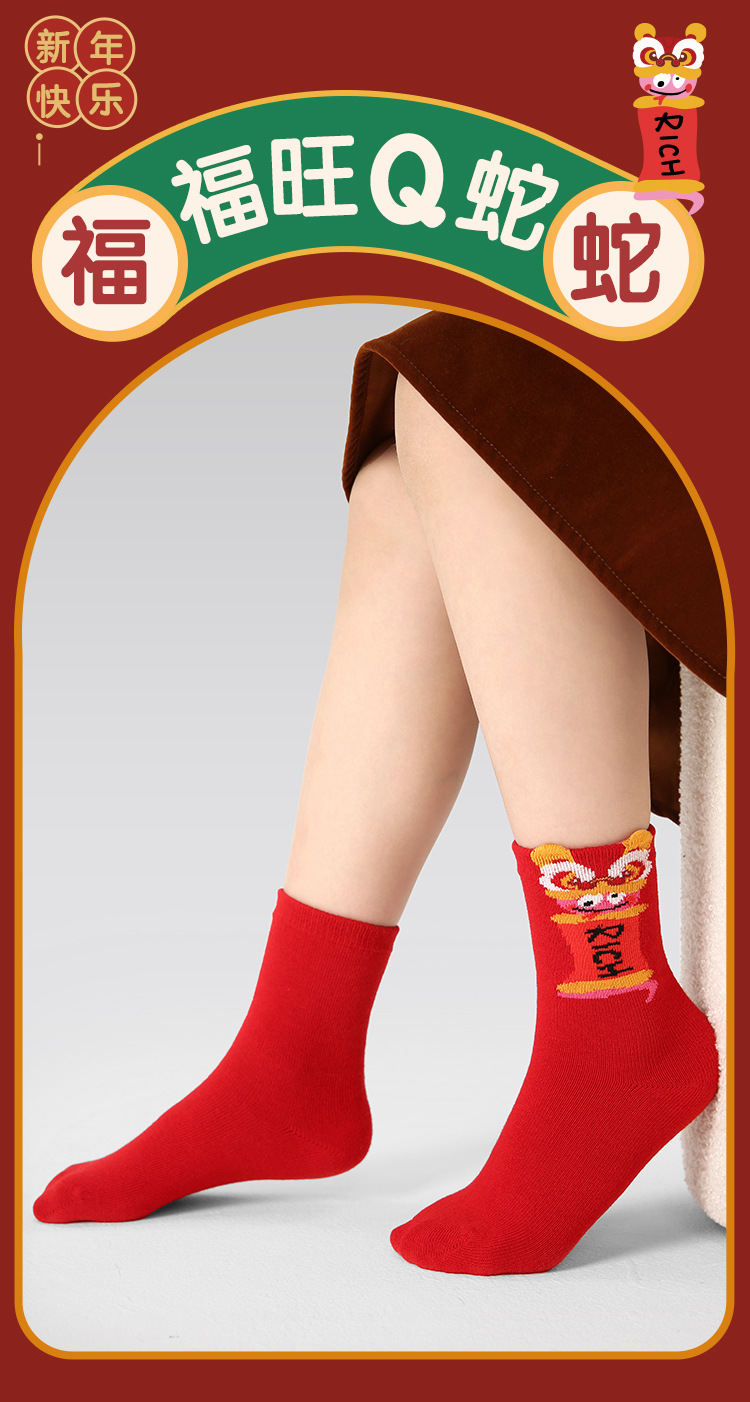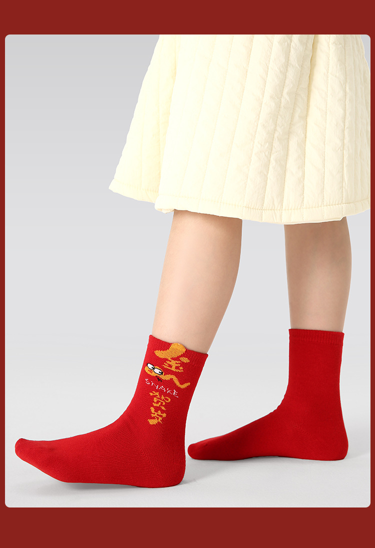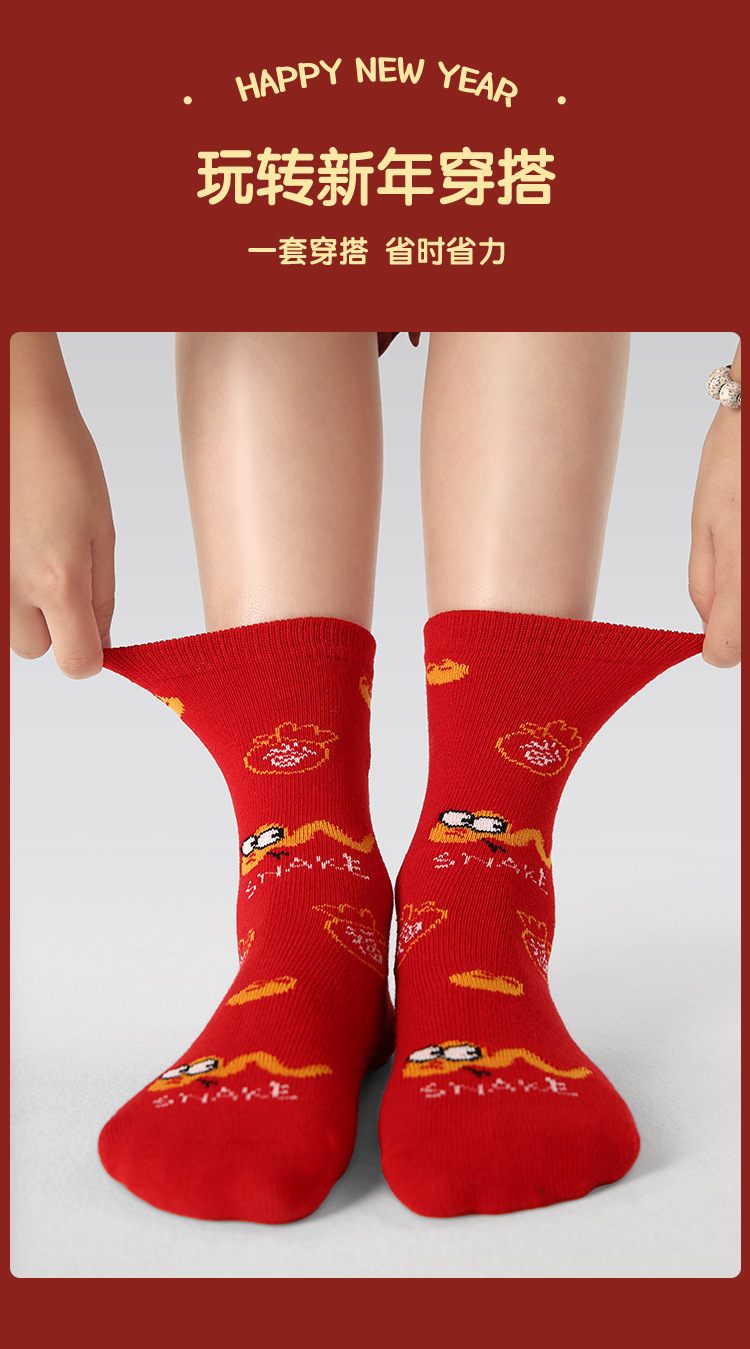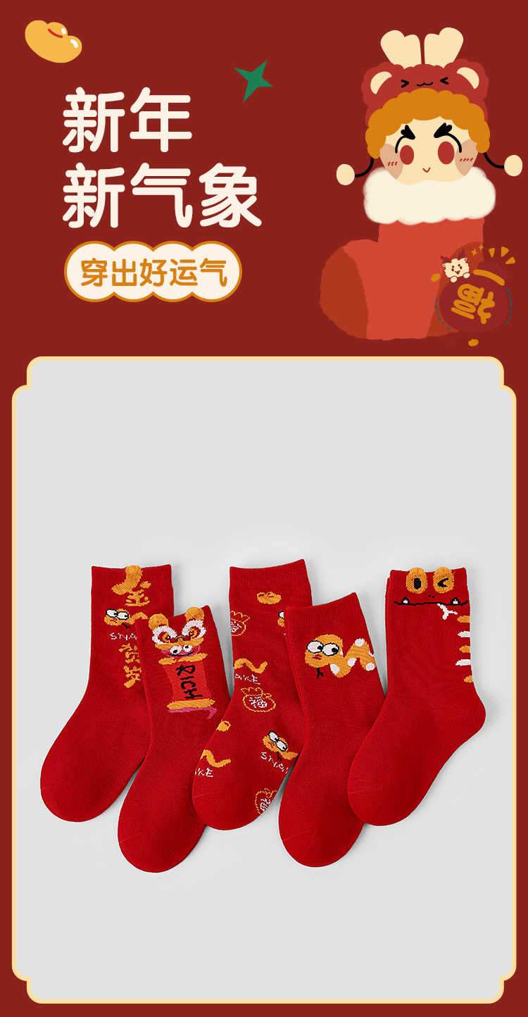 【醒粉福利24.9元5双】蛇年限定款红色新年棉袜 无骨男女童可爱精梳棉卡通袜