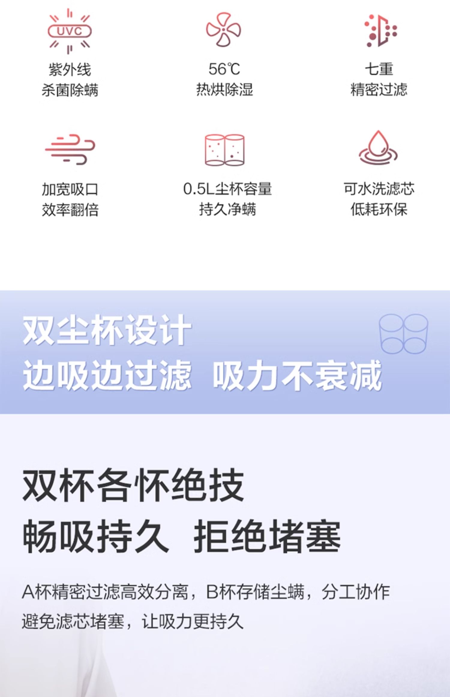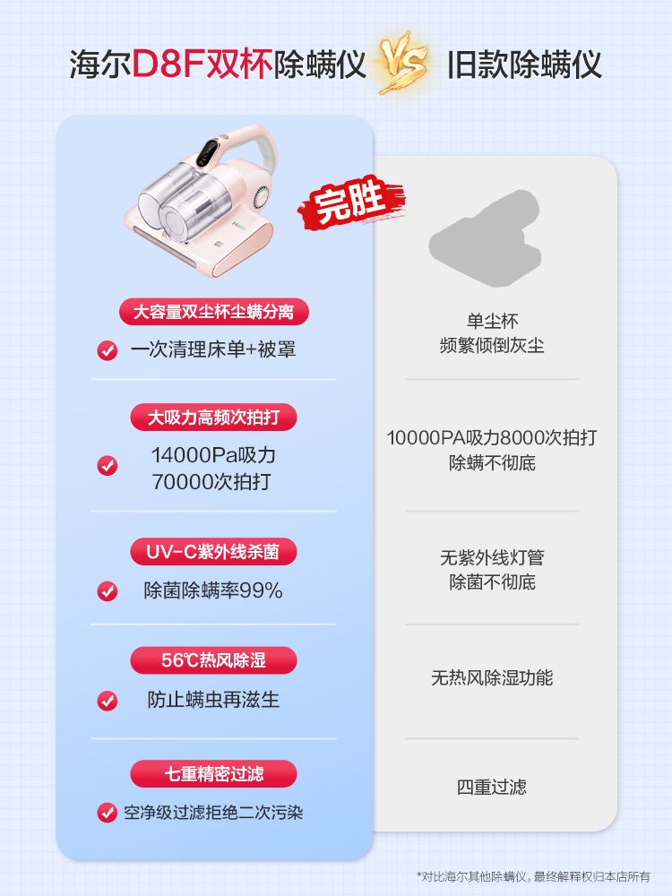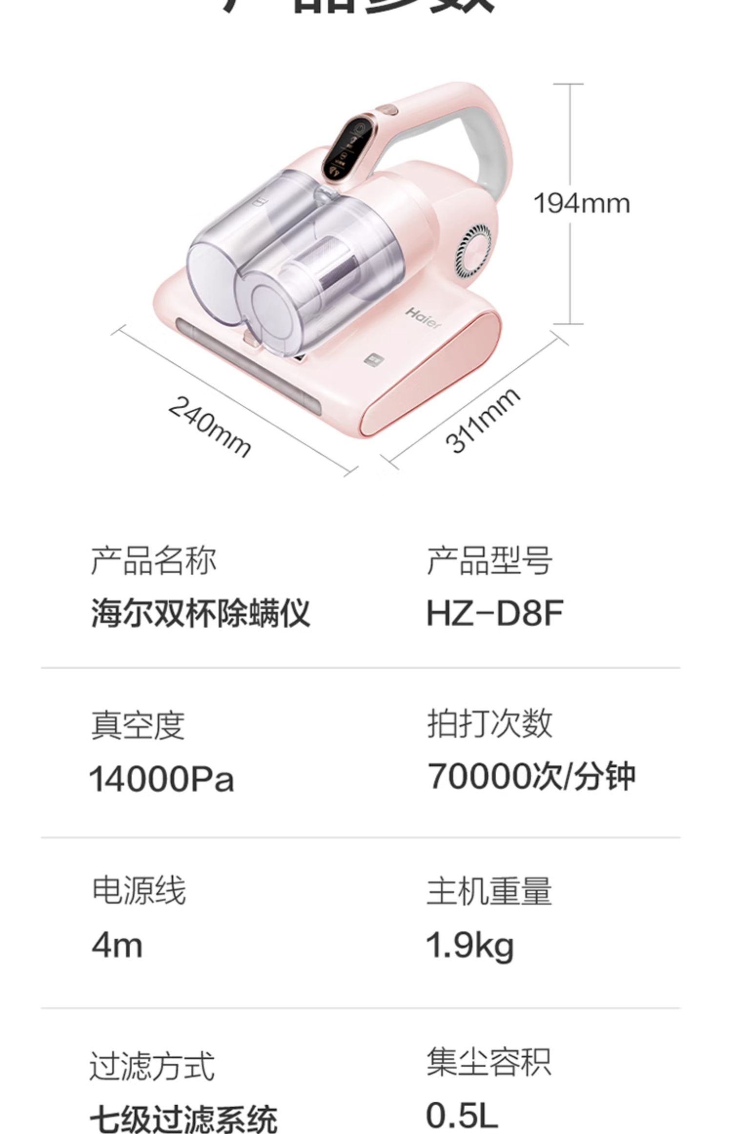 海尔大滚刷除螨仪双杯床上家用紫外线杀菌机除螨神器除螨虫HZ-D8F