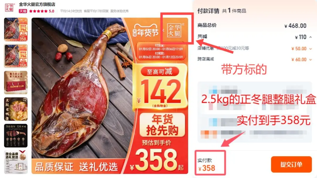 2.5kg火腿整腿礼盒(送200g金华土香肠一包),福利价¥388,满减后到手358元!