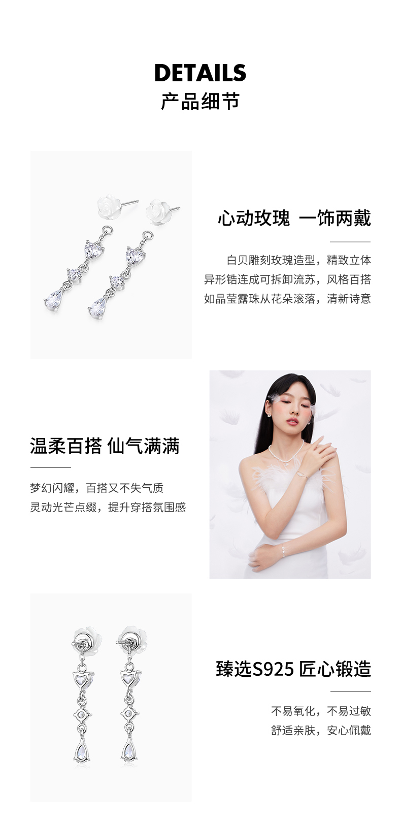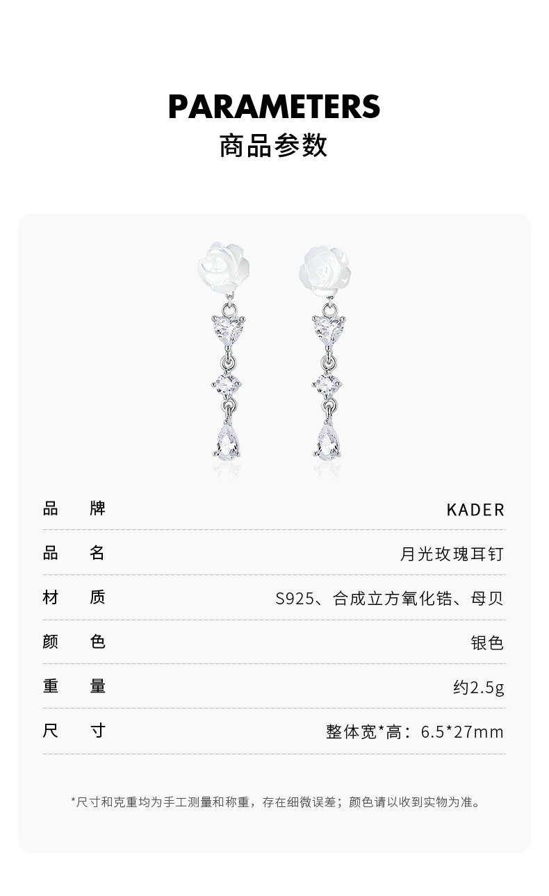 卡蒂罗/KADER 玫瑰物语系列 月光玫瑰耳钉 925银浪漫典雅一饰两戴流苏配饰 精致立体温柔复古耳饰 女友礼盒520