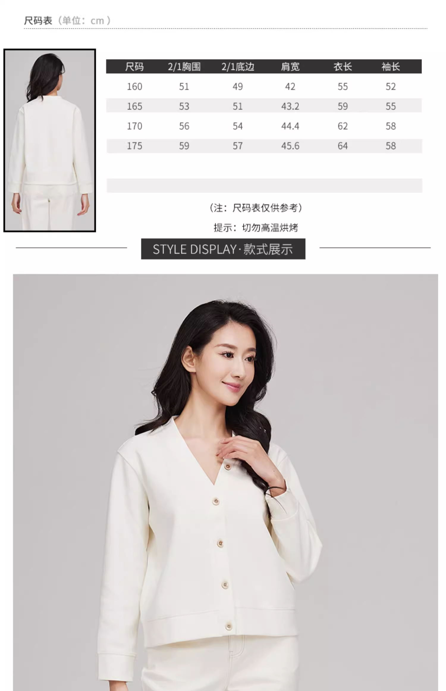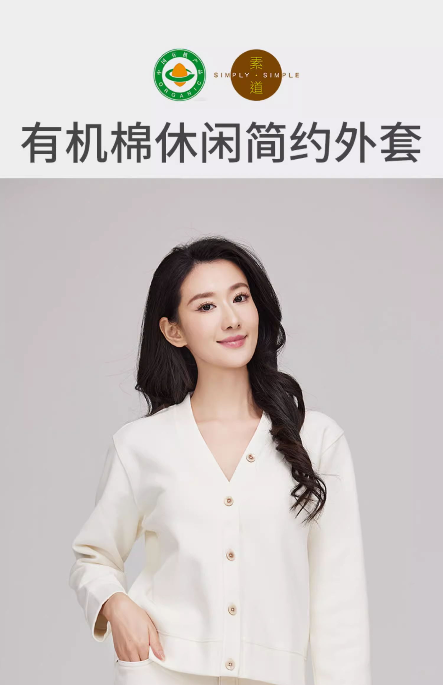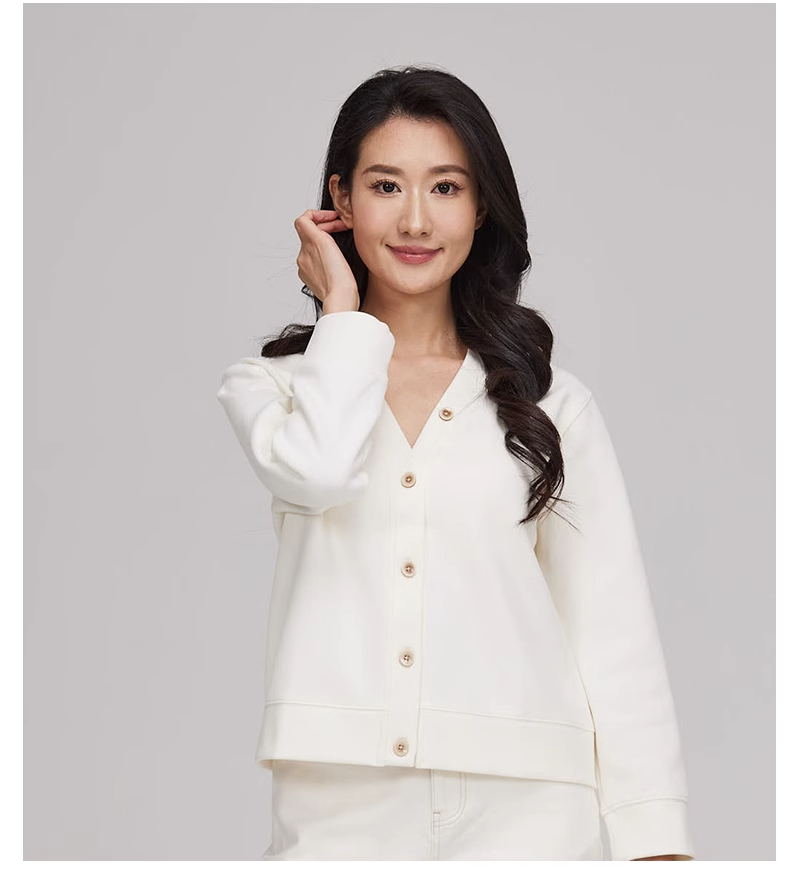 素道有机彩棉女士针织休闲简约外套:V领开衫设计,修饰脖颈线条,简单的宽松版型,穿着舒适时尚,随性且自由,白色干净清爽。产品卖点: