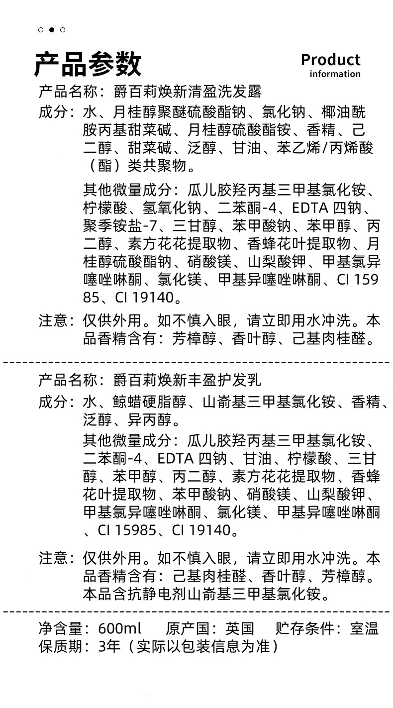英国进口爵百莉焕新清盈洗发露丨丰盈护发乳600ml